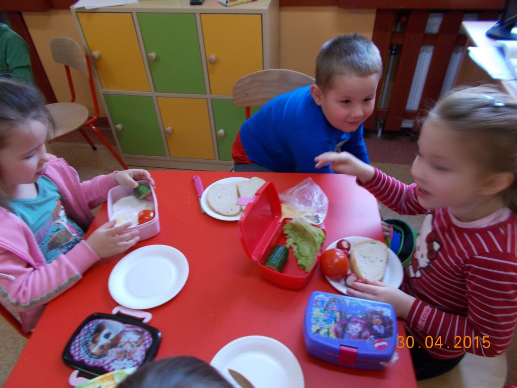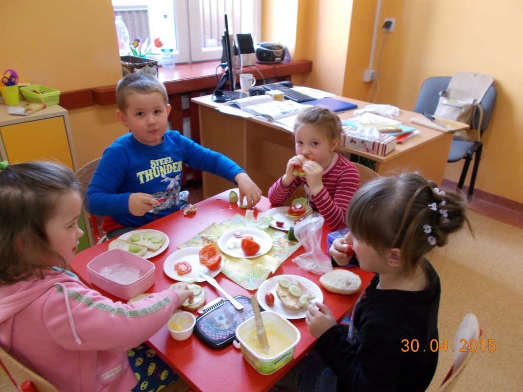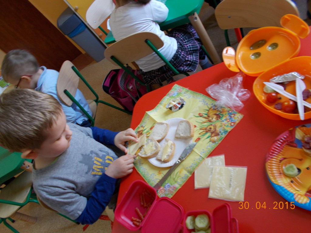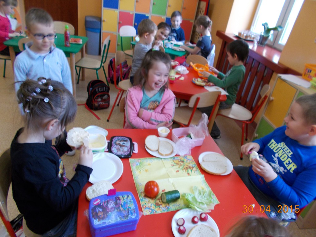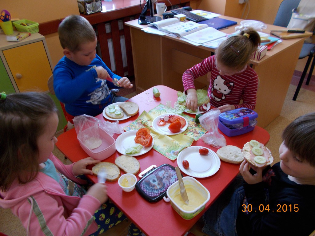 Samodzielnie przygotowane kanapki są najsmaczniejsze. Do takiego wniosku doszły dzieci z zerówki z grupy B w czwartek 30 kwietnie, kiedy po przypomnieniu zasad bezpieczeństwa i higieny podczas przygotowywanie posiłków, dzieci z zapałem zaczęły przygotowywać kanapki pełne witamin. Samodzielne przygotowanie śniadania sprawiło dzieciom wiele radości, ale najważniejszym punktem tego poranka było oczywiście zjedzenie kolorowych kanapek.