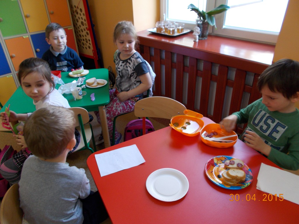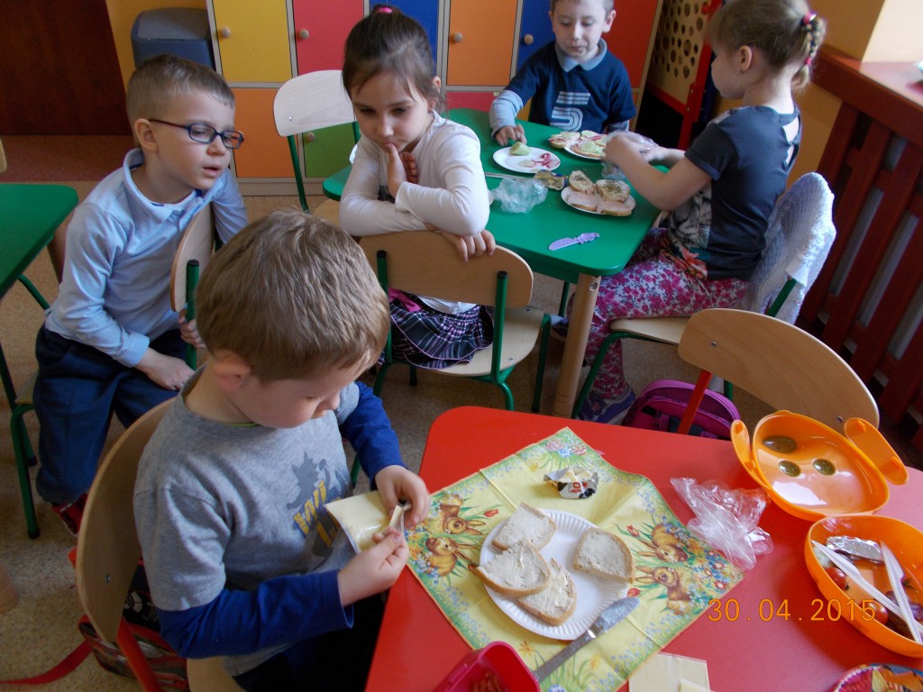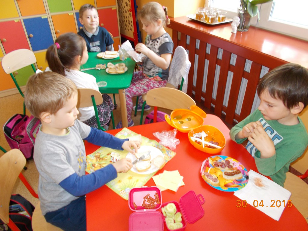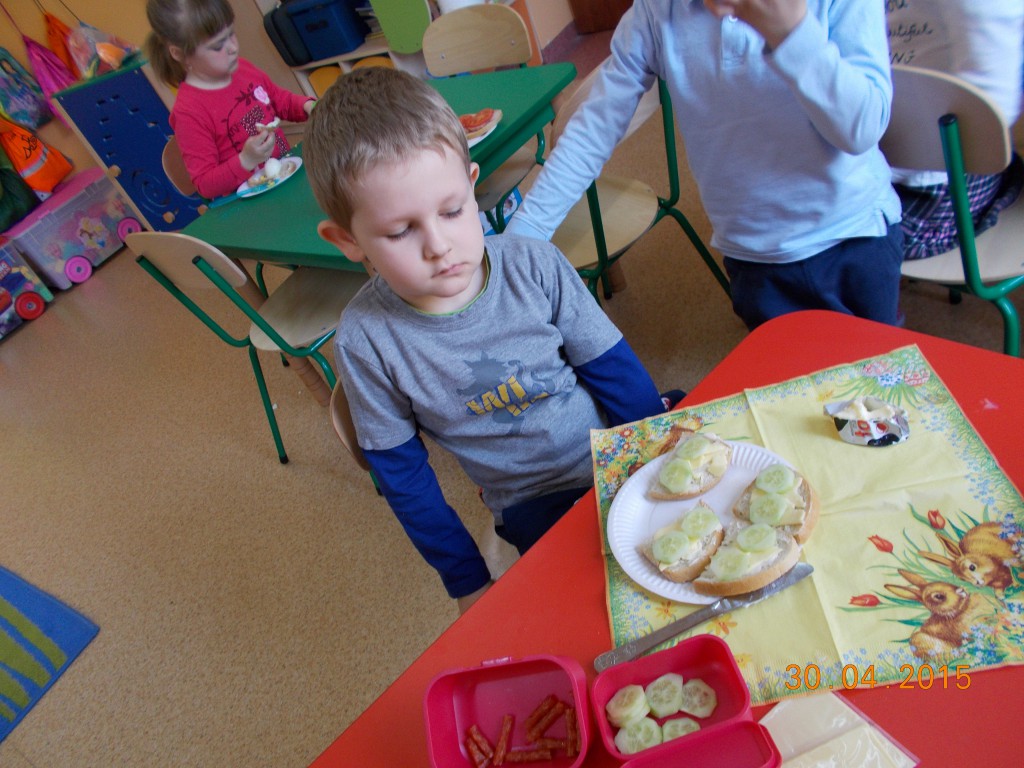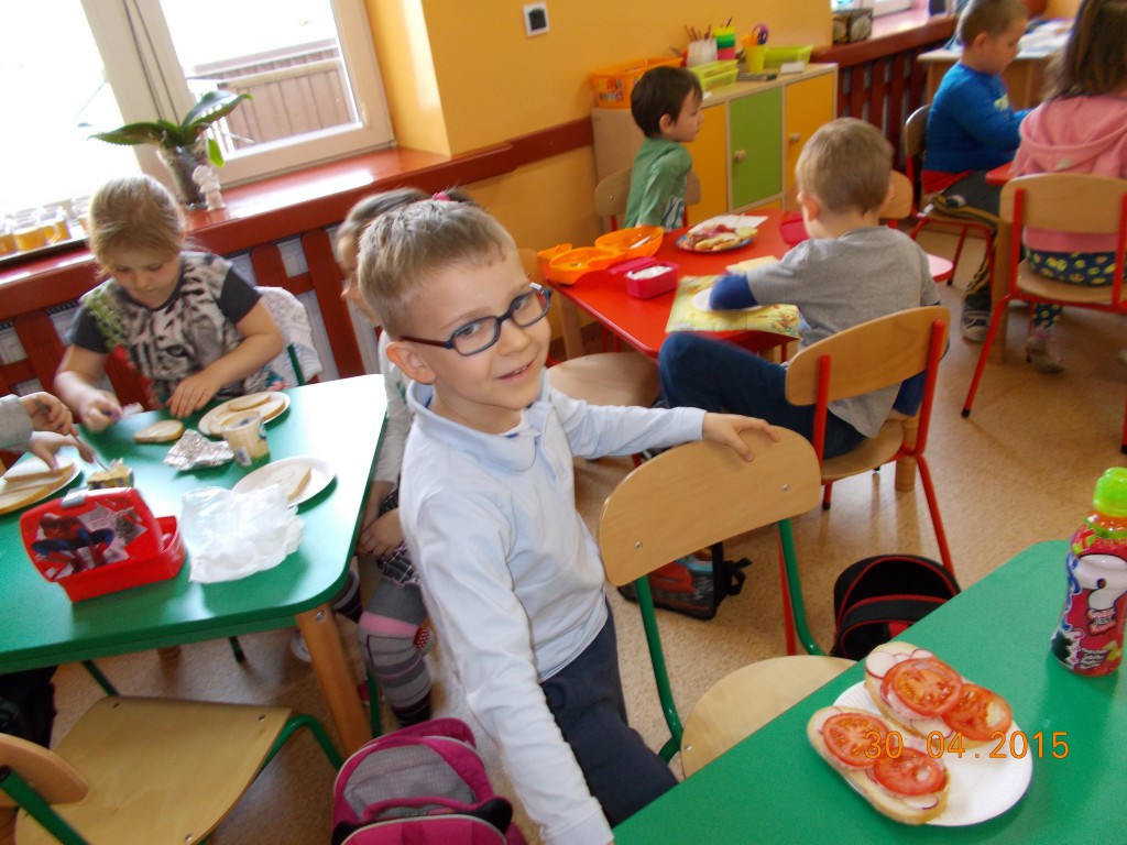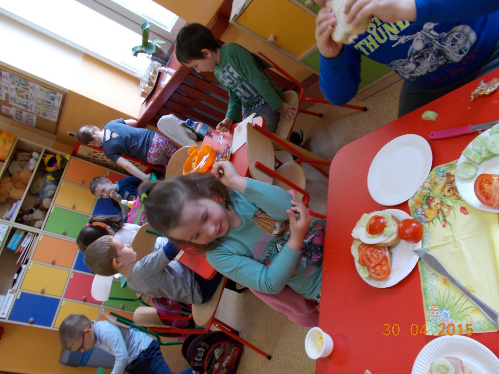 Samodzielnie przygotowane kanapki są najsmaczniejsze. Do takiego wniosku doszły dzieci z zerówki z grupy B w czwartek 30 kwietnie, kiedy po przypomnieniu zasad bezpieczeństwa i higieny podczas przygotowywanie posiłków, dzieci z zapałem zaczęły przygotowywać kanapki pełne witamin. Samodzielne przygotowanie śniadania sprawiło dzieciom wiele radości, ale najważniejszym punktem tego poranka było oczywiście zjedzenie kolorowych kanapek.