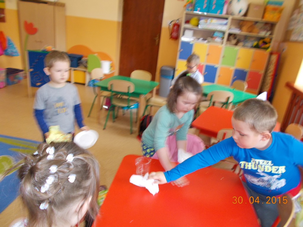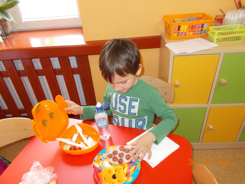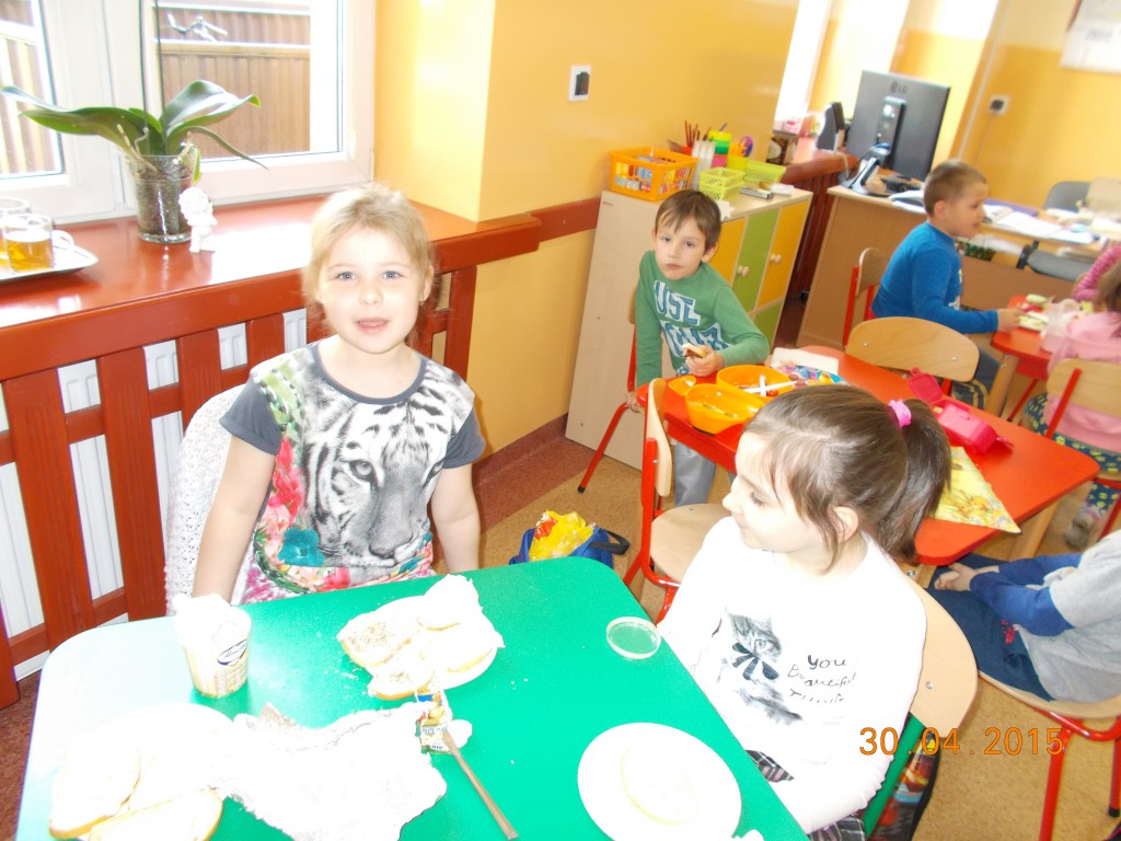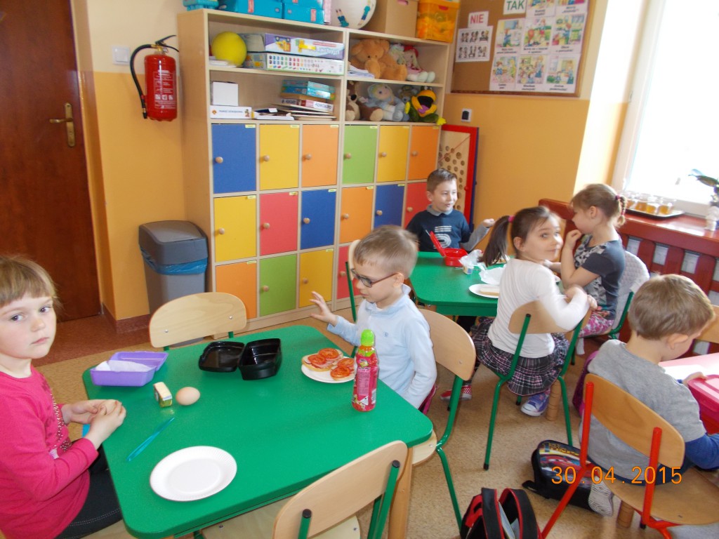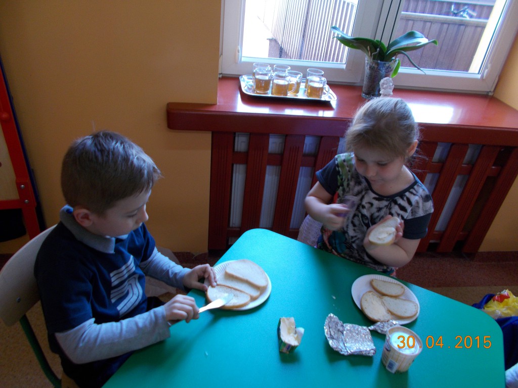 Samodzielnie przygotowane kanapki są najsmaczniejsze. Do takiego wniosku doszły dzieci z zerówki z grupy B w czwartek 30 kwietnie, kiedy po przypomnieniu zasad bezpieczeństwa i higieny podczas przygotowywanie posiłków, dzieci z zapałem zaczęły przygotowywać kanapki pełne witamin. Samodzielne przygotowanie śniadania sprawiło dzieciom wiele radości, ale najważniejszym punktem tego poranka było oczywiście zjedzenie kolorowych kanapek.