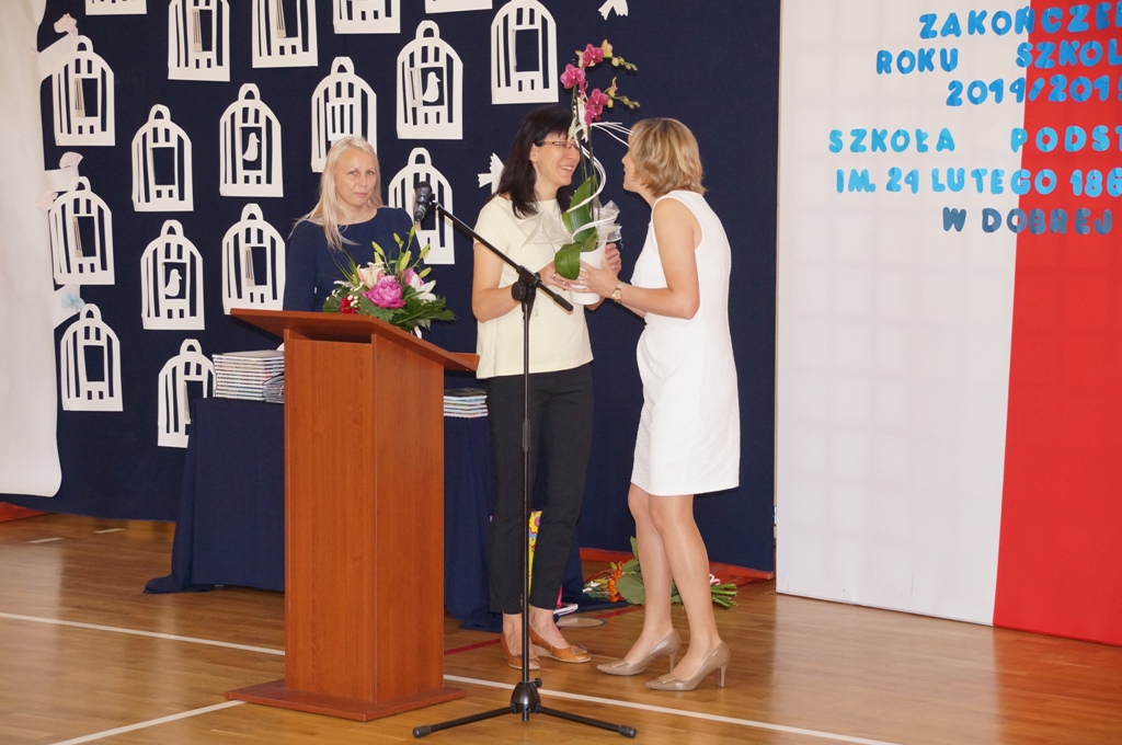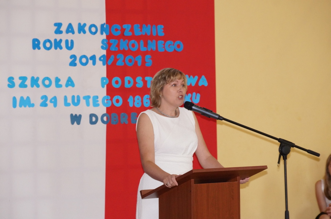 Pani Dyrektor Małgorzata Wielgus podziękowała wszystkim uczniom i nauczycielom za sumienną, całoroczną pracę. W swoim przemówieniu przypomniała liczne sukcesy, jakie odnieśli uczniowie na przestrzeni ostatnich miesięcy w konkursach i zawodach sportowych. Uhonorowała też najlepszych uczniów nagrodami oraz świadectwami z wyróżnieniem. Nagrody otrzymali także najlepsi sportowcy naszej szkoły. Pani Dyrektor życzyła wszystkim udanego, wakacyjnego wypoczynku.