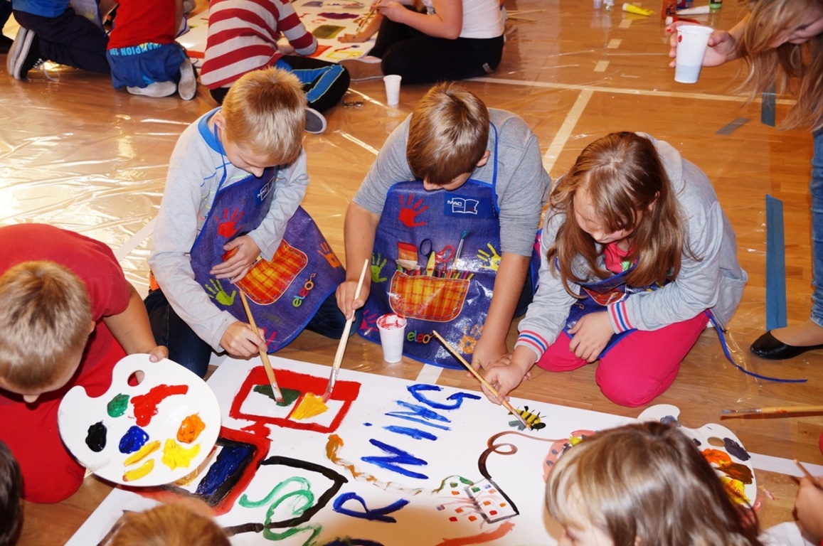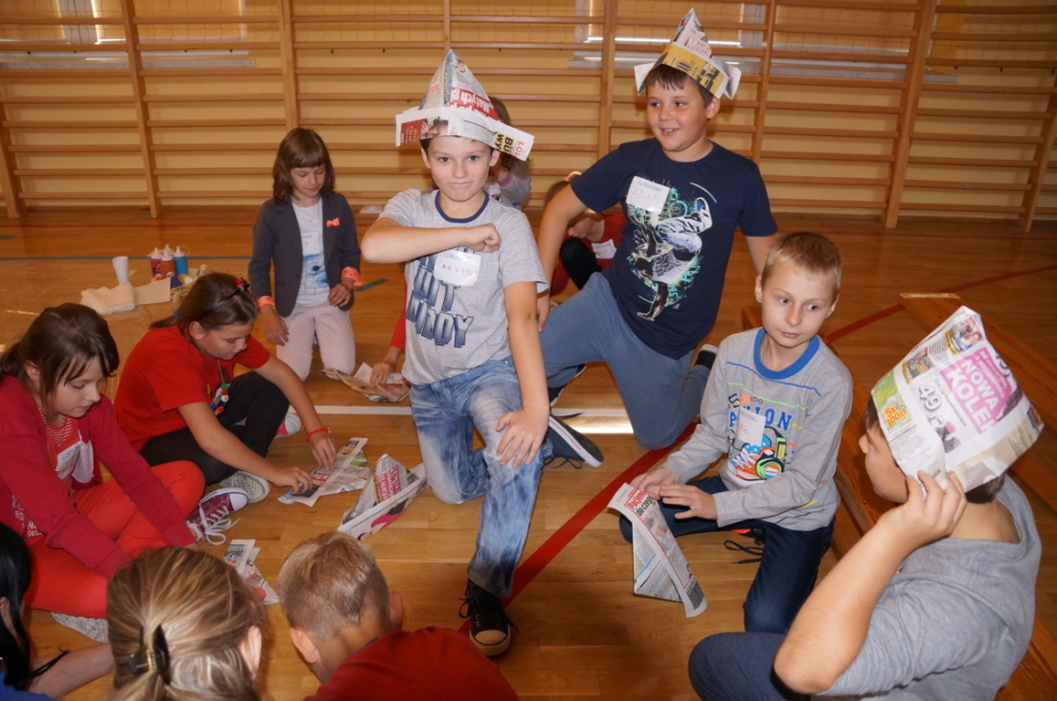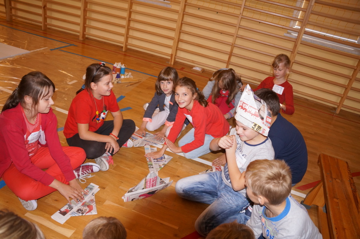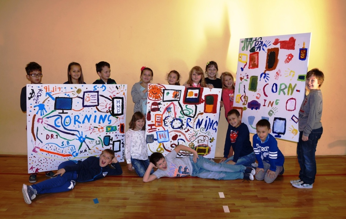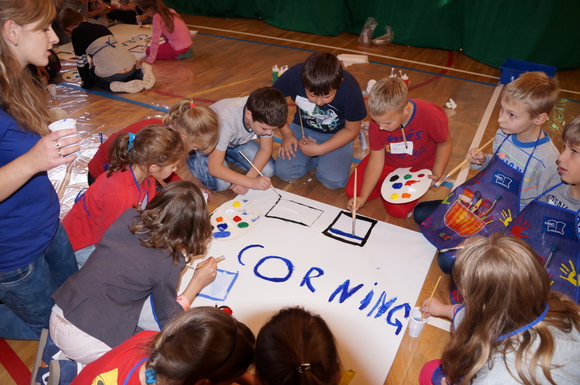 Jako wyraz wdzięczności dzieciaki wręczyły malarzom papierowe czapki chroniące głowy przed farbą, potem zaś wykonały prace plastyczne na temat tego, czym zajmuje się firma Corning.