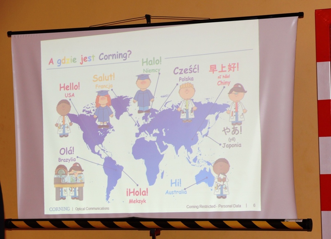 Uczniowie klas IV a i IV b - czyli przyszli inżynierowie - mogli poznać działalność i wybrane produkty CORNING OPTICAL COMMUNICATIOS. Dowiedzieli się, jak działa świecące włókno, oglądali je pod mikroskopem i porównywali z owadami. Planowali i budowali prostą instalację światłowodową dla domu mieszkalnego. Dzieci usłyszały ciekawostki o krajach, w których Firma Corning ma swoje przedstawicielstwa, a na zakończenie otrzymały ciekawe upominki.