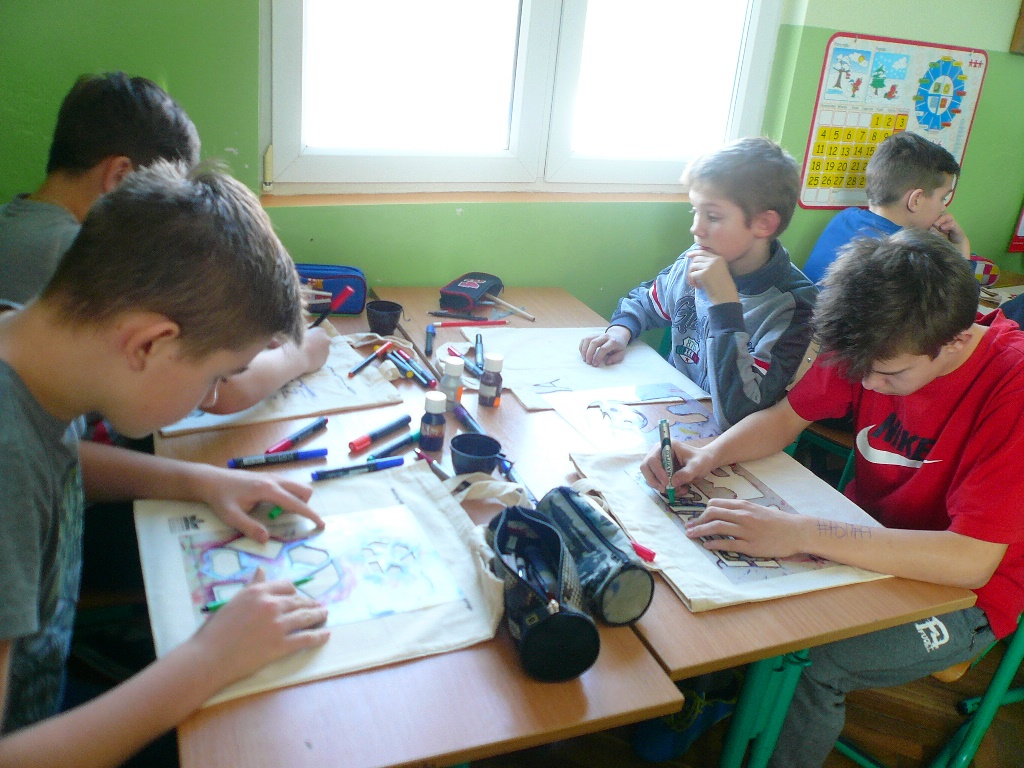 Na zakończenie uczniowie ozdabiali torby wykonane z ekologicznych materiałów, które będą przez nich wykorzystywane do pakowania produktów zakupionych w sklepach.