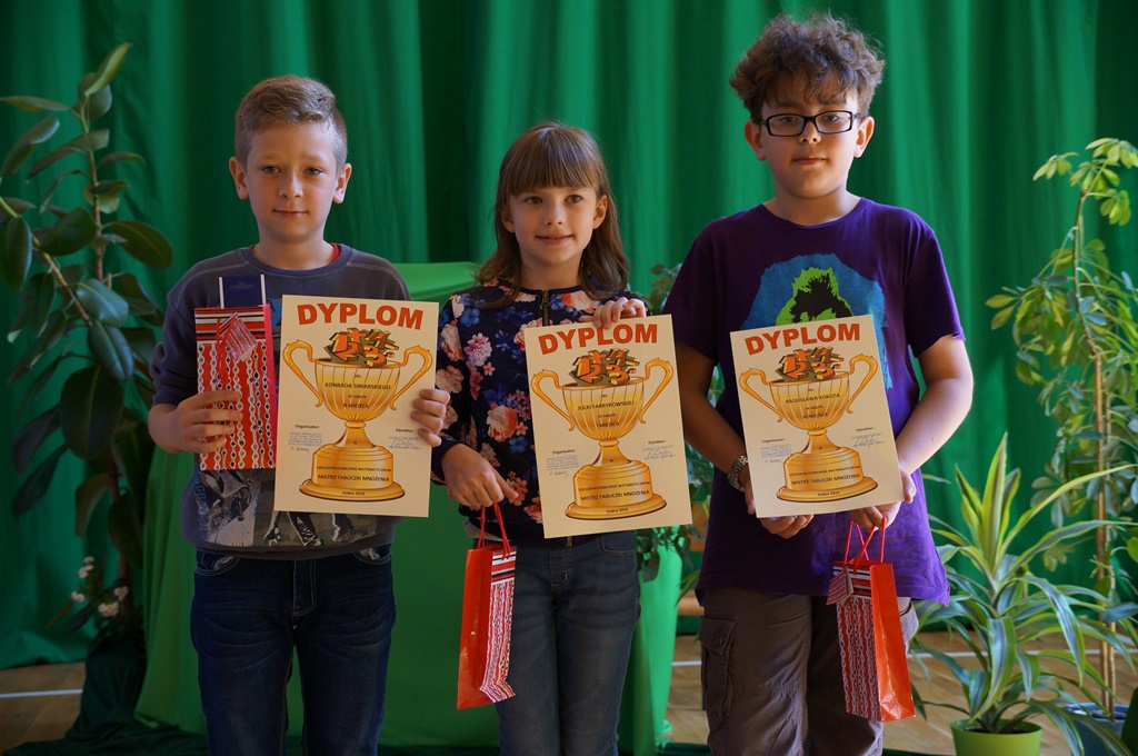 W dniu 10.05.2015 r. w Szkole Podstawowej w Dobrej ogłoszono wyniki szkolnego konkursu matematycznego dla klas IV - ,,Mistrz tabliczki mnożenia". I miejsce, a tym samym tytuł Mistrza, otrzymała Julia Fabrykowska z kl. IVb. Kolejne miejsca na podium zajęli: Konrad Siniarski kl. IVa oraz Radosław Kokot kl. IVa. Uczniowie biorący udział w konkursie mieli do wykonania, na czas, szereg zadań sprawdzających ich znajomość tabliczki mnożenia. Były to m.in.: labirynty matematyczne, kolorowanki liczbowe, zadania tekstowe, puzzle itp. Emocji i wrażeń nie brakowało. Zwycięzcom gratulujemy, a uczestnikom dziękujemy za udział. Wszystkim życzymy jeszcze wielu sukcesów, nie tylko z matematyki, ale także w innych dziedzinach.