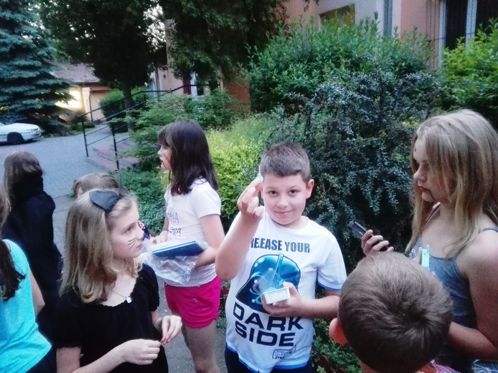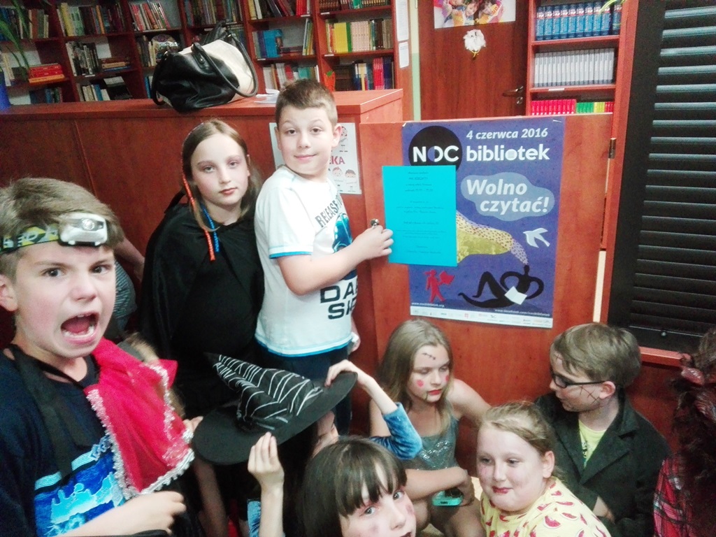 Na początku okazało się, że zaginął klucz do drzwi biblioteki. Pełna emocji gra terenowa z wykorzystaniem książek zakończyła się sukcesem - zguba została odnaleziona. Kiedy wszyscy znaleźli się w sali bibliotecznej i wygodnie ulokowali się na materacach, przy blasku świec rozpoczęto czytanie. Pierwsze mroczne opowiadanie wprowadziło nieco nastroju grozy, jednak wśród przyjaciół łatwo było pokonać lęk. Chłopcy rozśmieszali dziewczyny i śmiechy rozbrzmiewały dość często. Wspólna kolacja, a zwłaszcza pyszna herbatka, pokrzepiły dzieci tak, że wszystkie chętnie rozwiązywały literackie zagadki. Potem nastąpił dalszy ciąg czytania, słuchania, straszenia i … wzajemnego rozśmieszania. Rodzice, którzy przybyli po swoje dzieci, zastali je w świetnych humorach. Przy pożegnaniach już obiecywano sobie kolejne spotkanie w bibliotece i wspólne czytanie. Pamiątkowe zakładki do książek będą przypominać czerwcową Noc Bibliotek i zachęcać do spotkań z literaturą.