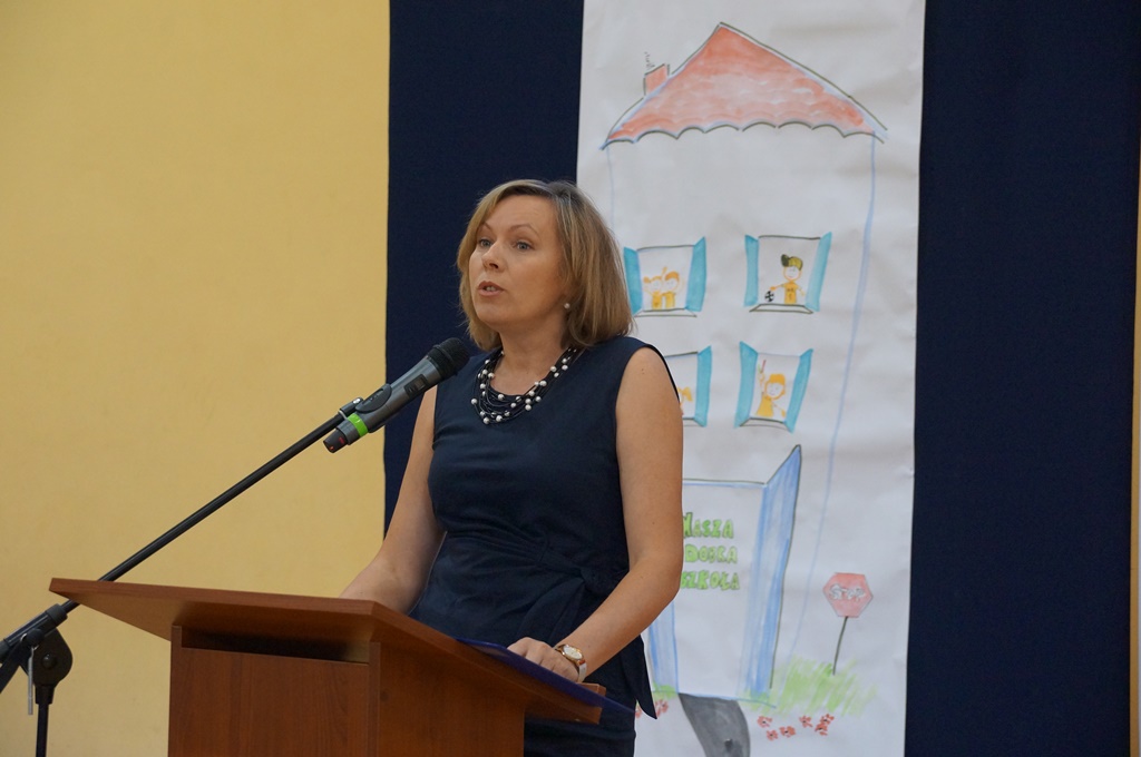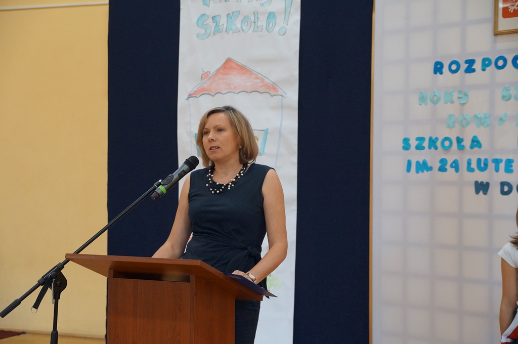 Następnie uczniowie wraz z rodzicami udali się do szkoły, gdzie serdecznie zostali przywitani przez panią dyrektor Małgorzatę Wielgus.