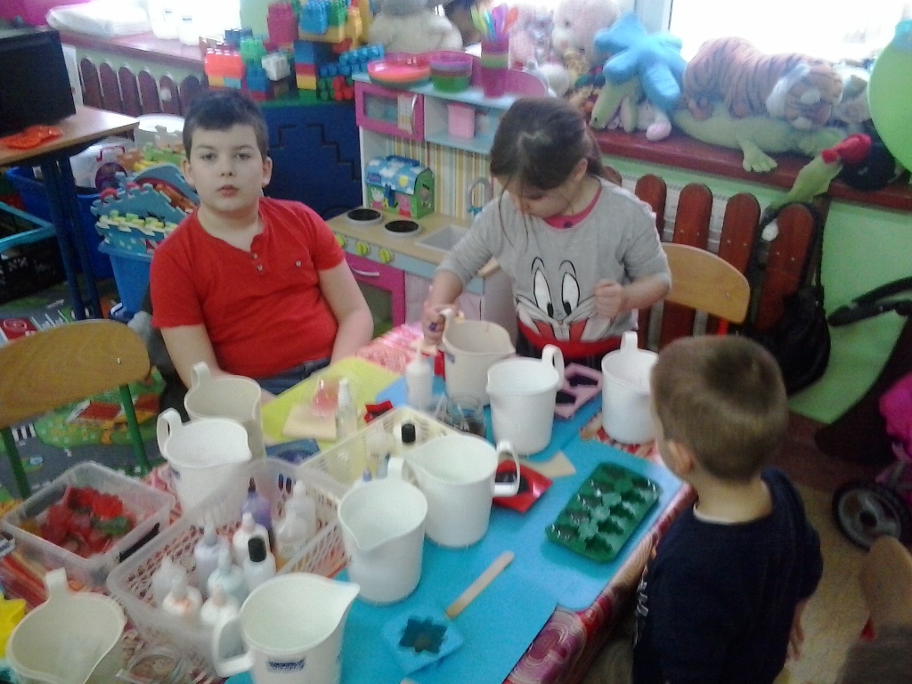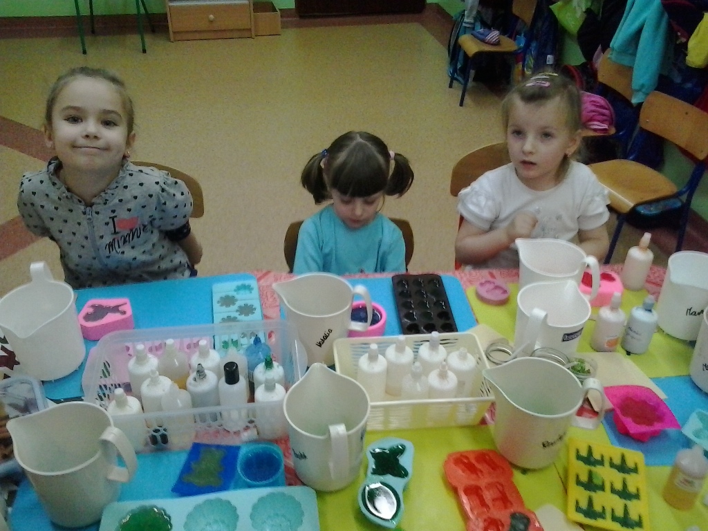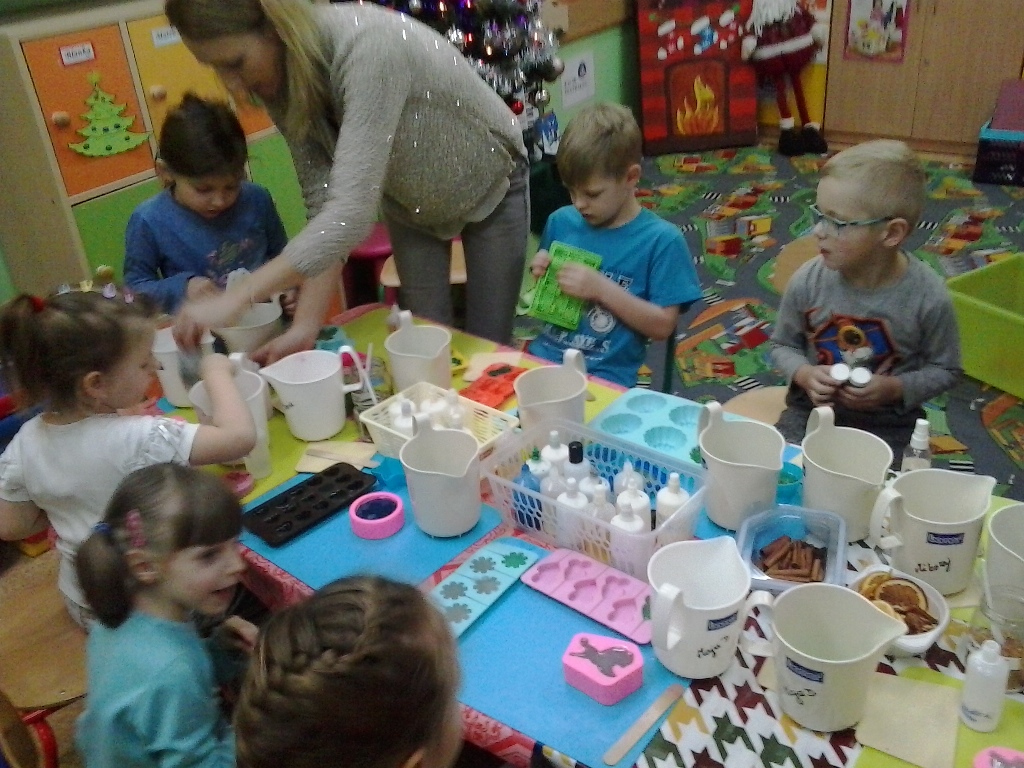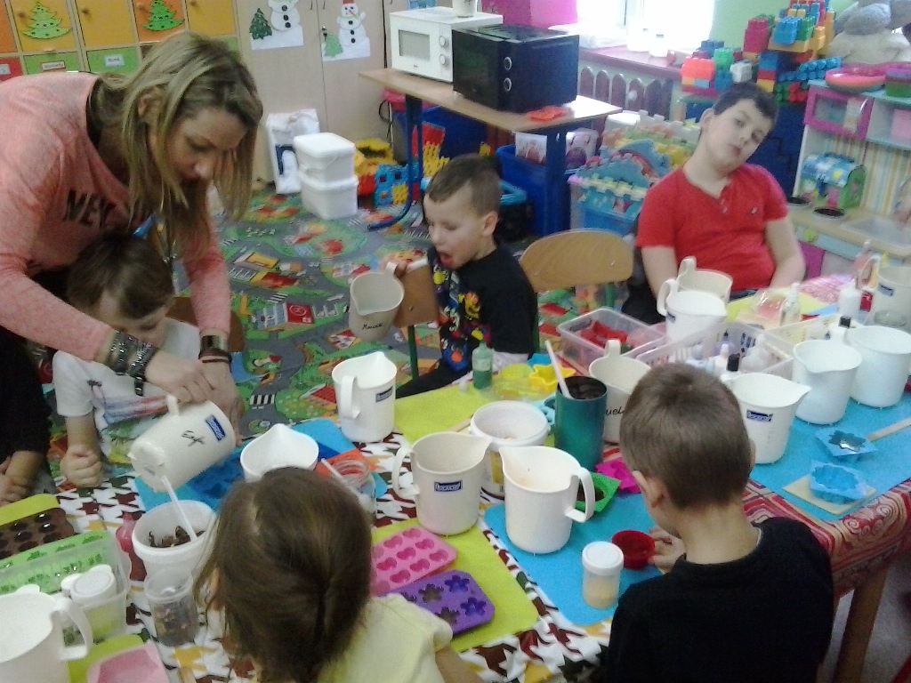 W dniu 4 stycznia 2017 roku w Oddziale Przedszkolnym odbyły się warsztaty, w czasie których dzieci wykonywały naturalne mydełka. Przedszkolaki do gliceryny dodawały swoje ulubione zapachy, barwniki oraz różnorodne dodatki: brokat, ziarenka kawy, przyprawy, płatki kwiatów. Następnie wybierały foremki, które nadawały kształt ich pracom. Efekt pracy przeszedł najśmielsze oczekiwania i wywołał uśmiech na buziach maluchów. Te piękne, pachnące, wykonane własnoręcznie wyroby będą stanowić podarunki dla babci i dziadka.