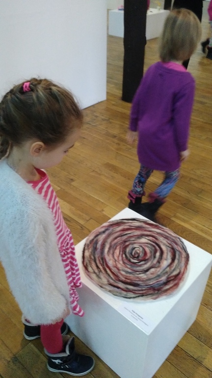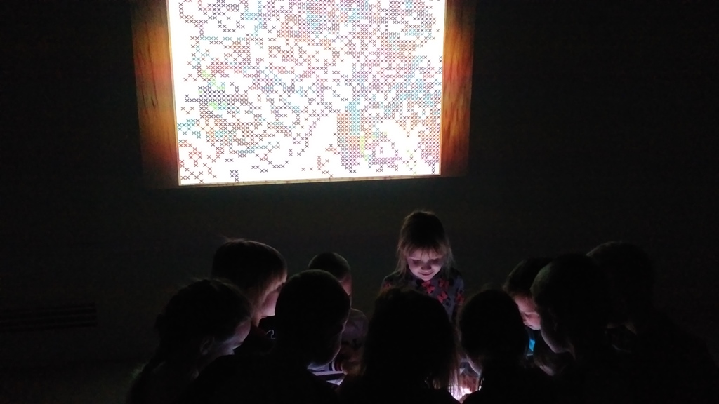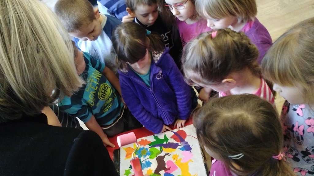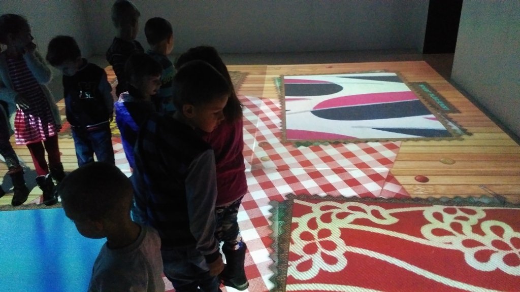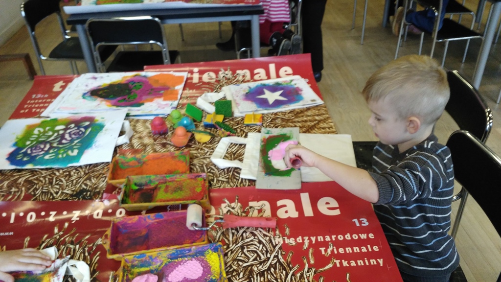 Przedszkolaki zwiedzały muzeum, oglądały zbiory prezentowane w ramach wystaw stałych i czasowych. Podczas warsztatów pani przewodnik przybliżała zarówno tradycyjne techniki związane z tworzeniem i zdobieniem wyrobów tekstylnych (np. tkanie splotem prostym, druk stemplowy i szablonowy, haft oraz aplikację), jak również działania związane z tworzeniem tzw. tkaniny eksperymentalnej.
