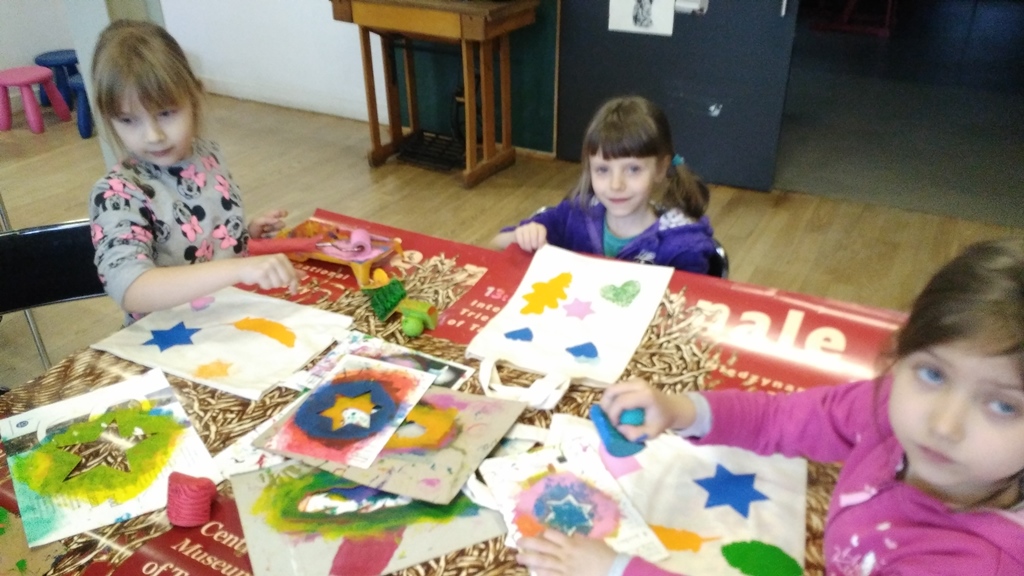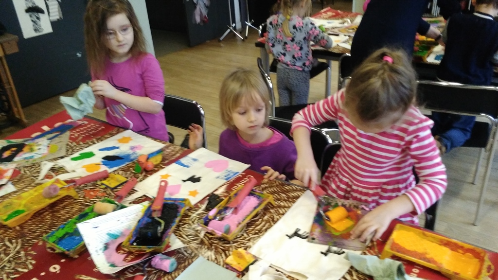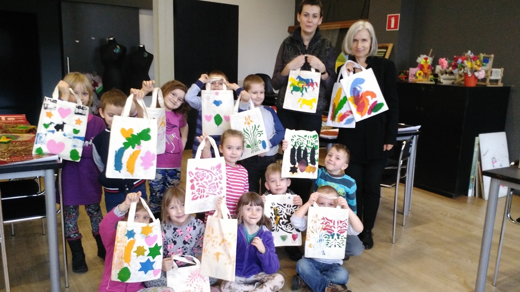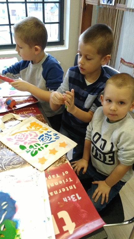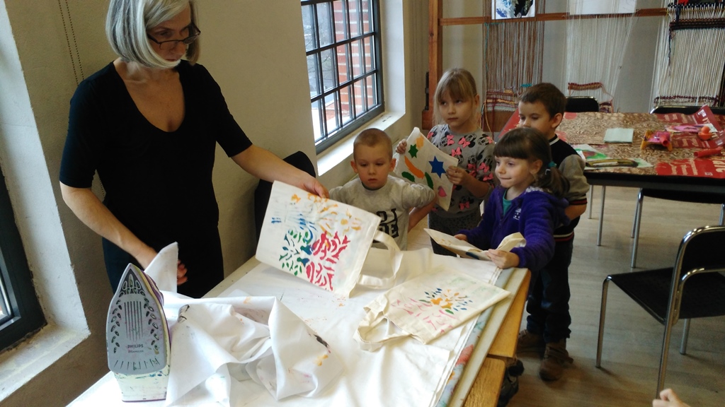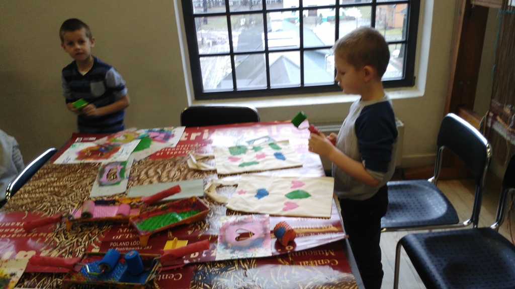 Dzieci wzięły udział w warsztatach druku na bawełnianej torbie. Stworzone dzieła pozostały własnością autorów i miłą pamiątką z pobytu w muzeum.