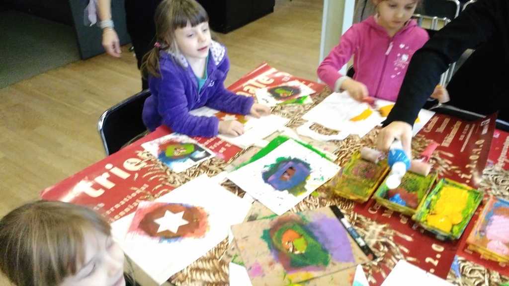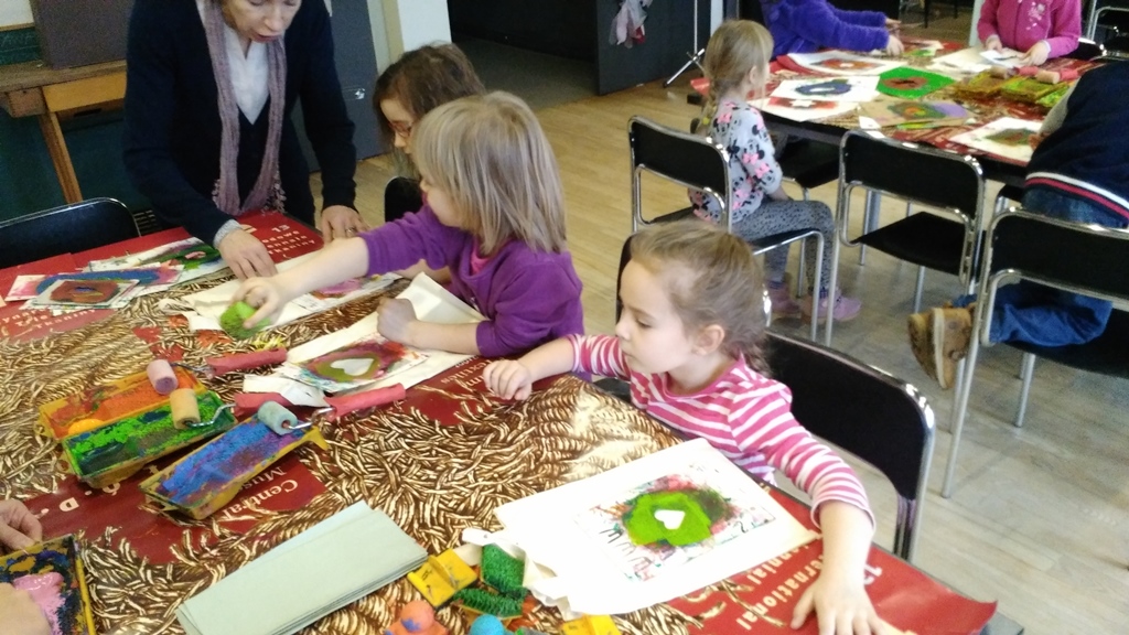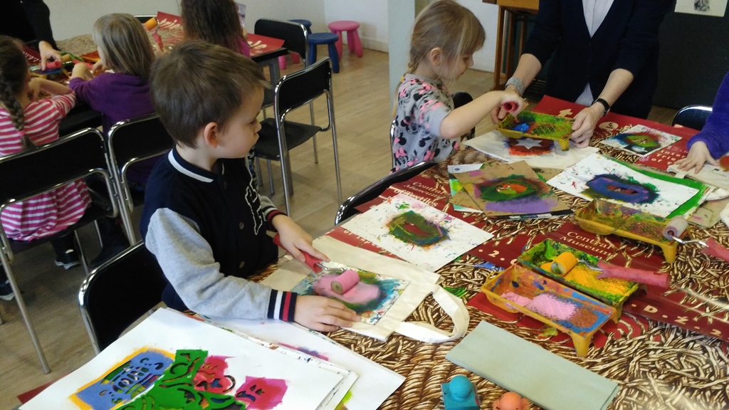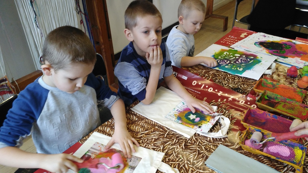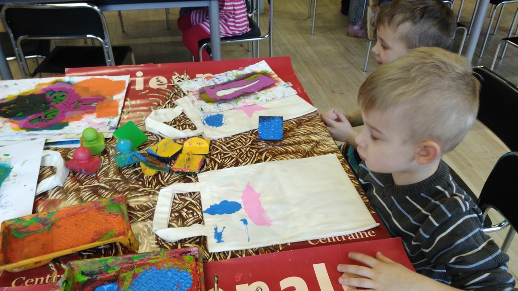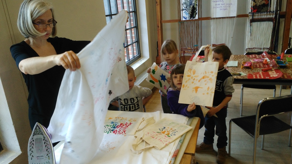 Dzieci wzięły udział w warsztatach druku na bawełnianej torbie. Stworzone dzieła pozostały własnością autorów i miłą pamiątką z pobytu w muzeum.
