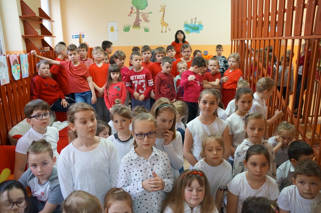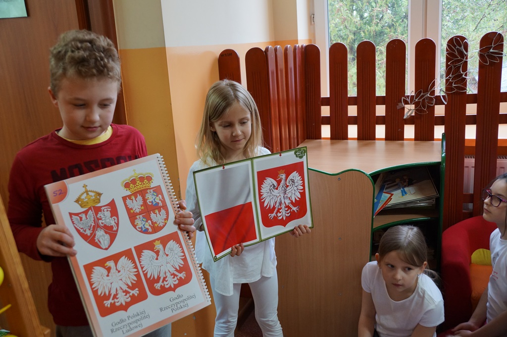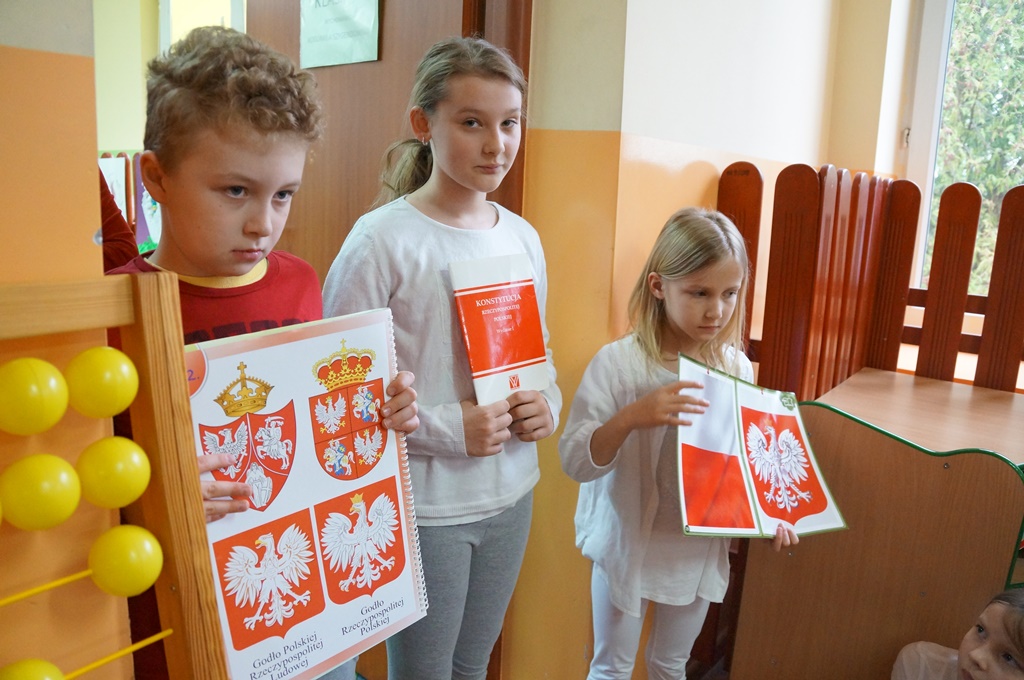 W dniu 28 kwietnia 2017 roku uczniowie z kl. I -III podczas wspólnego spotkania poznali bardzo ważne dla Polaków wydarzenia historyczne związane z Rocznicą Uchwalenia Konstytucji 3 Maja. Dzieci ubrane w biało-czerwone barwy z zadumą i powagą omówiły polskie symbole narodowe oraz odśpiewały hymn państwowy. Nie zabrakło również słów potwierdzających, jak bardzo dumni jesteśmy ze swojego kraju oraz z naszego patriotyzmu. Wykonano także wspólną fotografię, na której wszyscy uczniowie utworzyli flagę Polski; barwy biało-czerwone potwierdzają polskość i umiłowanie do naszej, kochanej ojczyzny.