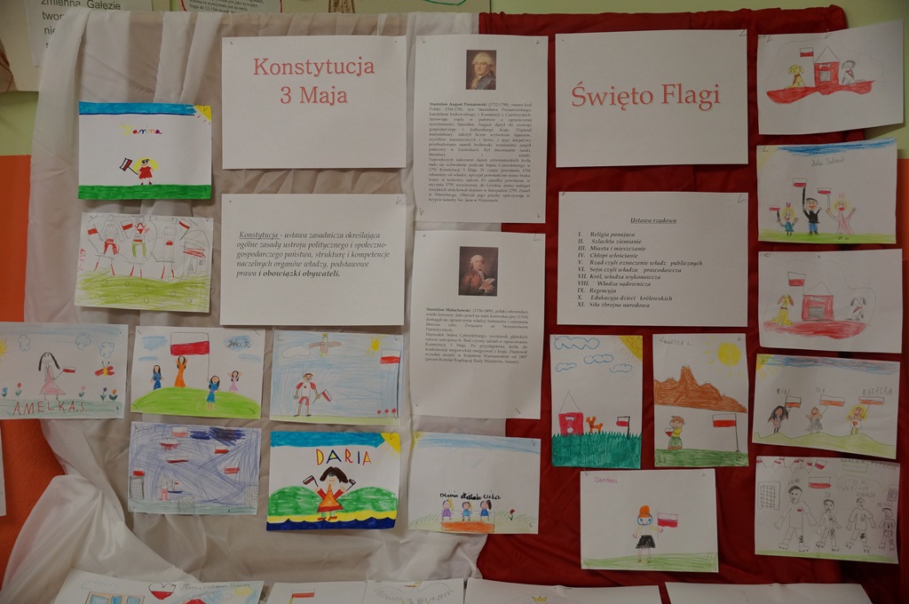 Z okazji majowych świąt została utworzona w naszej szkole również wystawka książek patriotycznych oraz wystawa prac plastycznych dzieci, których tematem było umiłowanie do naszej ojczyzny.