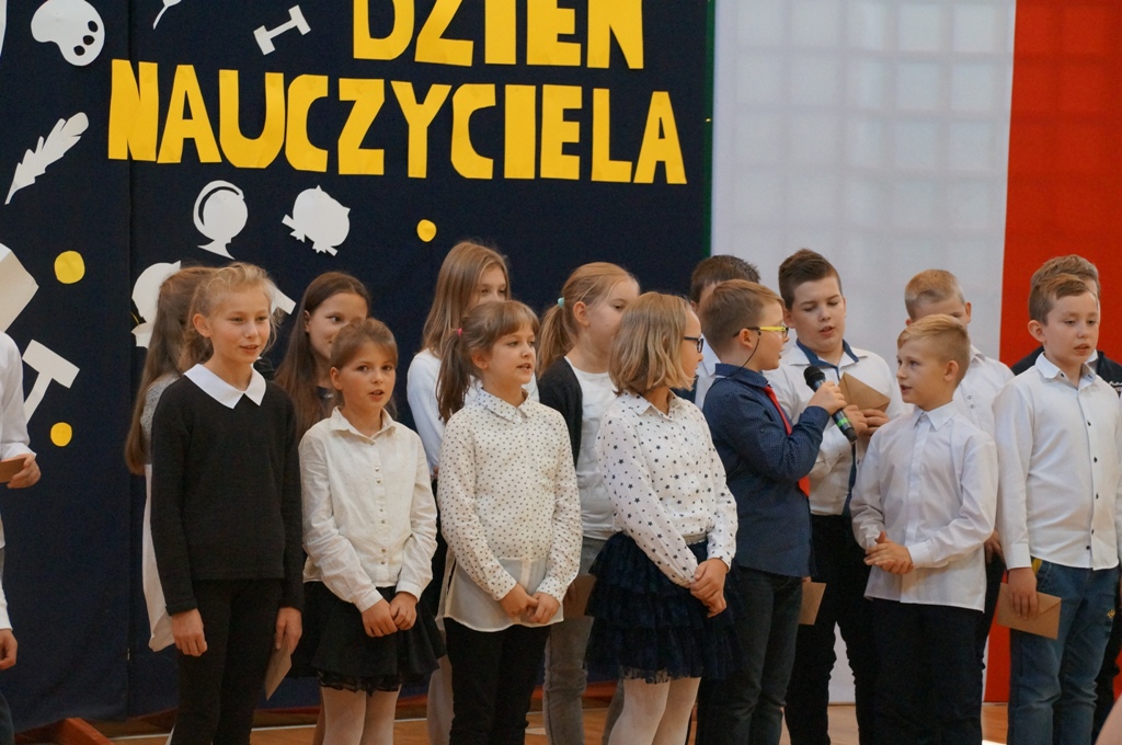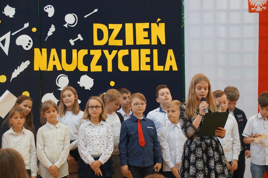 Następnie czwartoklasiści zaprezentowali wesołe wierszyki zadedykowane wszystkim nauczycielom i zaśpiewali piosenkę, składając w ten sposób serdecznie podziękowania
