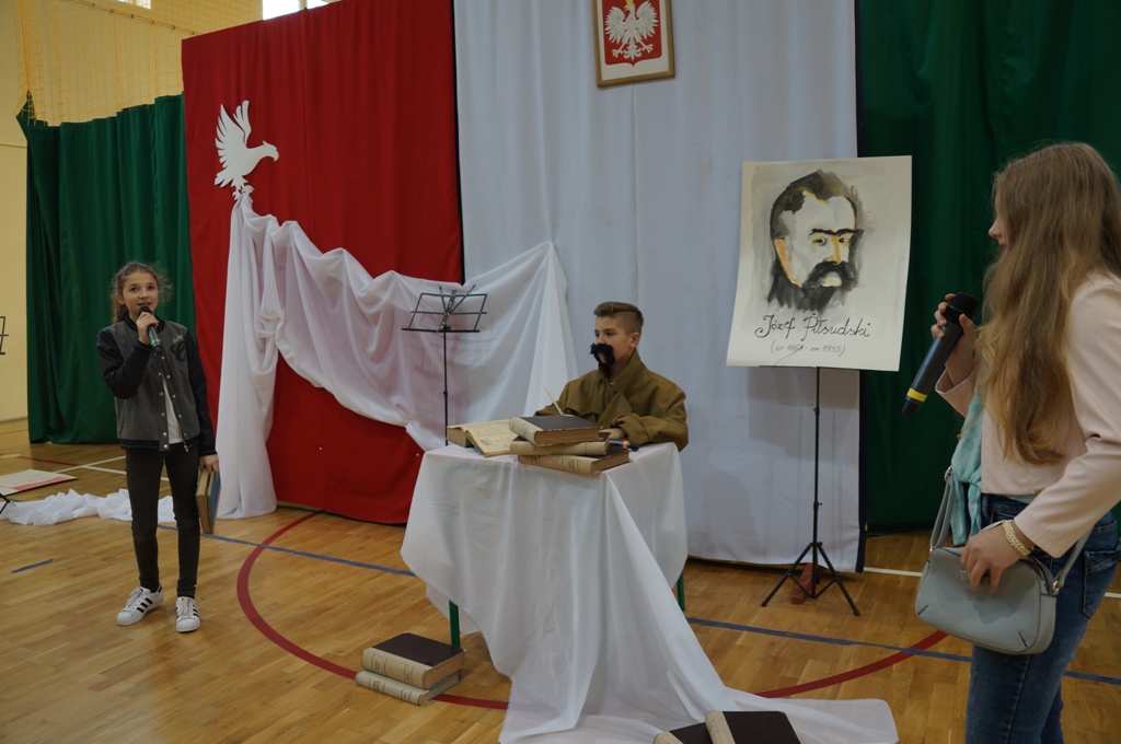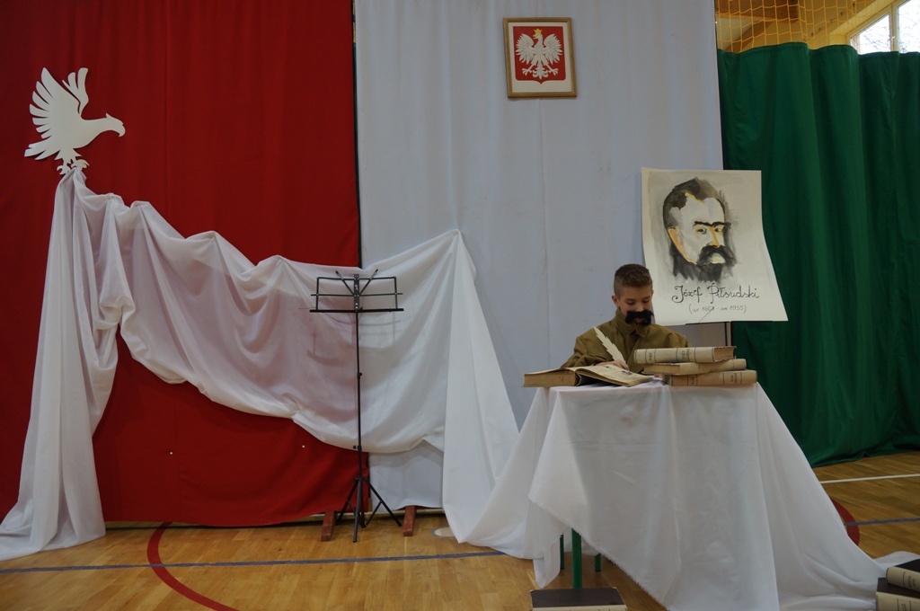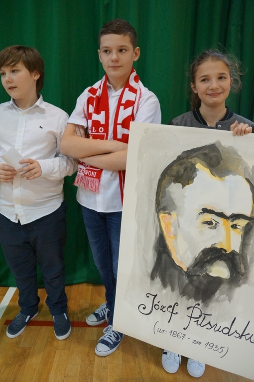 W dniu 13 listopada uroczyście obchodziliśmy w naszej szkole Święto Niepodległości. Z tej okazji uczniowie uczestniczyli w uroczystej akademii. W role aktorów wcielili się uczniowie z klas IV, VIa i VIb, którzy wystąpili w okolicznościowym przedstawieniu. Przypomnieli oni wydarzenia związane z odzyskaniem niepodległości przez Polskę. Na szkolnej scenie pojawił się sam Józef Piłsudski, który wspominał czasy I wojny światowej oraz wskazywał przykłady prawdziwego patriotyzmu. Nieco dziwiły go zwyczaje obowiązujące współcześnie, jednak szybko okazało się, że dzisiejsi uczniowie potrafią zaprezentować wiedzę dotyczącą polskiej historii oraz zachowania świadczące o miłości do ojczystego kraju. Działania i zachowanie dzieci zyskały uznanie i pochwały z ust twórcy Legionów.