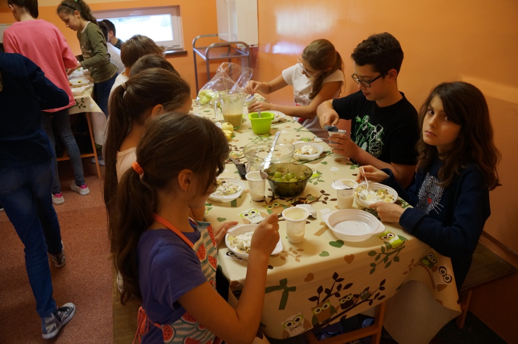 Tym razem składało się na nie pożywny naturalny jogurt z musli i owocami, sałatka owocowa oraz własnoręcznie wyciskane soki. Uczniowie samodzielnie przygotowali swój zdrowy posiłek, pracując w kilkuosobowych grupach. Wspólna praca przyniosła doskonały końcowy efekt. Wszyscy z apetytem zjedli kolorowe i zdrowe drugie śniadanie, które ucieszyło zarówno podniebienia jak i oczy dzieci.