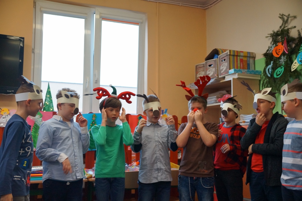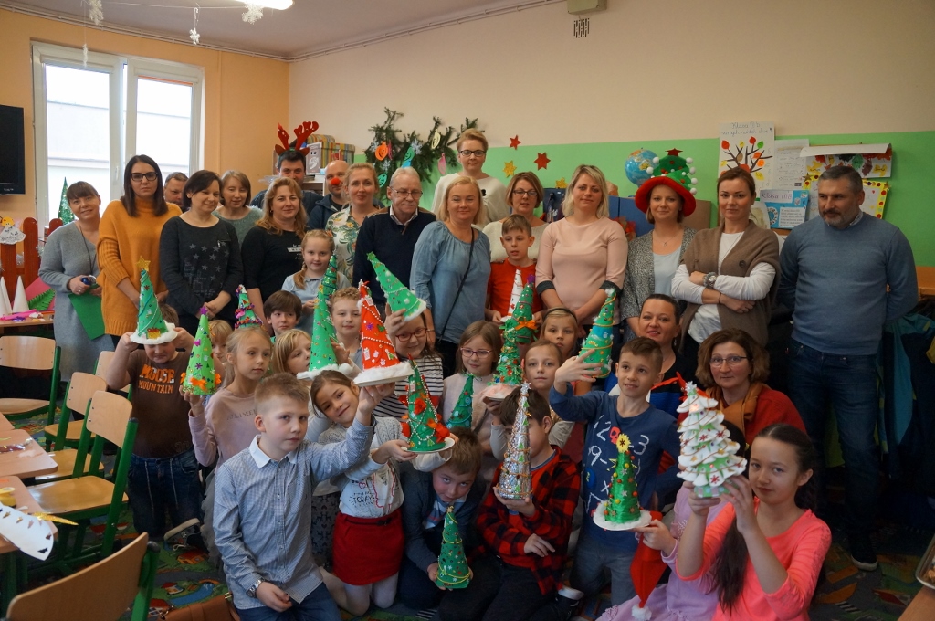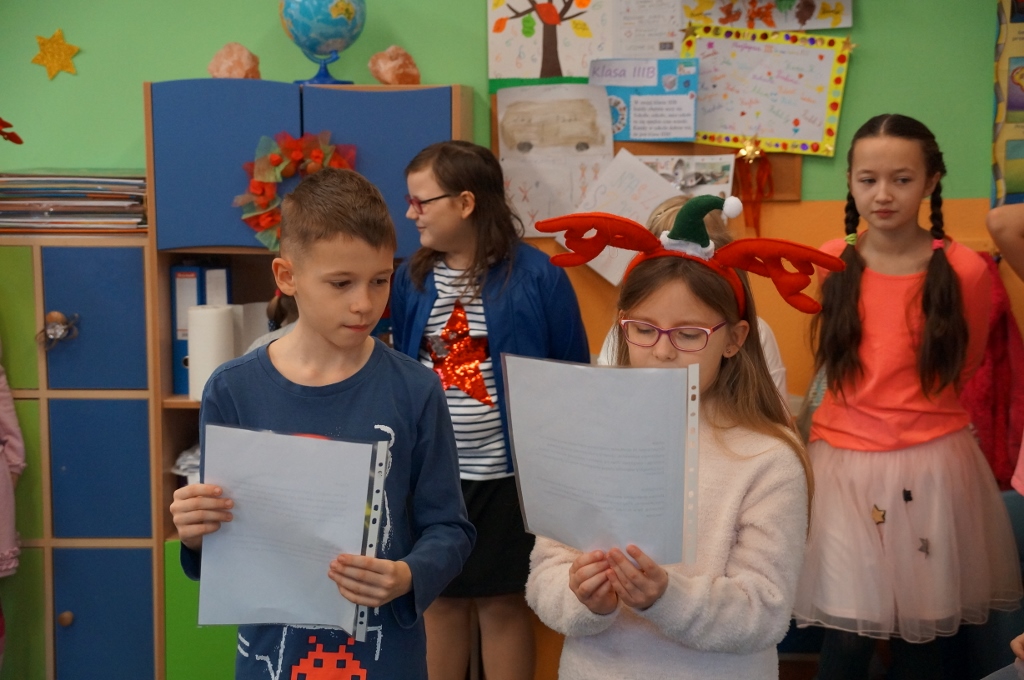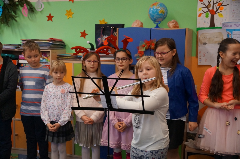 W dniu 20 grudnia 2017 roku uczniowie kl. III b zaprosili do szkoły swoich najbliższych. Najpierw odbył się piękny występ dzieci pt. „Świąteczne muzykowanie”. Uczniowie zaprezentowali bożonarodzeniowe tradycje. Nie zabrakło także wesołego śpiewu oraz muzykowania dzieci. Uczniowie zaśpiewali polskie kolędy oraz piosenki świąteczne, również w języku angielskim. Natomiast Julia Nowak umiliła obecnym czas grą na flecie poprzecznym. Przepięknie zagrała na instrumencie kolędę pt. „O Gwiazdo Betlejemska”. Końcowym punktem spotkania były warsztaty plastyczne, w których uczestniczyły dzieci oraz ich rodzice. Wspólnie wykonywano różnymi technikami, z wykorzystaniem różnych materiałów, ciekawe i barwne choinki, które zapewne będą stanowiły fantastyczną ozdobę domów podczas świąt.