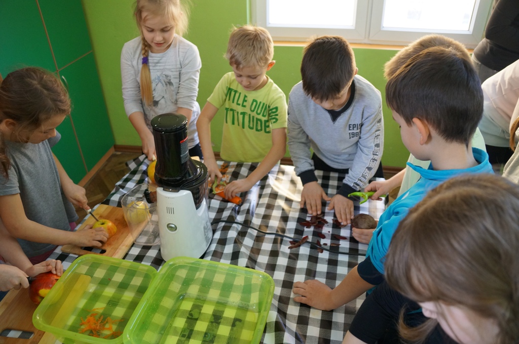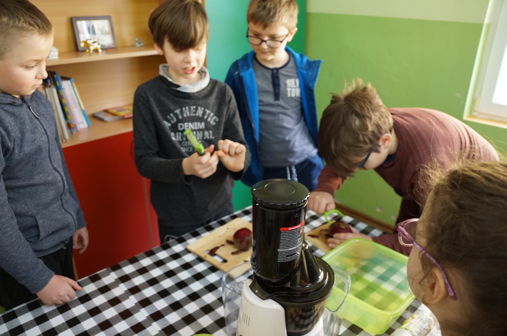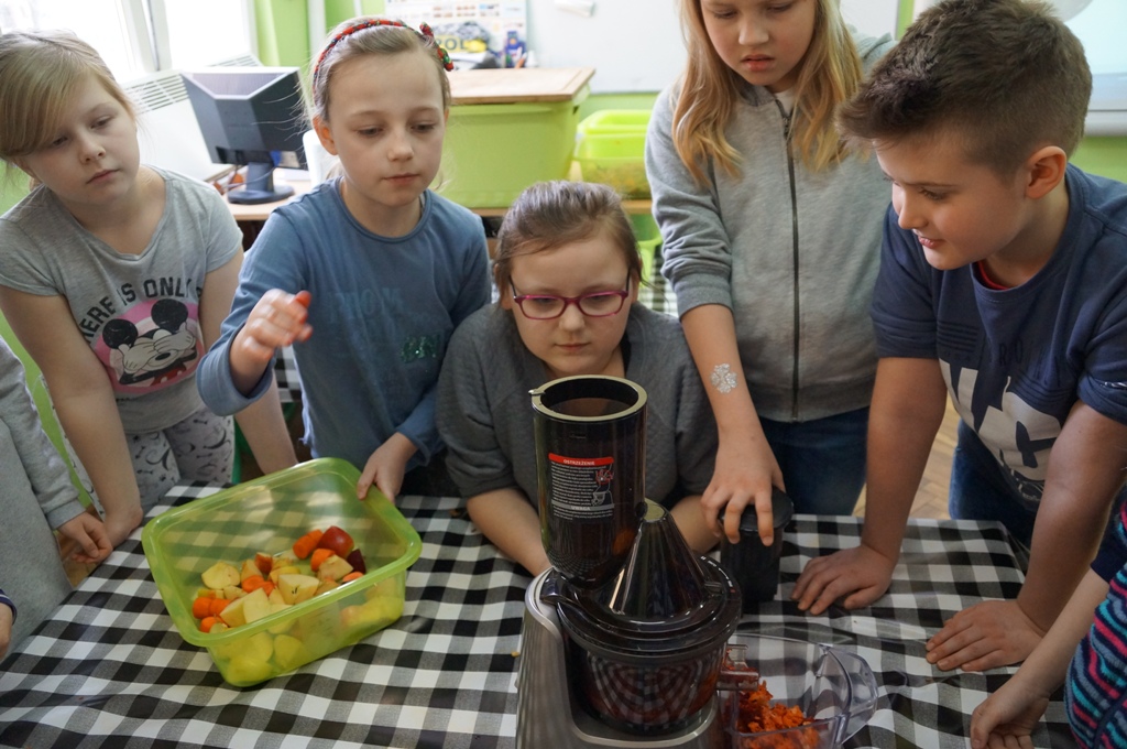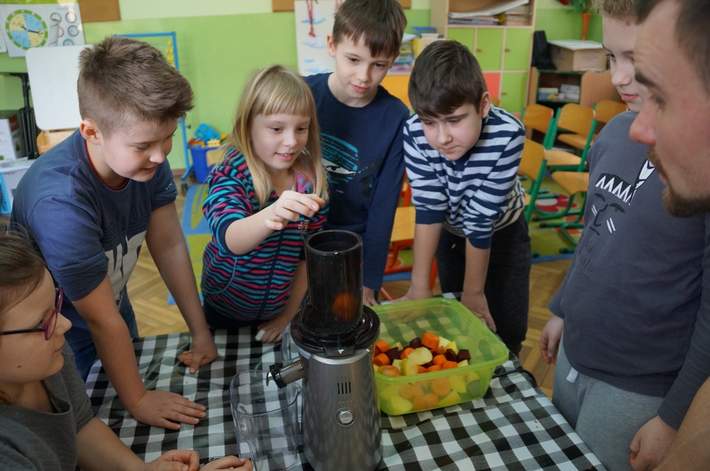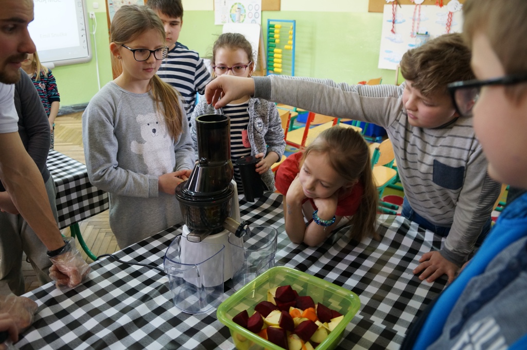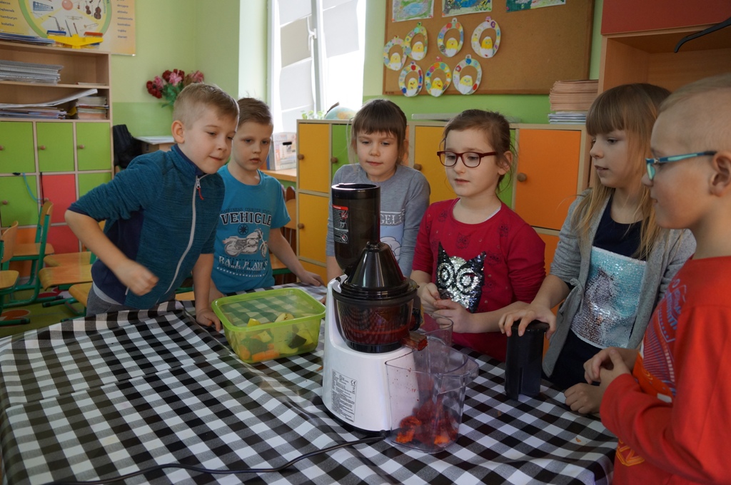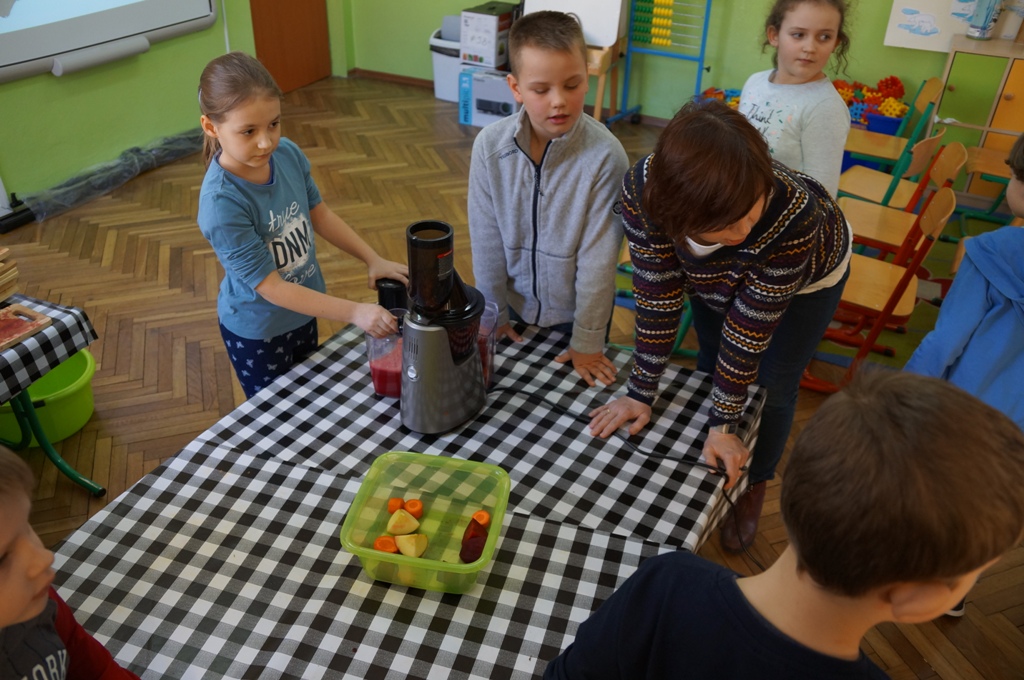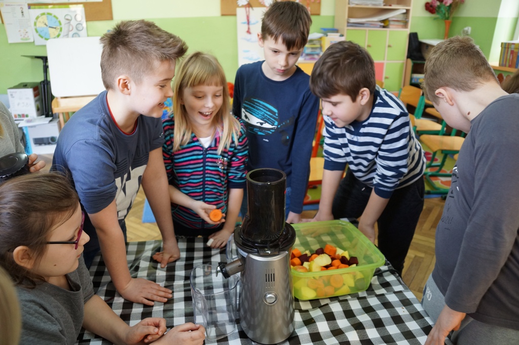 W związku z nadejściem kalendarzowej, wyczekiwanej przez wszystkich wiosny, uczniowie z edukacji wczesnoszkolnej wraz z wychowawczyniami postanowili dzień 21 marca spędzić bardzo zdrowo i kolorowo. Pamiętając o zdrowym odżywianiu i świetnym samopoczuciu, aktywnie uczestniczyli tego dnia w warsztatach prozdrowotnych. Pan prowadzący zajęcia przeprowadził dla dzieci pogadankę o wartościach odżywczych, jakie posiadają warzywa i owoce. Zwrócił uwagę na to, jak ważne jest dla człowieka i bardzo zdrowe codzienne picie świeżo wyciskanych soków. Uczniowie, pod nadzorem wychowawczyń oraz prowadzącego warsztaty, samodzielnie obierali i kroili jabłka, marchewki oraz buraki. Nauczyli się również obsługiwać wyciskarkę, po to by na koniec raczyć się przepysznym i pełnym witamin sokiem. Wszyscy zgodnie stwierdzili, że była to fantastyczna i niecodzienna lekcja na temat zdrowego odżywiania. Już po raz kolejny przekonali się, że WARZYWA I OWOCE MAJĄ NIEZWYKŁĄ MOC!