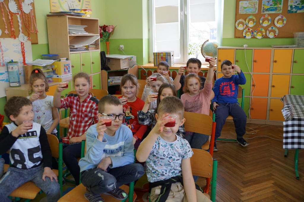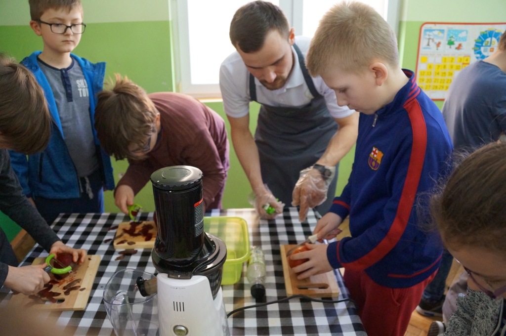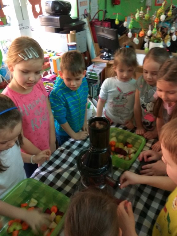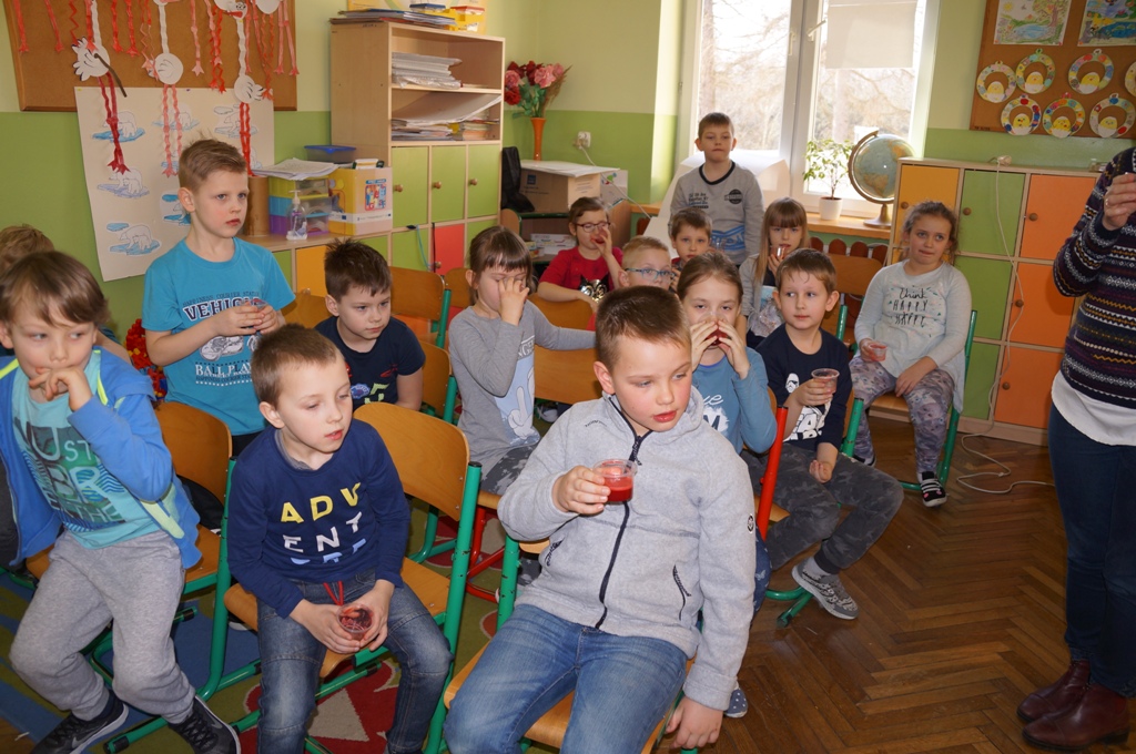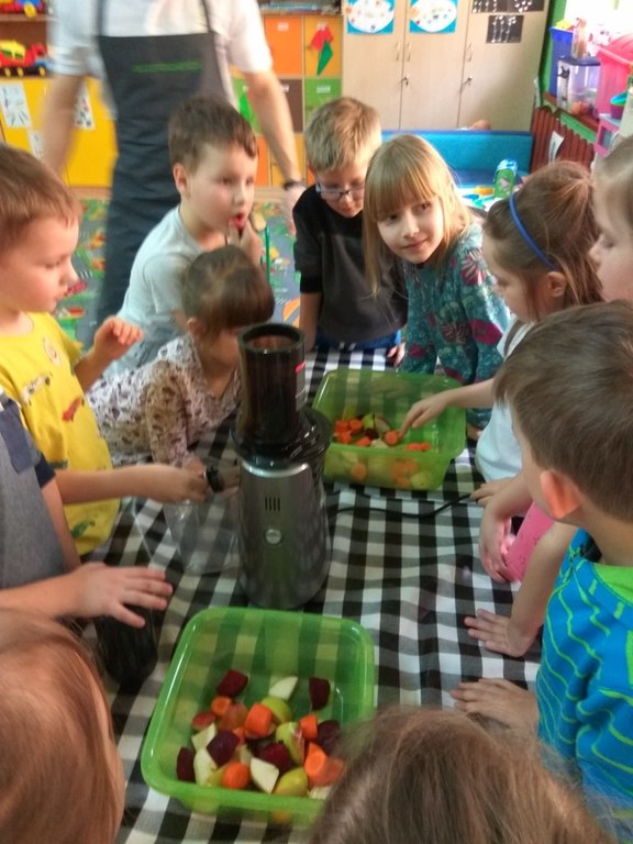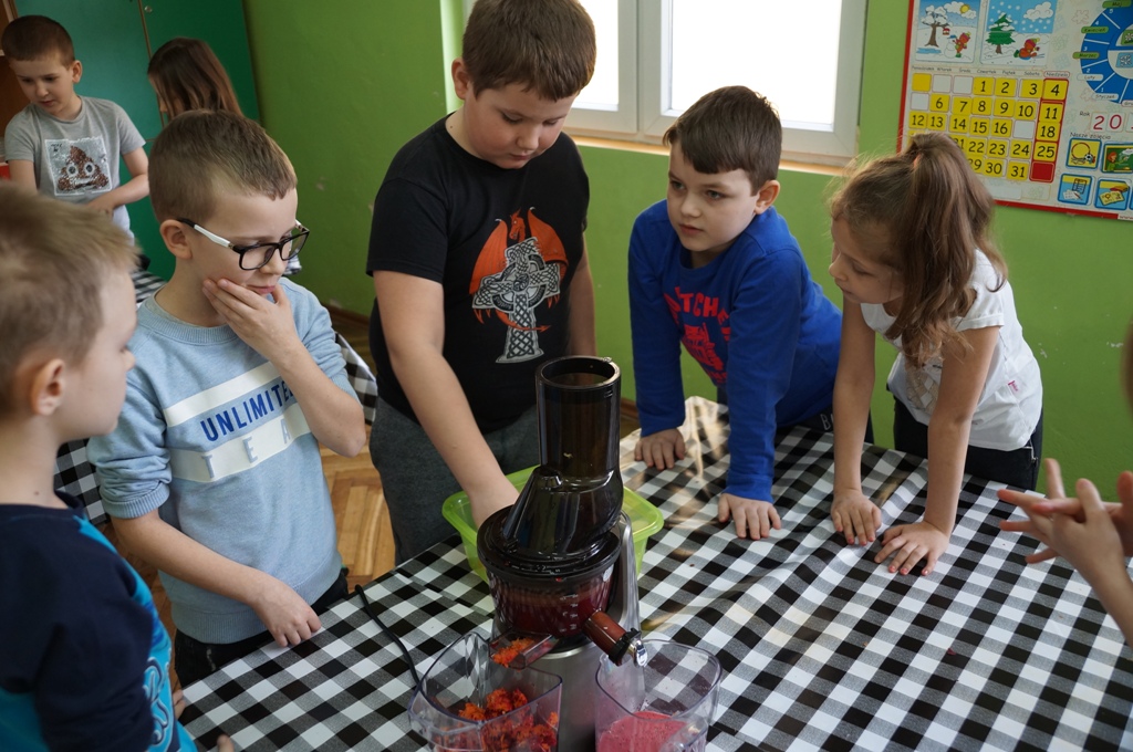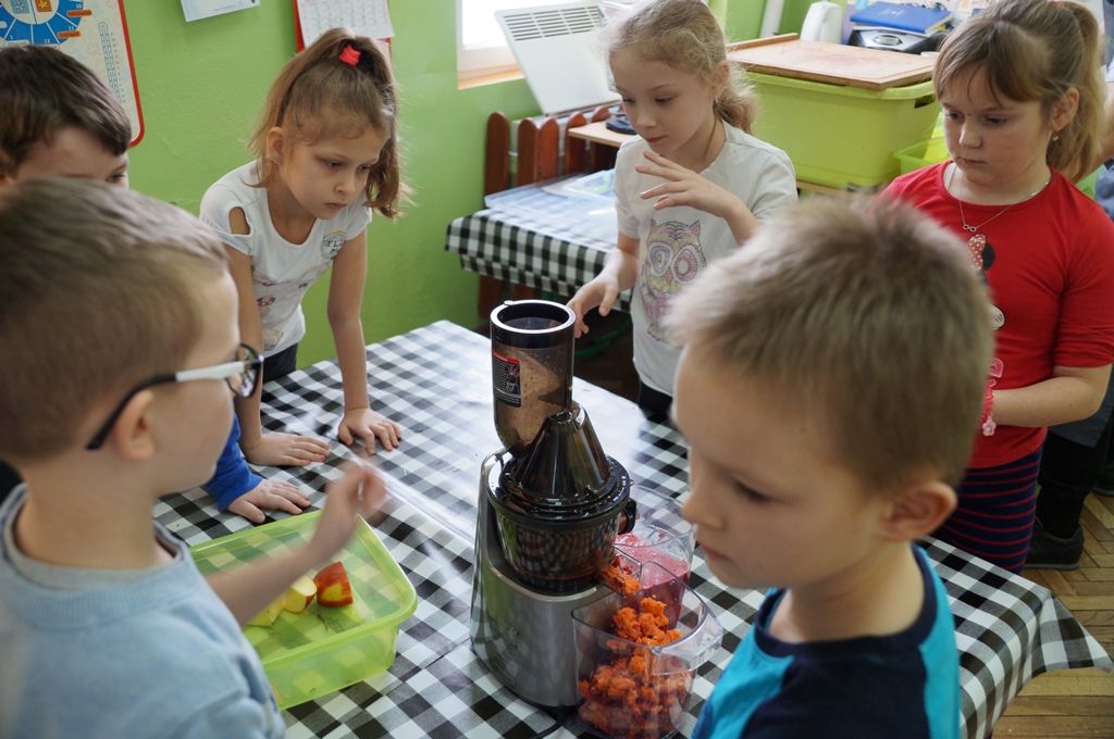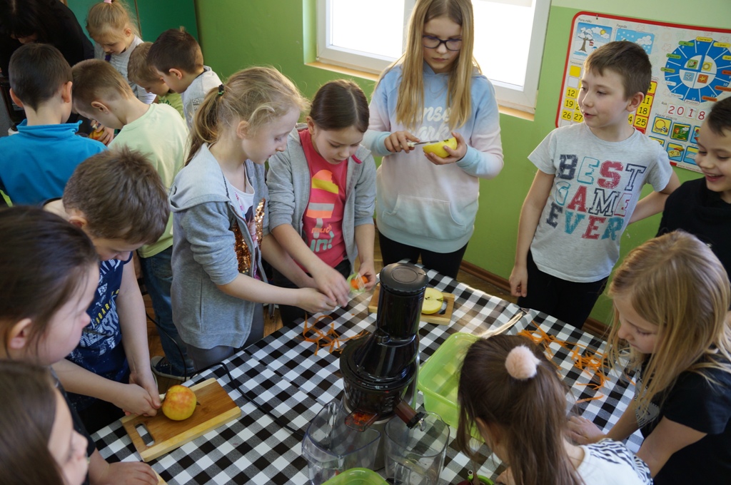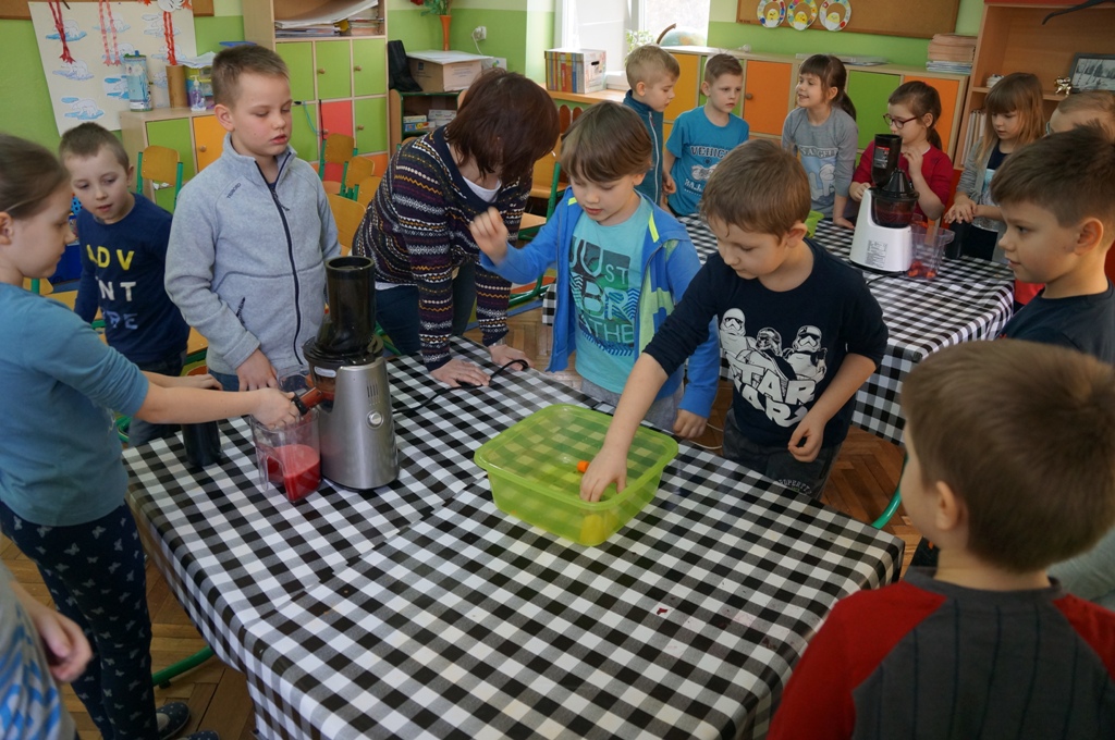 W związku z nadejściem kalendarzowej, wyczekiwanej przez wszystkich wiosny, uczniowie z edukacji wczesnoszkolnej wraz z wychowawczyniami postanowili dzień 21 marca spędzić bardzo zdrowo i kolorowo. Pamiętając o zdrowym odżywianiu i świetnym samopoczuciu, aktywnie uczestniczyli tego dnia w warsztatach prozdrowotnych. Pan prowadzący zajęcia przeprowadził dla dzieci pogadankę o wartościach odżywczych, jakie posiadają warzywa i owoce. Zwrócił uwagę na to, jak ważne jest dla człowieka i bardzo zdrowe codzienne picie świeżo wyciskanych soków. Uczniowie, pod nadzorem wychowawczyń oraz prowadzącego warsztaty, samodzielnie obierali i kroili jabłka, marchewki oraz buraki. Nauczyli się również obsługiwać wyciskarkę, po to by na koniec raczyć się przepysznym i pełnym witamin sokiem. Wszyscy zgodnie stwierdzili, że była to fantastyczna i niecodzienna lekcja na temat zdrowego odżywiania. Już po raz kolejny przekonali się, że WARZYWA I OWOCE MAJĄ NIEZWYKŁĄ MOC!