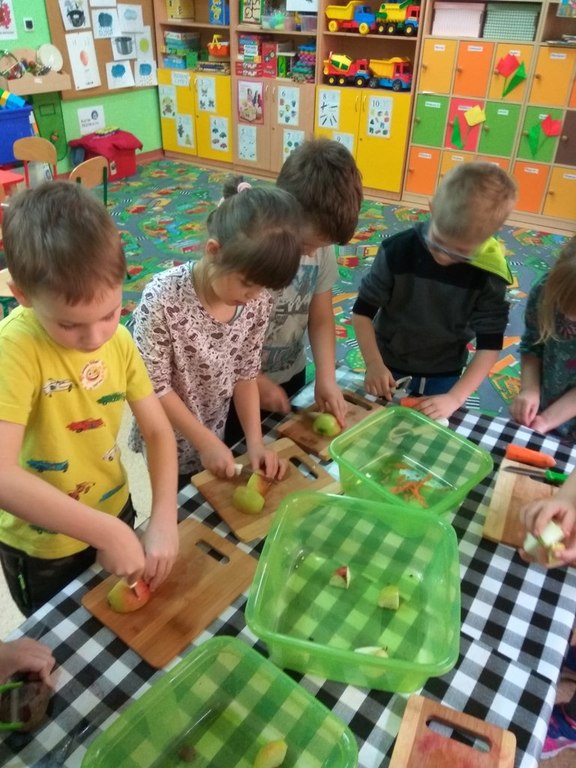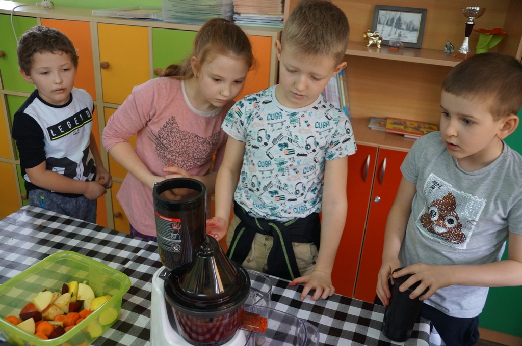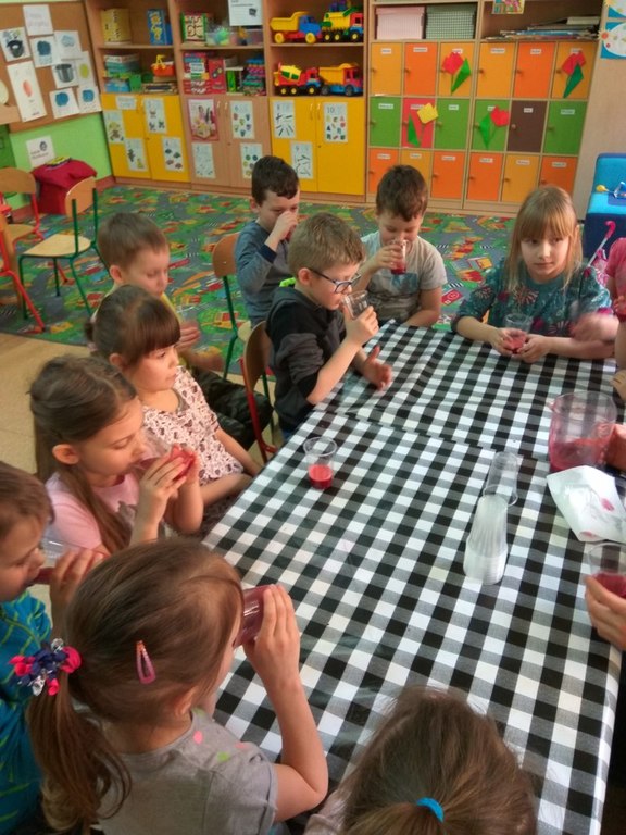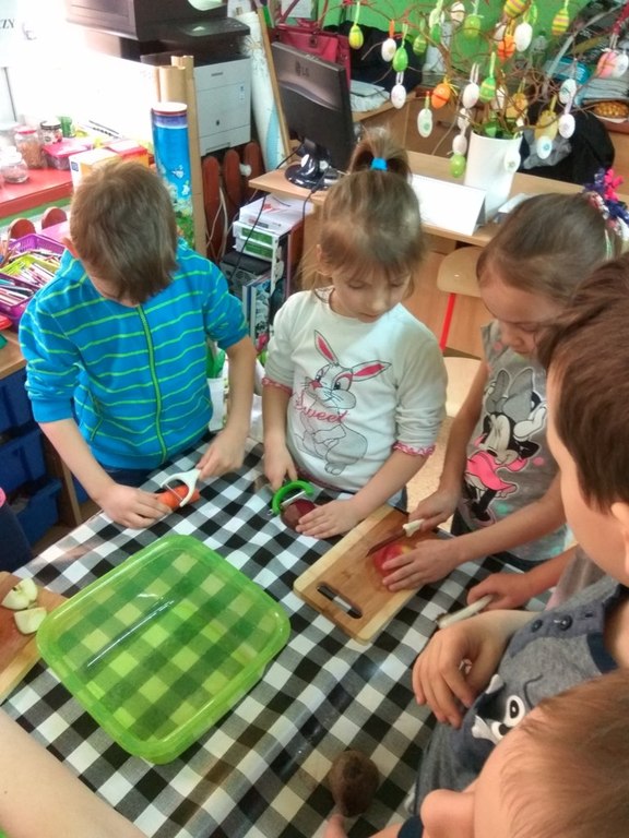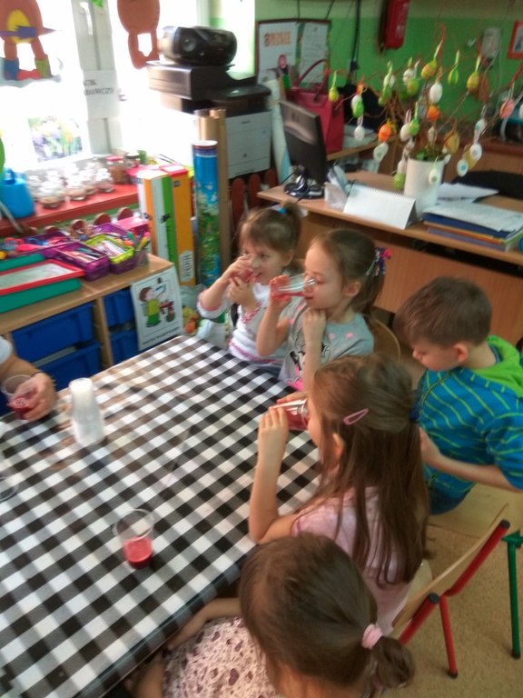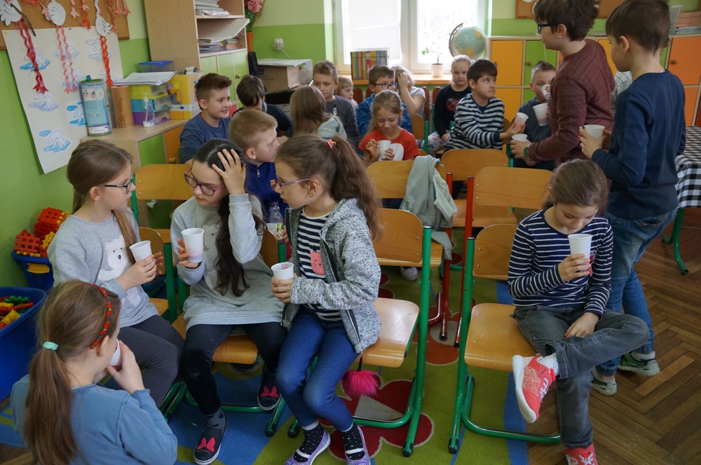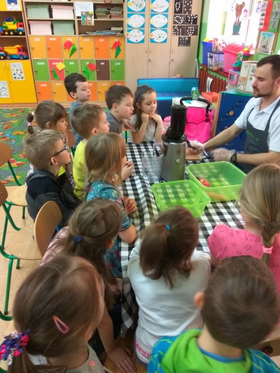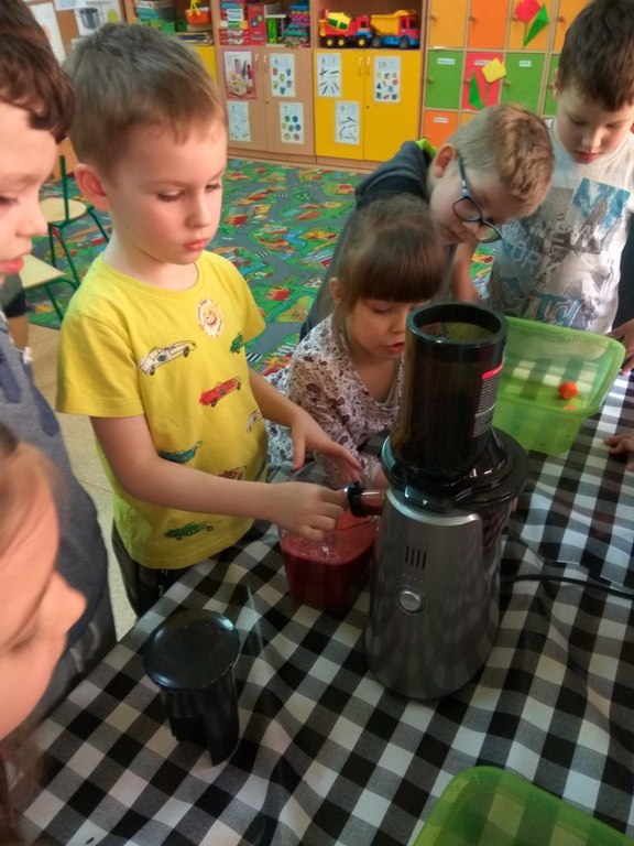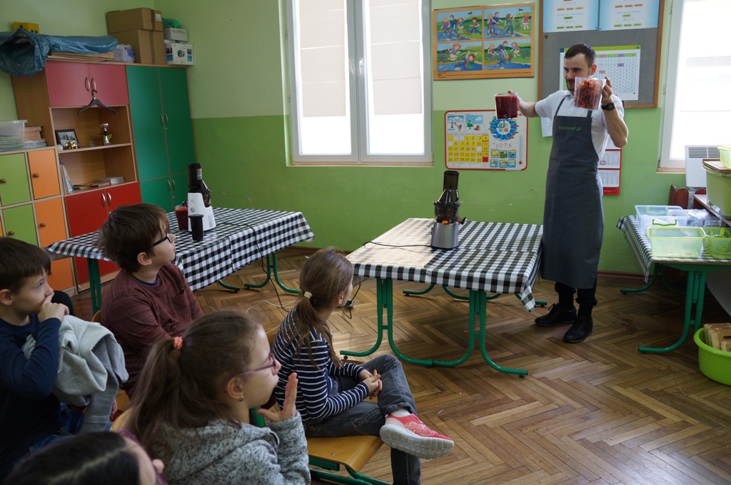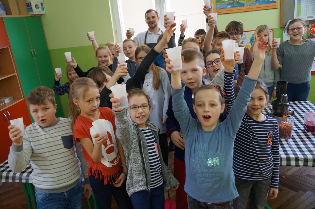 W związku z nadejściem kalendarzowej, wyczekiwanej przez wszystkich wiosny, uczniowie z edukacji wczesnoszkolnej wraz z wychowawczyniami postanowili dzień 21 marca spędzić bardzo zdrowo i kolorowo. Pamiętając o zdrowym odżywianiu i świetnym samopoczuciu, aktywnie uczestniczyli tego dnia w warsztatach prozdrowotnych. Pan prowadzący zajęcia przeprowadził dla dzieci pogadankę o wartościach odżywczych, jakie posiadają warzywa i owoce. Zwrócił uwagę na to, jak ważne jest dla człowieka i bardzo zdrowe codzienne picie świeżo wyciskanych soków. Uczniowie, pod nadzorem wychowawczyń oraz prowadzącego warsztaty, samodzielnie obierali i kroili jabłka, marchewki oraz buraki. Nauczyli się również obsługiwać wyciskarkę, po to by na koniec raczyć się przepysznym i pełnym witamin sokiem. Wszyscy zgodnie stwierdzili, że była to fantastyczna i niecodzienna lekcja na temat zdrowego odżywiania. Już po raz kolejny przekonali się, że WARZYWA I OWOCE MAJĄ NIEZWYKŁĄ MOC!