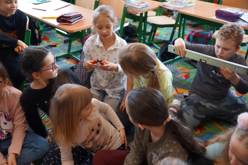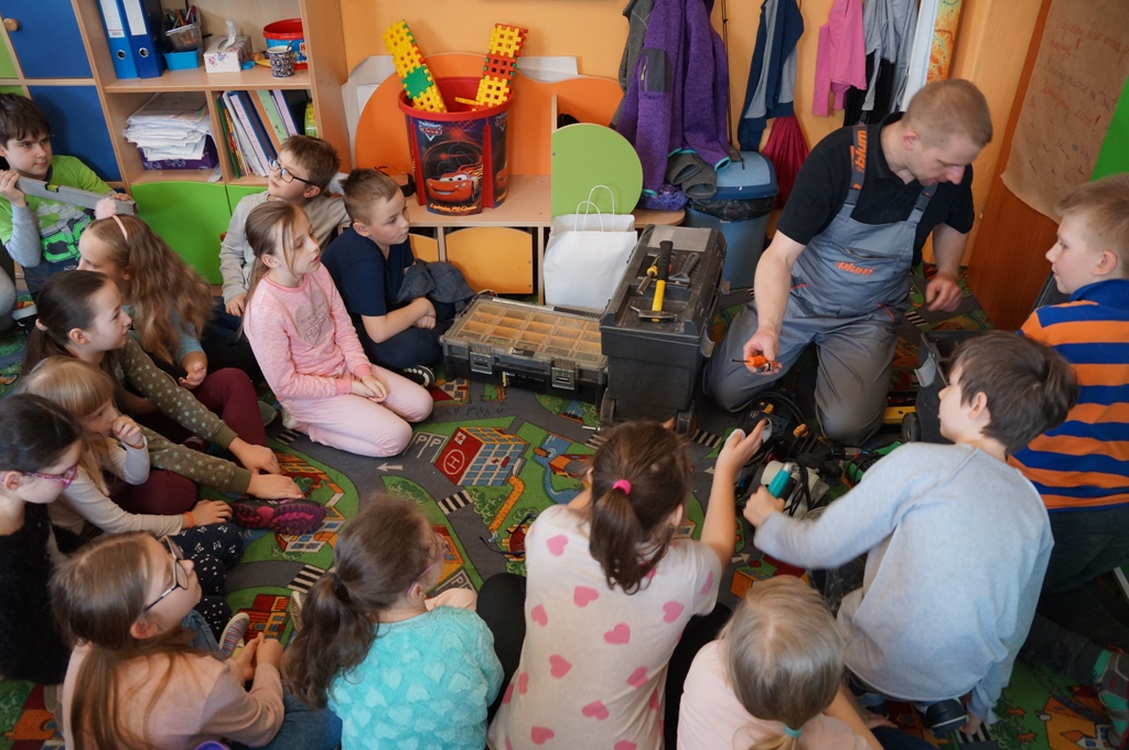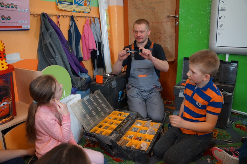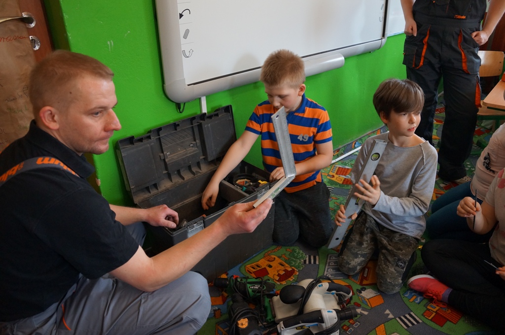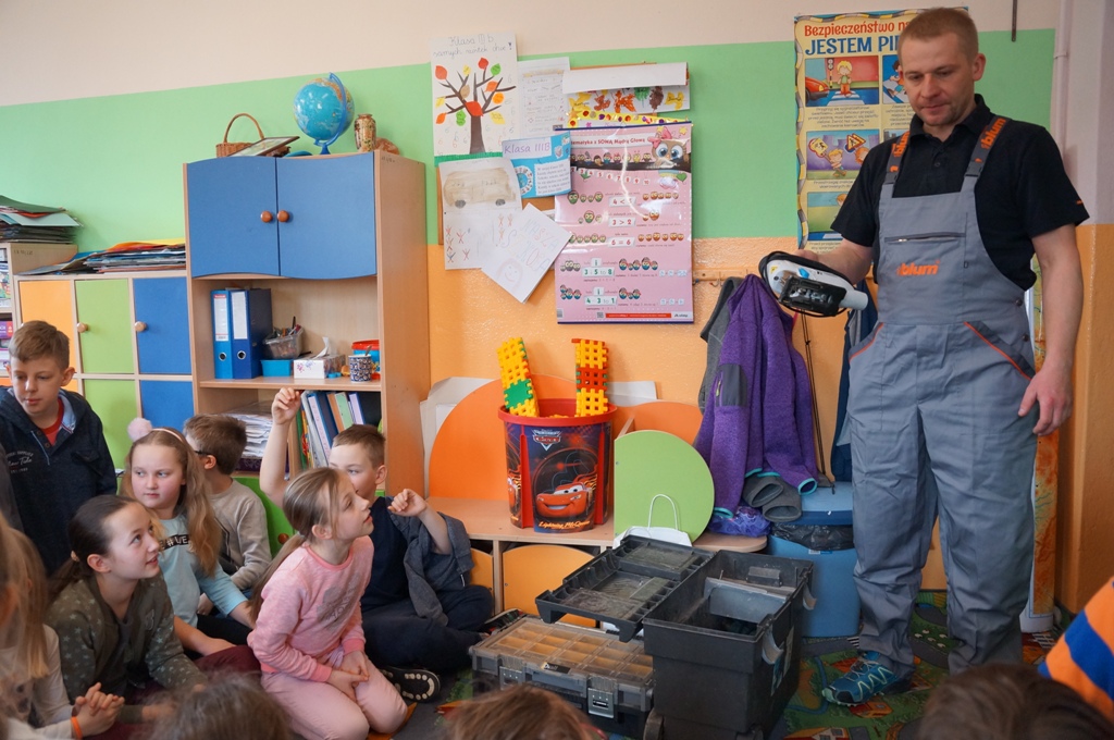 W dniu 28.03.2018 r., w ramach projektu „ Poznajemy zawody-spotkania z ciekawymi ludźmi” w kl. III b odbyły się zajęcia ze stolarzem – panem Michałem - tatą Bartka Zelcera. Uczestniczyła w nim także mama chłopca, która dzielnie pomagała w prelekcji na temat omawianego zawodu. Pan Michał w ciekawy sposób opowiadał dzieciom o swoim zawodzie, zaprezentował szereg narzędzi i przyrządów niezbędnych do pracy stolarza. Wśród nich były między innymi wiertarka, kątownik, obcęgi, wkrętarka, poziomica, śruby, młotek, zawiasy do szafek i wiele innych. Podczas spotkania mówił również o tym, w jaki sposób dokonuje się obróbki drewna. Zapoznał dzieci z zasadami bezpieczeństwa podczas pracy stolarza. Zwrócił uwagę na ubiór – spodnie robocze, które są ochroną przed ostrymi narzędziami oraz są ognioodporne. Na koniec uczniowie rozwiązywali krzyżówkę z hasłem „stolarz”, którą przygotowała mama Bartka.