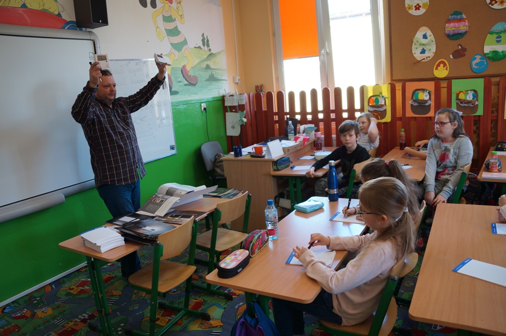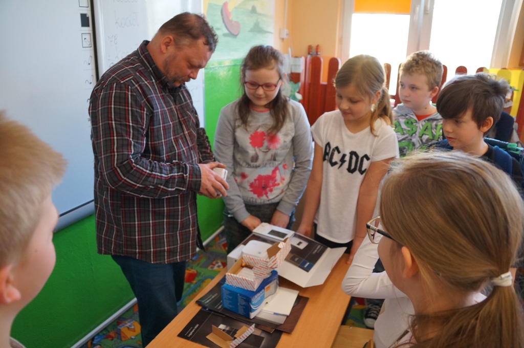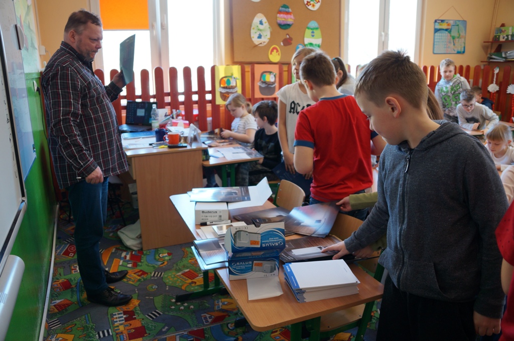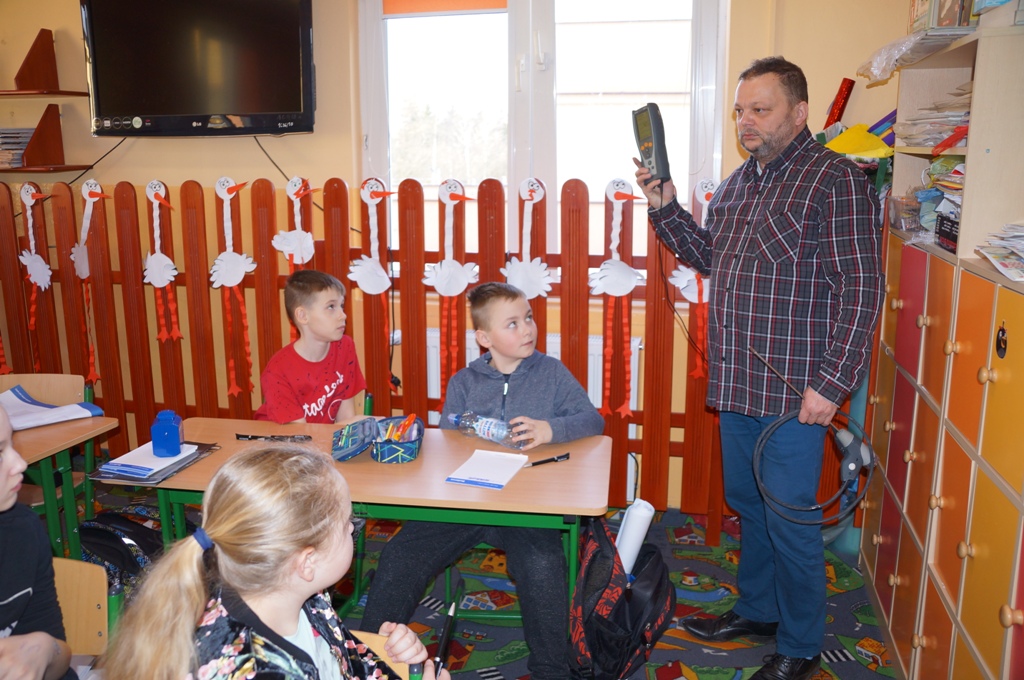 Dnia 04 kwietnia w kl. IIIb odbyło się drugie spotkanie z ciekawymi osobami prezentującymi wykonywane przez nich zawody. Tego dnia odwiedził uczniów tata Kasi Krawczyk-pan Mariusz. Zaprezentował on mało popularny, ale jakże interesujący, zwłaszcza dla chłopców zawód – serwisant systemów grzewczych. Pan Mariusz opowiadał czym się zajmuje na co dzień, mówił o systemach grzewczych znajdujących się w budynkach. Porozmawiał z dziećmi na temat tego, w jaki sposób są ogrzewane ich domy. Wskazał także różnice między ogrzewaniem podłogowym, a tradycyjnym grzejnikiem. Zwrócił uwagę na codzienne wietrzenie pomieszczeń, które jest bardzo ważne dla naszego zdrowia i samopoczucia oraz na odpowiednią temperaturę, jaka powinna znajdować się w pomieszczeniach. Pan Mariusz pokazał dzieciom sterownik pogodowy – urządzenie, które poprzez sterowanie oraz regulację pracy instalacji centralnego ogrzewania, zapewnia komfort cieplny w pomieszczeniach. Jednocześnie zapewnia on oszczędność zużywanej energii cieplnej.
