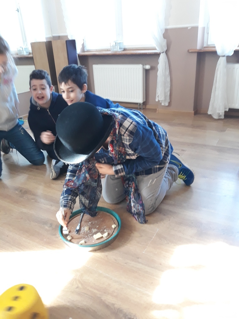 Uczniowie z niecierpliwością czekali na najważniejszy punkt zajęć - samodzielne wykonanie czekoladowej tabliczki. Z ogromnym zaangażowaniem dekorowali swoje prace różnokolorowymi posypkami, cukierkami i innymi, fantastycznymi dodatkami. Część słodkości wędrowała oczywiście do ust łakomczuchów. Po wystudzeniu prac nadszedł czas na ich prezentację oraz zabawy związane z historią i procesem produkcji czekoladowych przysmaków.