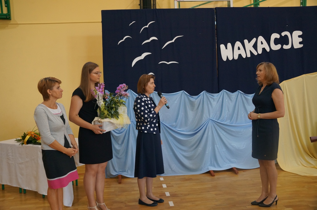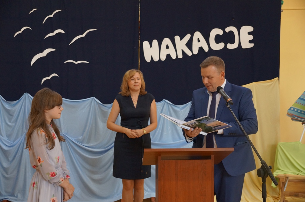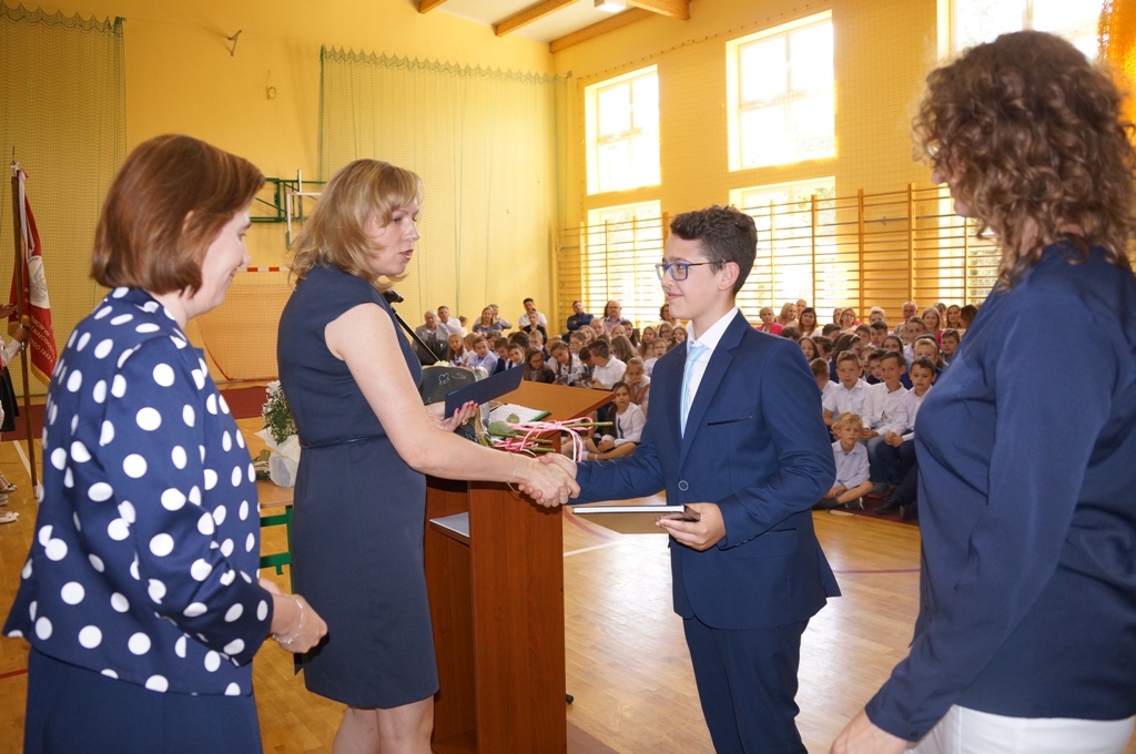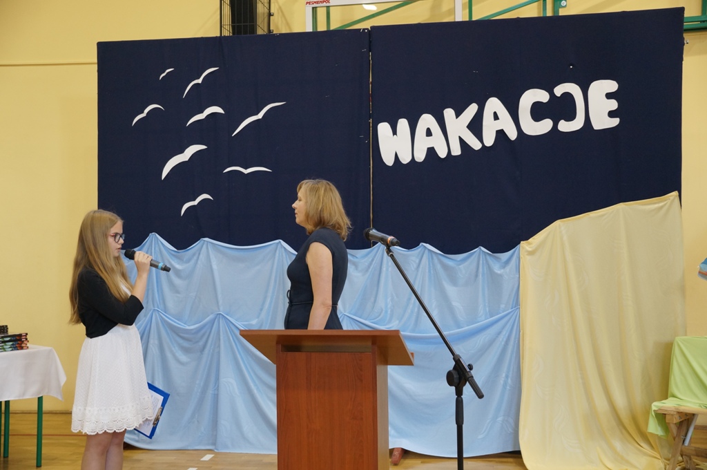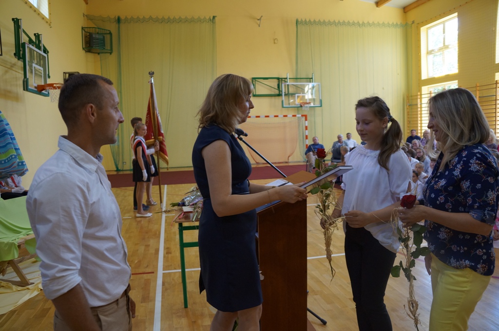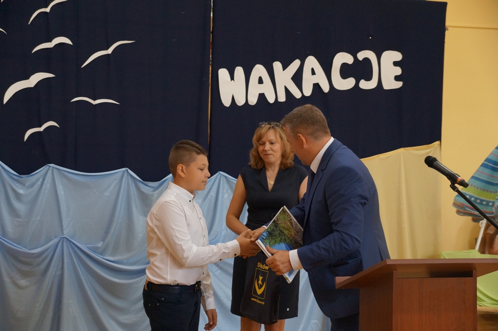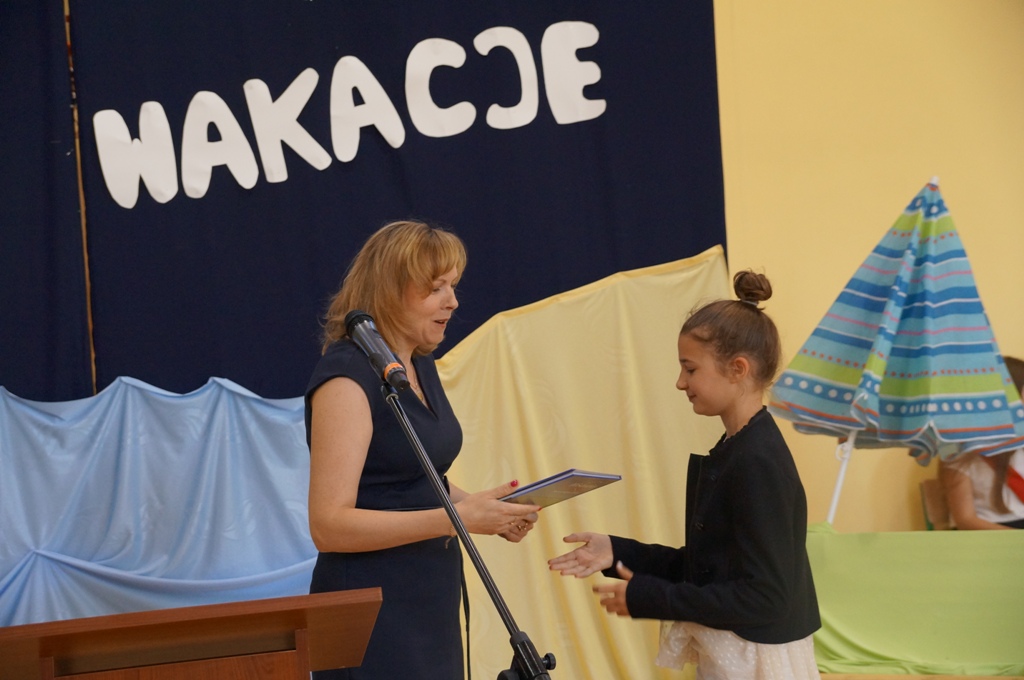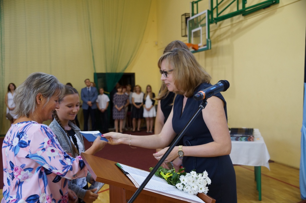 Później nastąpił moment, na który czekali uczniowie wyróżniający się w nauce. Otrzymali oni świadectwa oraz nagrody książkowe z rąk pani dyrektor, która życzyła im dalszych sukcesów i pogratulowała osiągniętych wyników. Listy gratulacyjne otrzymali także rodzice najlepszych uczniów.