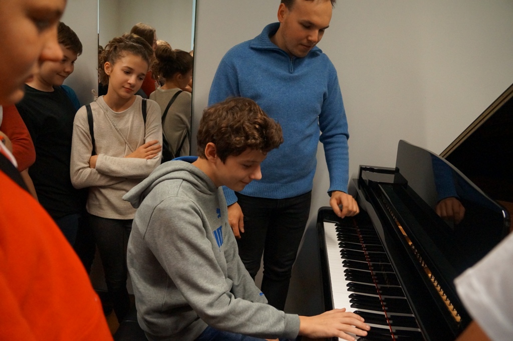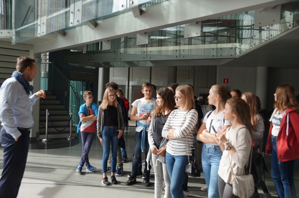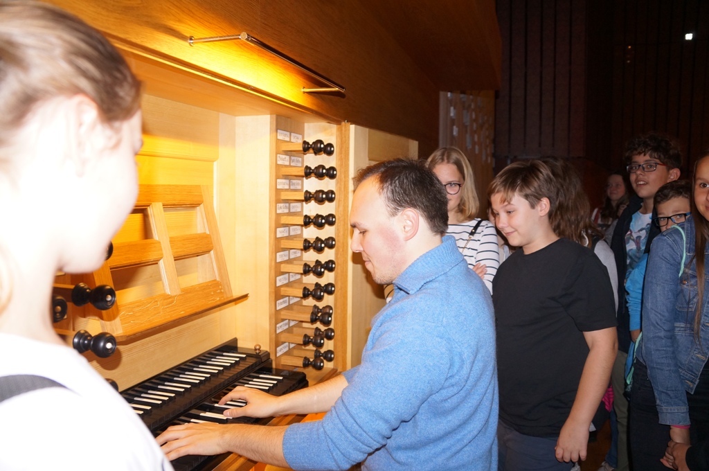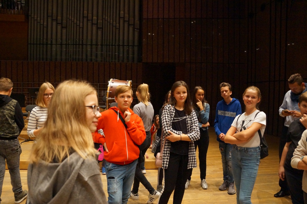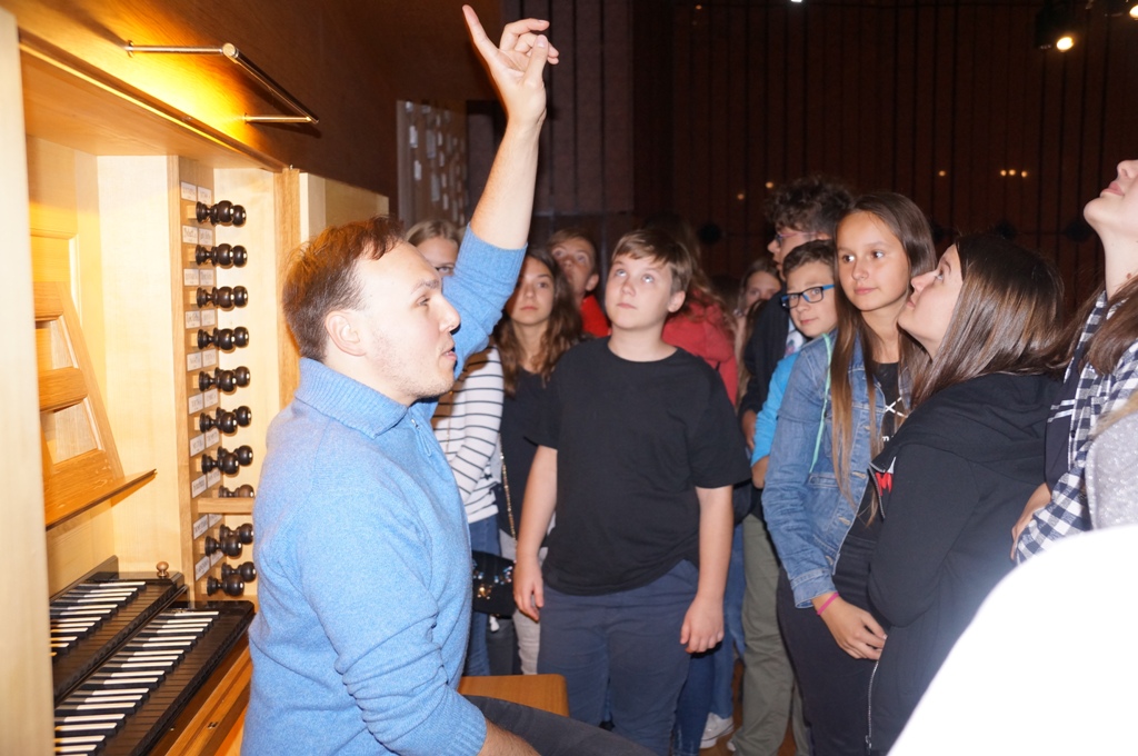 Siódmoklasiści mogli poznać ten obiekt ,,od kuchni”: udali się do garderoby muzyków, solistów; odbyli spacer po zapleczu. Jednak najważniejszym punktem zwiedzania była możliwość obejrzenia potężnych barkowo- renesansowych organów. Przewodnik oprowadzający po obiekcie przekazał uczniom wiele interesujących informacji oraz ciekawostek o pracy w filharmonii.