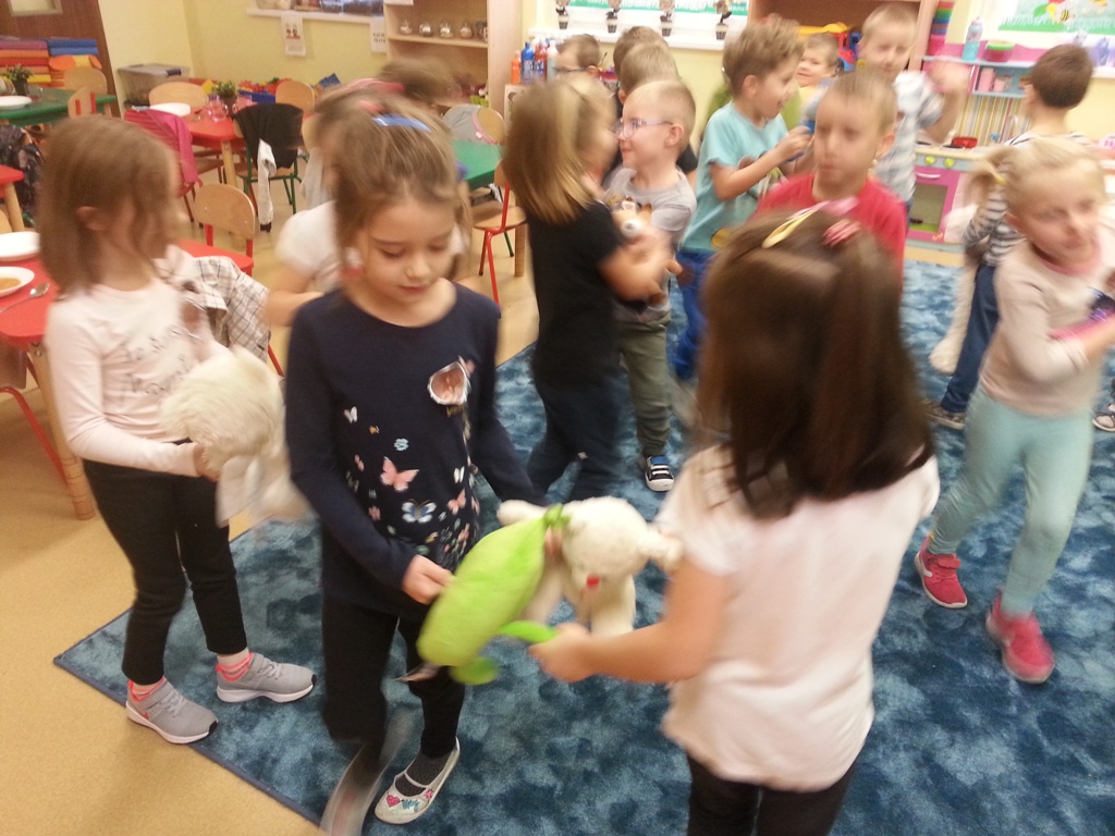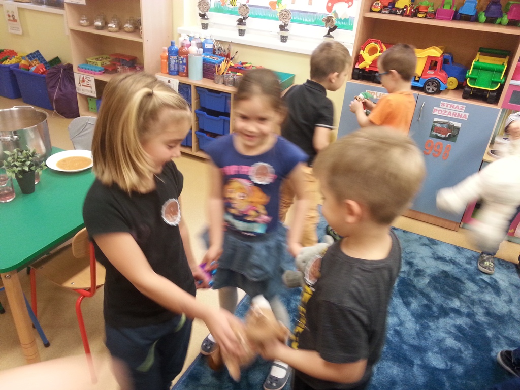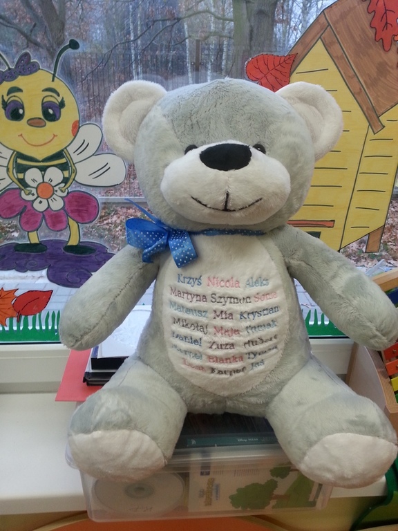 Przedszkolaki otrzymały prezent – dużego misia z wyszytymi imionami wszystkich uczniów. Nazwały go „Teddy”. Zadaniem każdego dziecka będzie zabranie miśka do domu wraz z „Księgą przygód” i opisanie, narysowanie itp., jaką przygodę z misiem przeżyło.