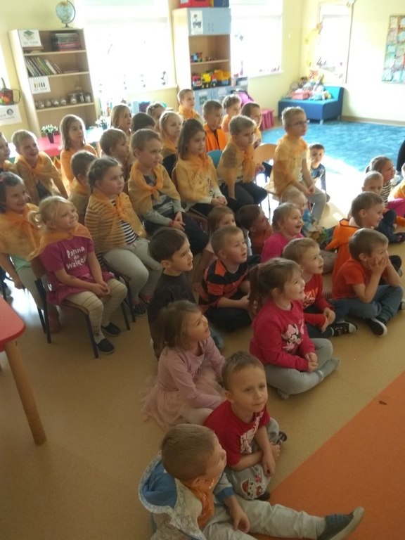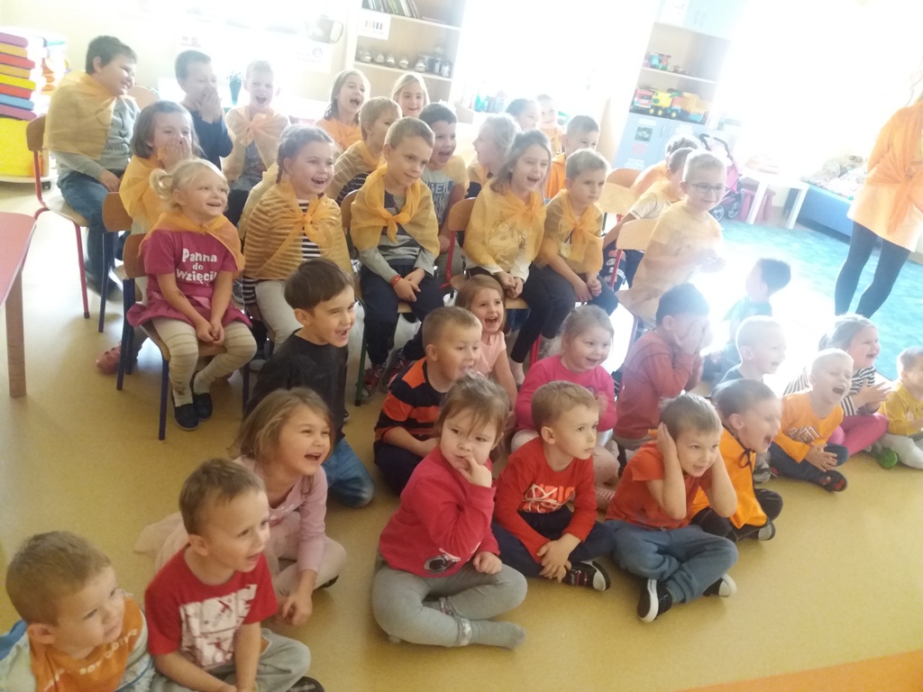 Zajęcia rozpoczęły się bajką edukacyjną, dzięki której dzieci dowiedziały się, w jakich warunkach rosną dynie, rozmawiały na temat jej wartości odżywczych oraz wymieniały omysły na przysmaki dyniowe.