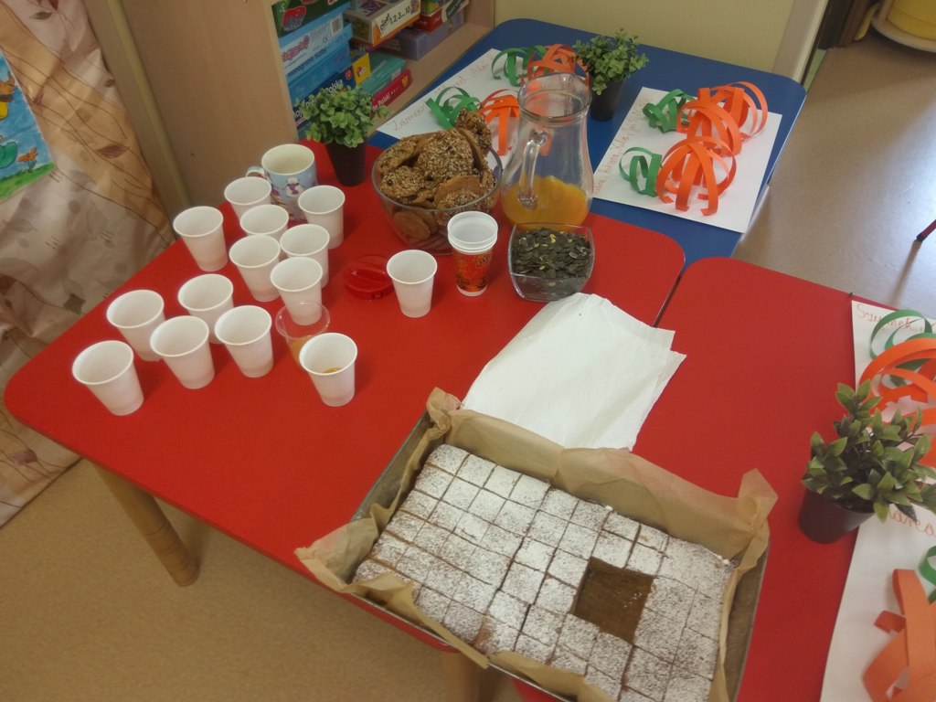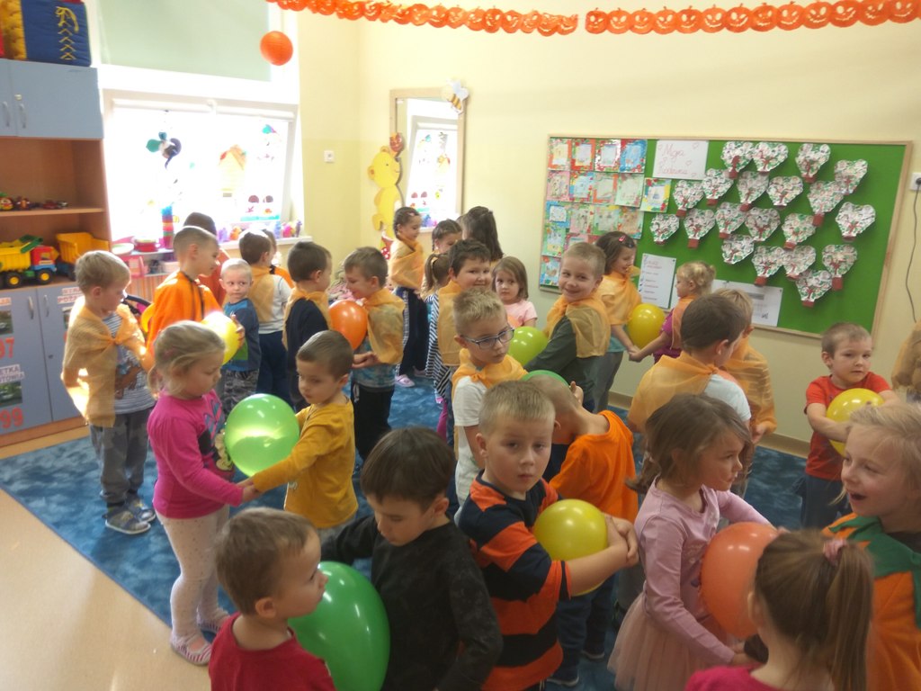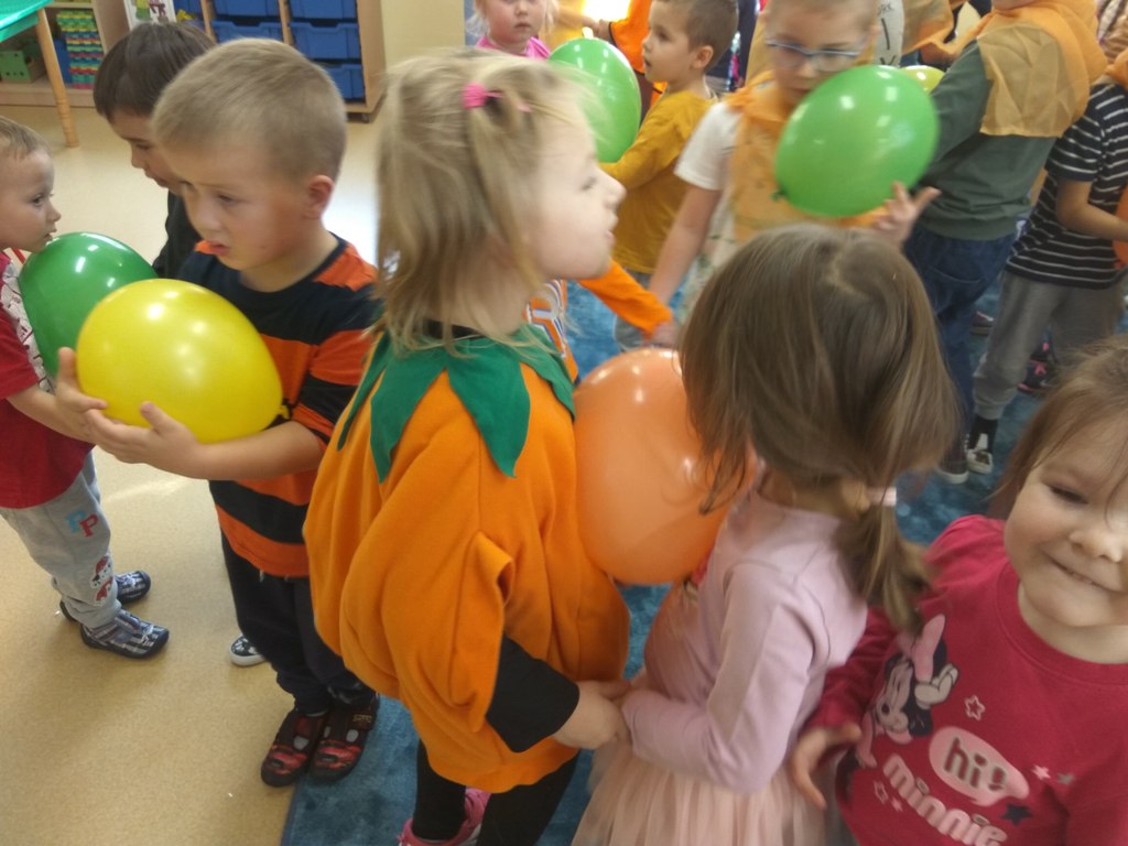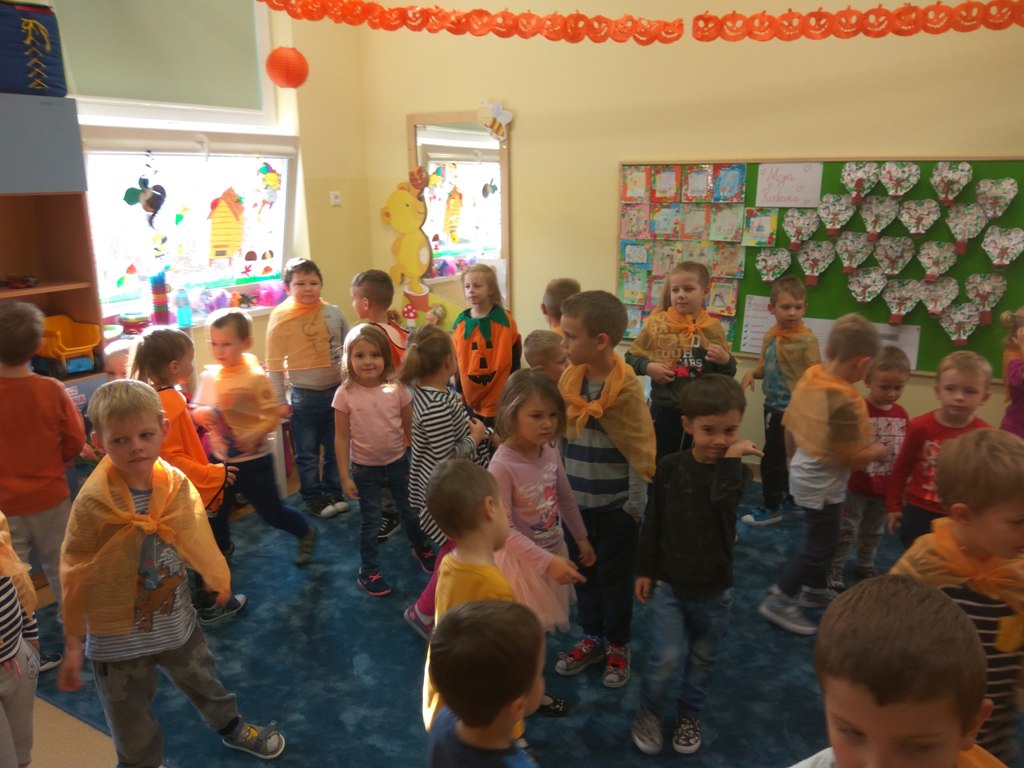 Dalsza część Święta Dyni prowadzona była w języku angielskim. Przedszkolaki poznały piosenkę „Five little pumpkins”, a wraz z nią nowe słówka i zwroty. Po ciekawych grach i zabawach na przedszkolaki czekały dyniowe smakołyki: ciasta, ciasteczka i sok dyniowy.