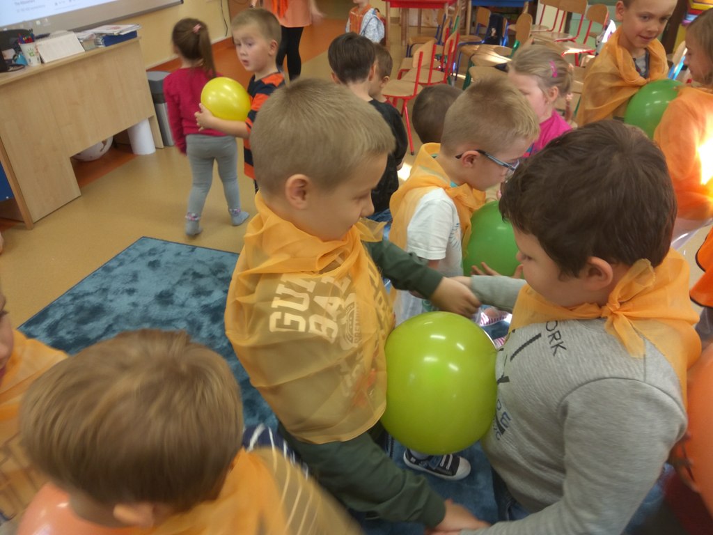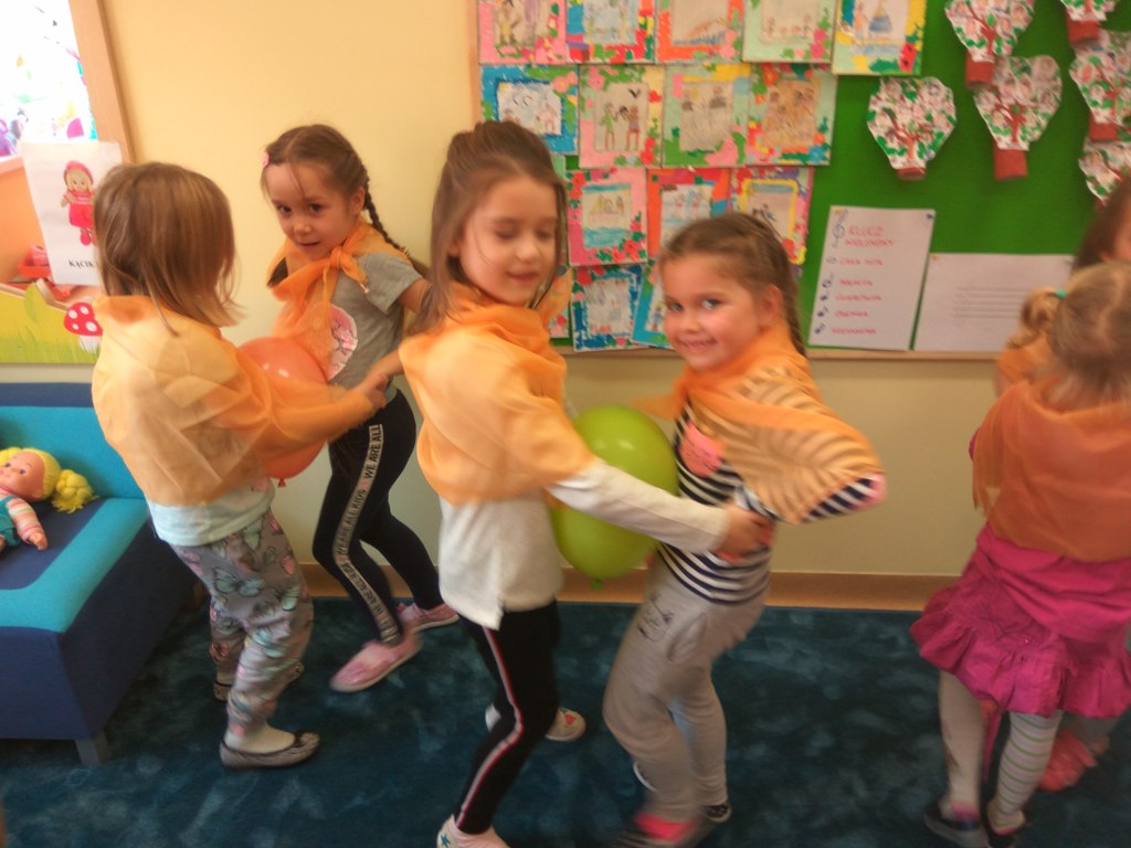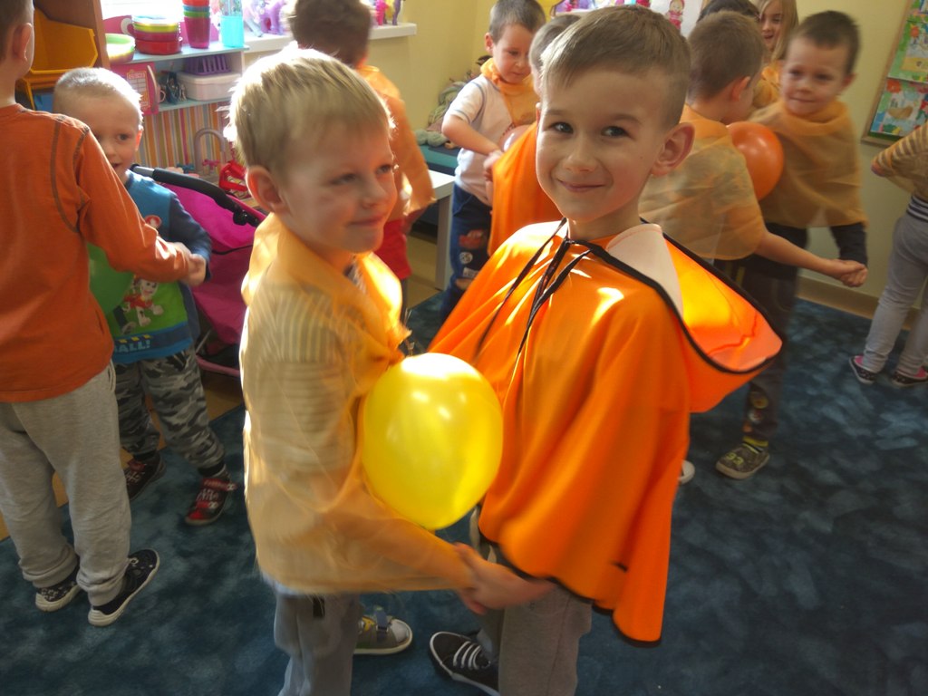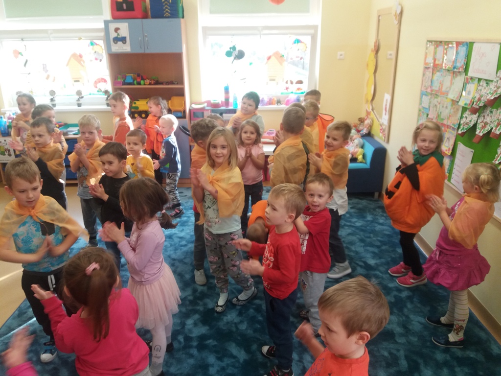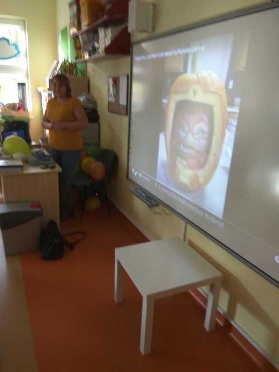 Dalsza część Święta Dyni prowadzona była w języku angielskim. Przedszkolaki poznały piosenkę „Five little pumpkins”, a wraz z nią nowe słówka i zwroty. Po ciekawych grach i zabawach na przedszkolaki czekały dyniowe smakołyki: ciasta, ciasteczka i sok dyniowy.