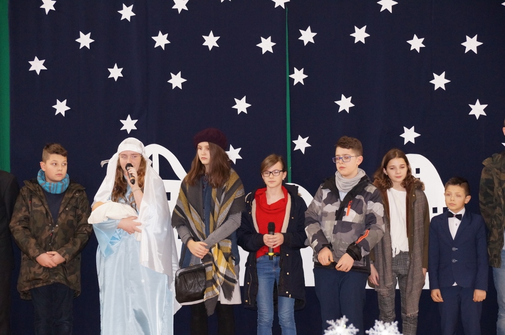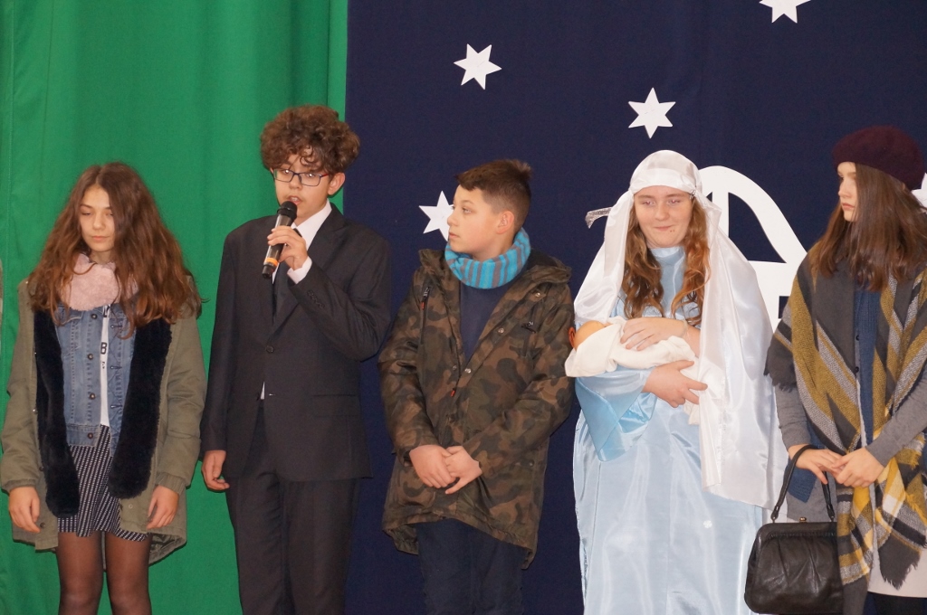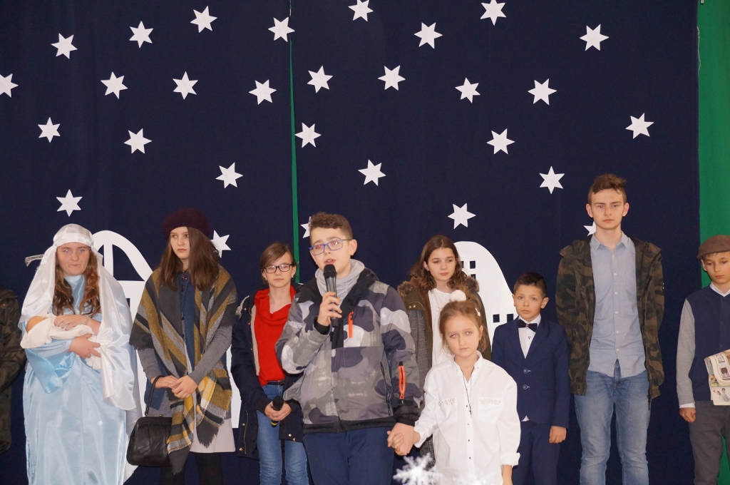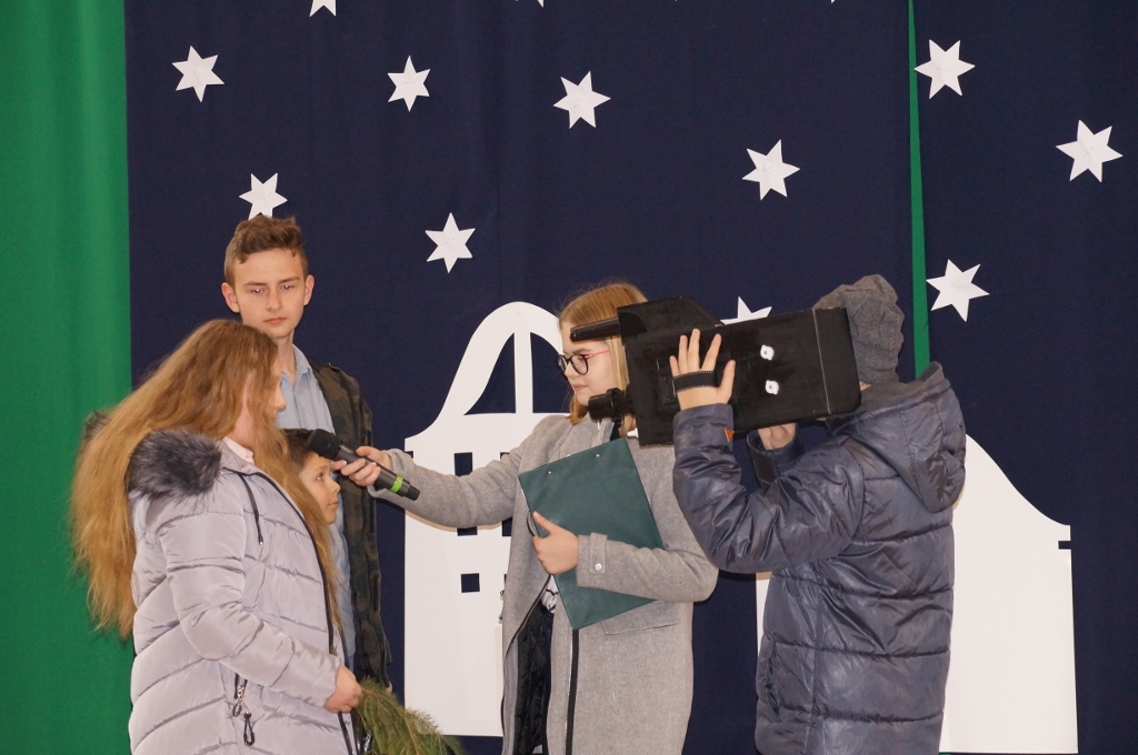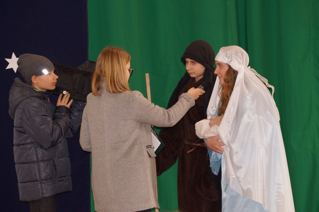 Świąteczna atmosfera w naszej szkole sięgnęła zenitu. Po spotkaniach wigilijnych w klasach zebraliśmy się wszyscy w sali gimnastycznej, gdzie uczniowie starszych klas zaprezentowali jasełka. Tym razem odbiegały one od tradycyjnych, opowiadających bezpośrednio o narodzeniu Pana, albowiem aktorzy odegrali sceny dziejące się na współczesnej ulicy. Spotkania biznesmanów, nastolatek, staruszek miały uświadomić nam, że Boże Narodzenie dzieje się każdego dnia, wszędzie tam, gdzie jest miłość, przebaczenie, zrozumienie drugiego człowieka i czas dla niego.