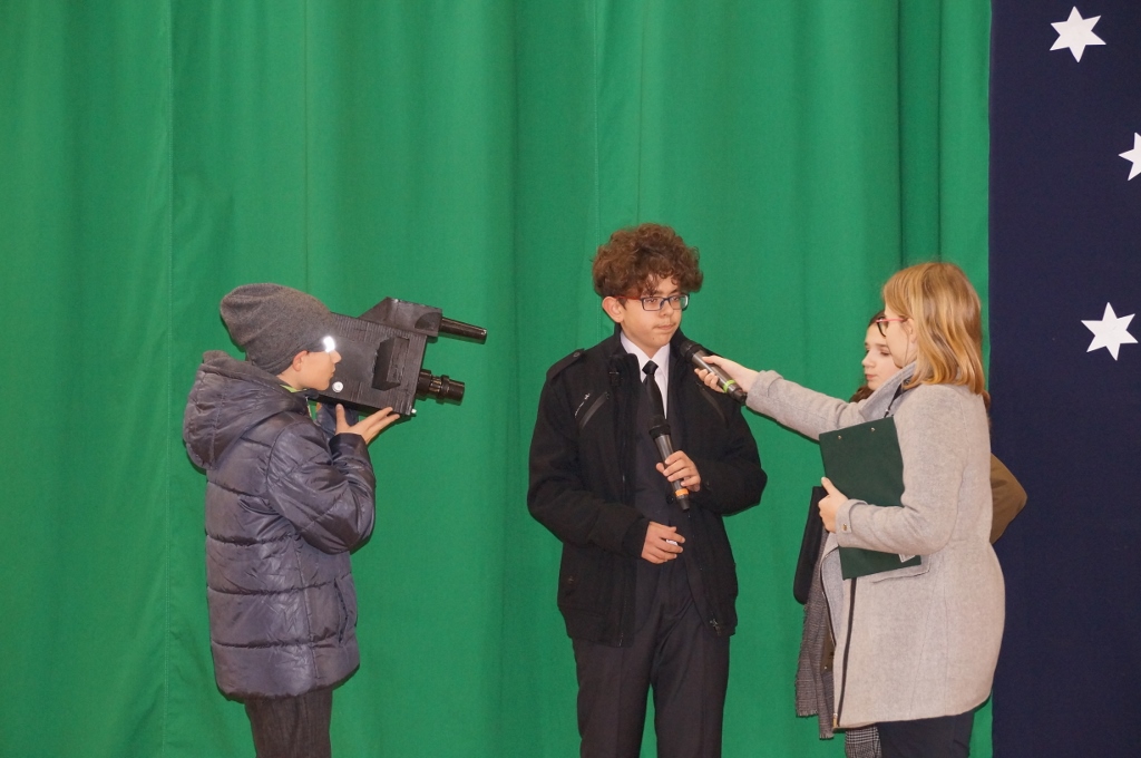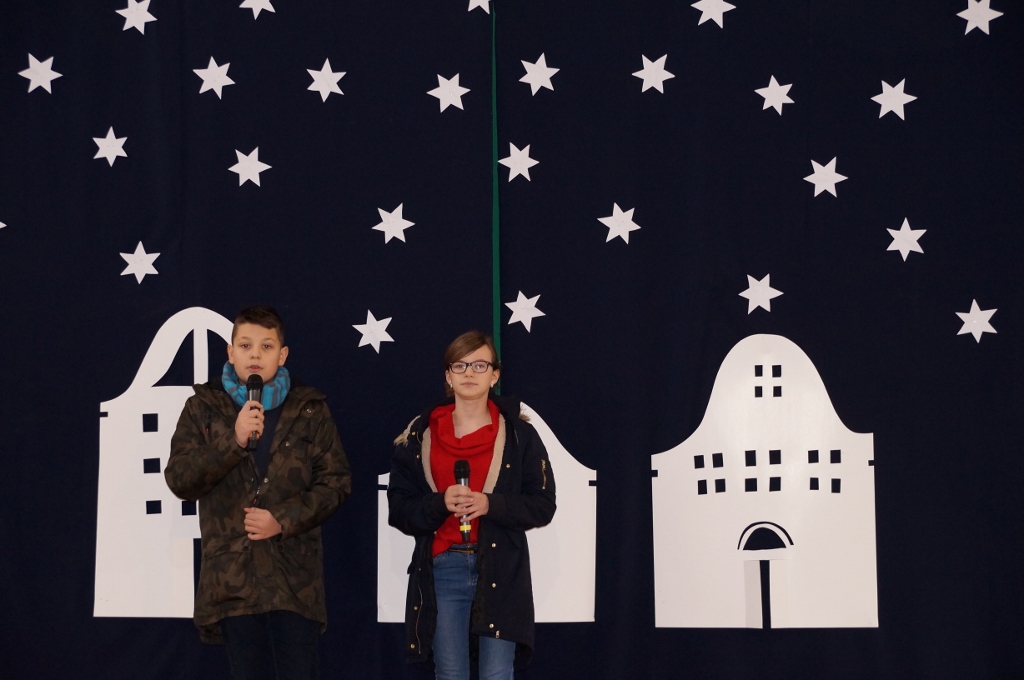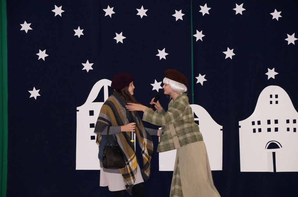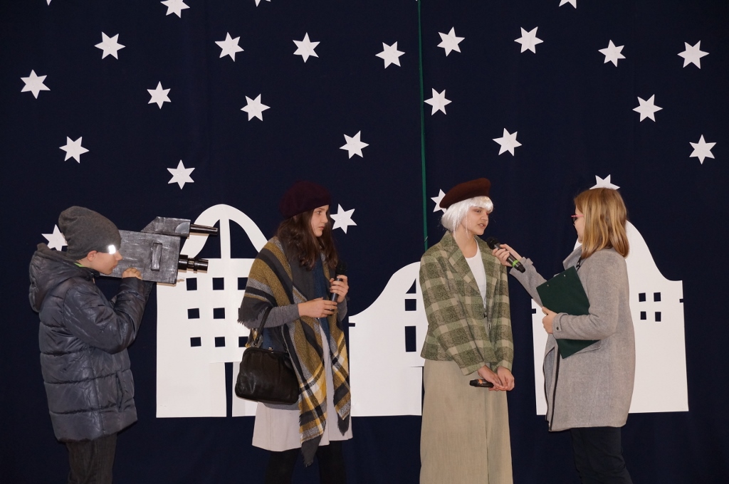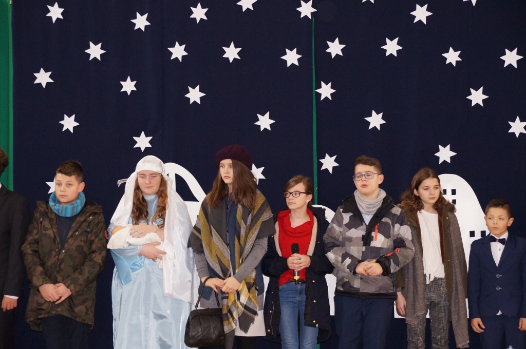 Świąteczna atmosfera w naszej szkole sięgnęła zenitu. Po spotkaniach wigilijnych w klasach zebraliśmy się wszyscy w sali gimnastycznej, gdzie uczniowie starszych klas zaprezentowali jasełka. Tym razem odbiegały one od tradycyjnych, opowiadających bezpośrednio o narodzeniu Pana, albowiem aktorzy odegrali sceny dziejące się na współczesnej ulicy. Spotkania biznesmanów, nastolatek, staruszek miały uświadomić nam, że Boże Narodzenie dzieje się każdego dnia, wszędzie tam, gdzie jest miłość, przebaczenie, zrozumienie drugiego człowieka i czas dla niego.