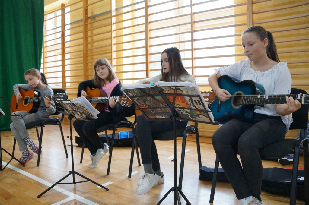 Po przedstawieniu uczeń klasy szóstej złożył wszystkim życzenia, a dziewczęta z koła gitarowego, włączając wszystkich do wspólnego śpiewu, wykonały kolędę „Wśród nocnej ciszy”.
