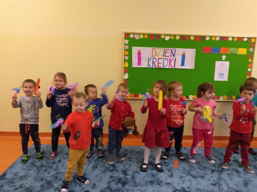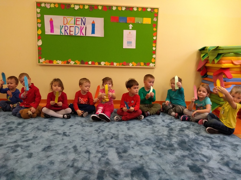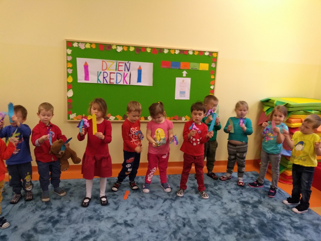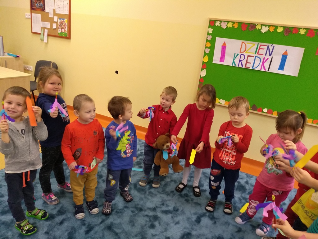 W dniu 20 listopada dzieci z Oddziału Przedszkolnego uczestniczyły w obchodach Dnia Kredki. Wesoła piosenka „Kolorowe kredki” towarzyszyła przedszkolakom podczas zabaw. Kolejnymi zadaniami w tym dniu było ozdobienie papierowej kredki, segregowanie kredek różnego rodzaju, wymyślenie, co robią kredki w pudełku, co powiedziałyby dzieciom, gdyby umiały mówić. Na koniec zajęć każde dziecko otrzymało ozdobioną kolorową kredkę. Powstał też kredkowy teatrzyk. Kolorowe stroje dzieci uświetniły ten dzień.