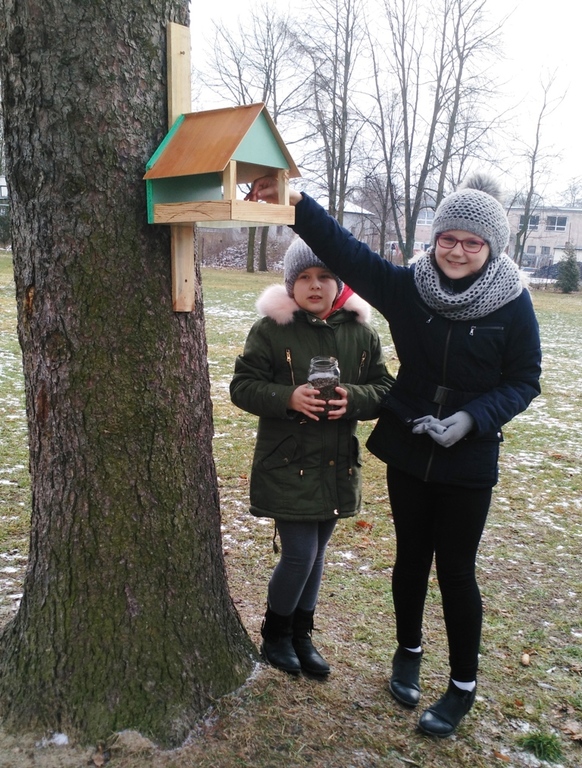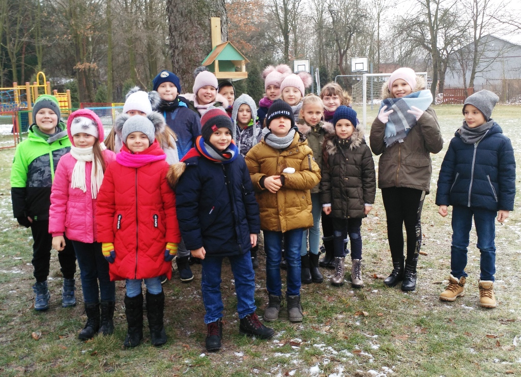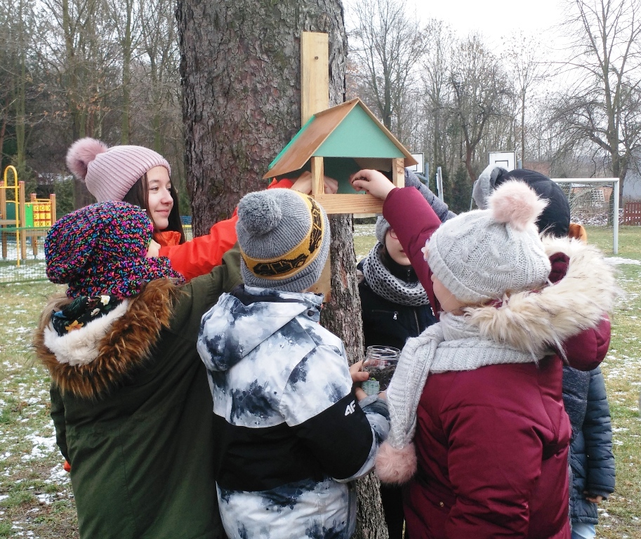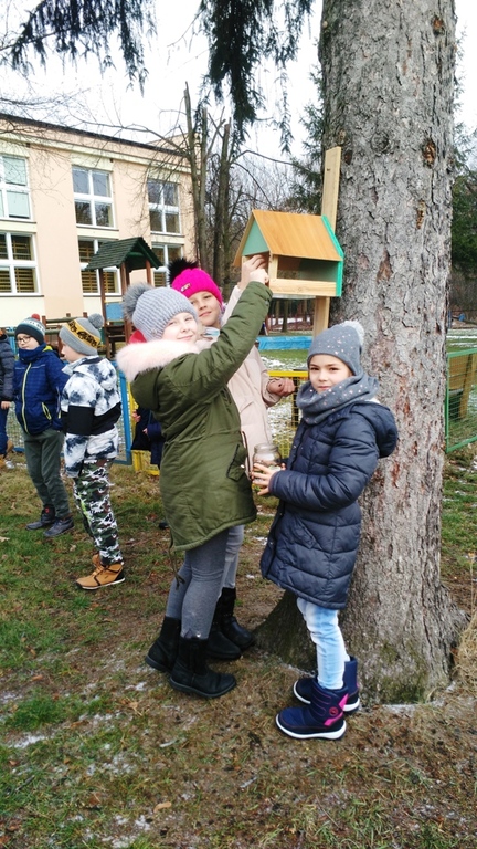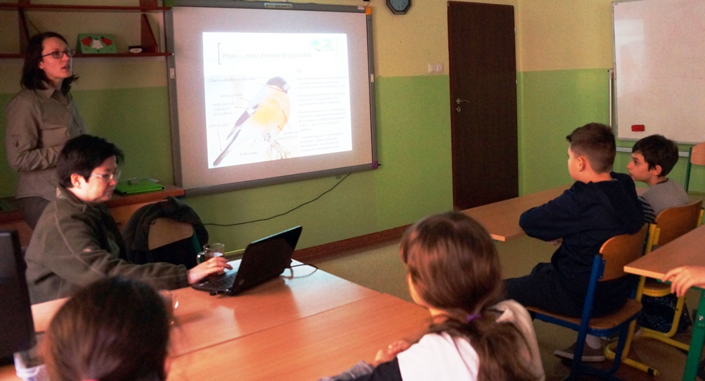Specjalnymi gośćmi były panie Agata Zaborowska i Krystyna Rozensztrauch-Sosnowska z Parku Krajobrazowego Wzniesień Łódzkich, które mówiły o zimowych obserwacjach i właściwym dokarmianiu ptaków oraz o akcji Zimowego Ptakoliczenia. Uczniowie uczyli się rozpoznawania gatunków ptaków, słuchali ich głosów, dzielili się własnymi spostrzeżeniami. Każdy otrzymał ulotkę „Jak mądrze dokarmiać ptaki?” Po zakończeniu prelekcji w pobliżu szkoły dzieci zainstalowały karmnik i napełniły go starannie dobraną karmą. Po powrocie do domów młodzi przyrodnicy wspólnie z rodzicami będą mogli zastanowić się, jakie krzewy posadzić w ogrodzie, by stały się one ozdobą i zimową stołówką dla ptaków na kolejne zimy.