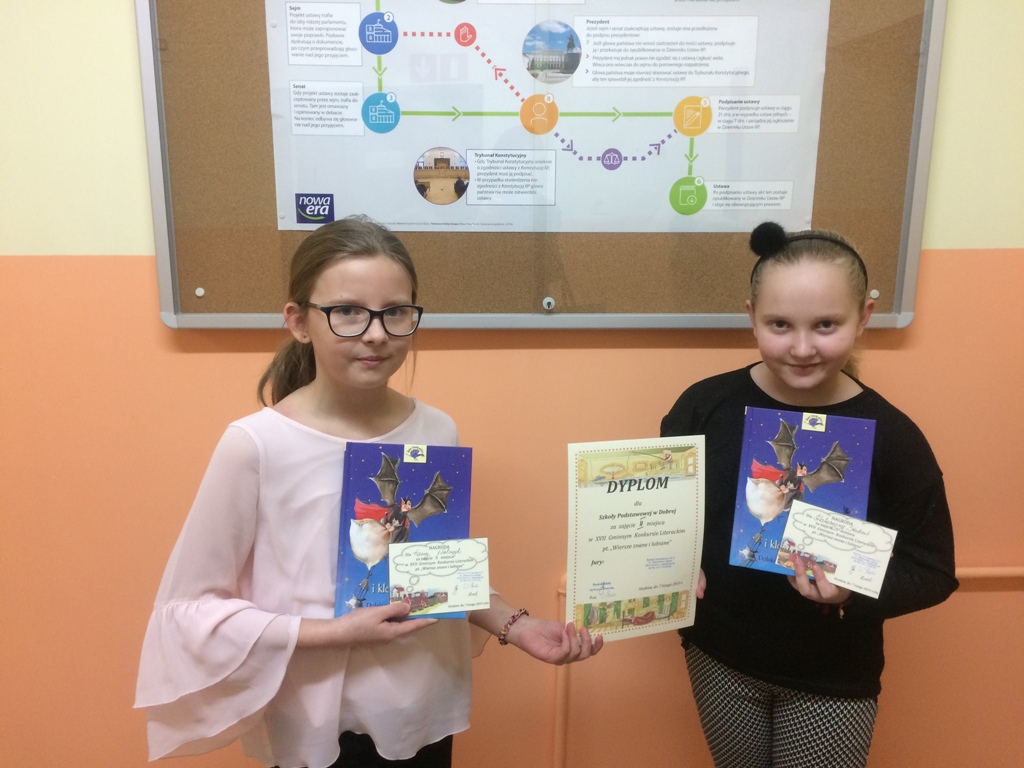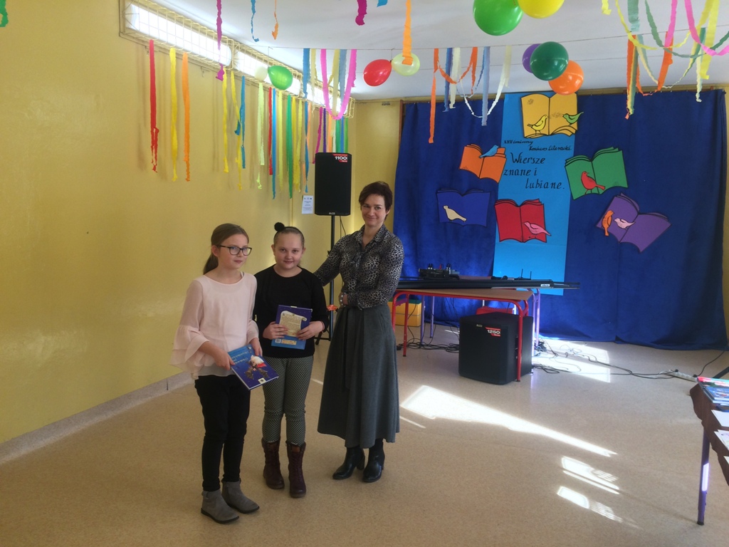 Reprezentantki naszej szkoły, uczennice klasy IV b – Katarzyna Szubert i Hanna Walczyk wykazały się nieprzeciętną znajomością wierszy, takich jak m.in.: Słoń Trąbalski, Lokomotywa, Hipopotam, Gdybym miał dziesięć rąk, Stonka w japonkach i ostatecznie zajęły II miejsce.