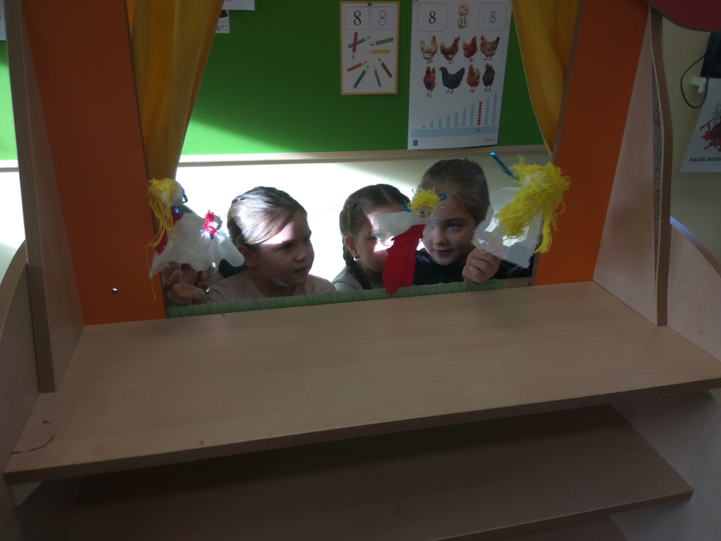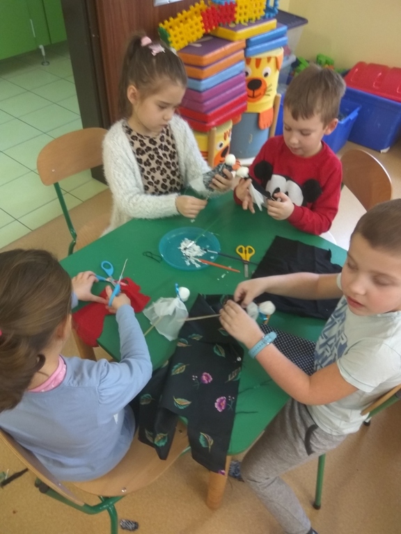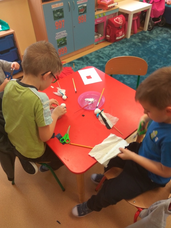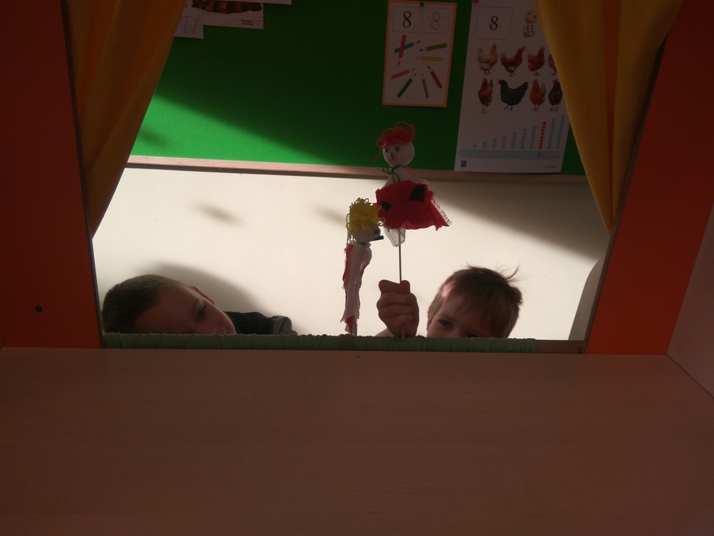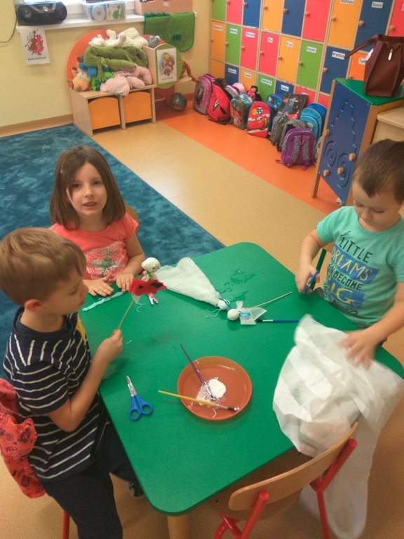 Następnie wykonały swoje teatralne lalki, aby następnie w grupach wymyślać bajkę i przedstawić ją swoim kolegom. Dzieci podczas pracy bardzo dobrze się bawiły, zdobywając jednocześnie nową wiedze i umiejętności.