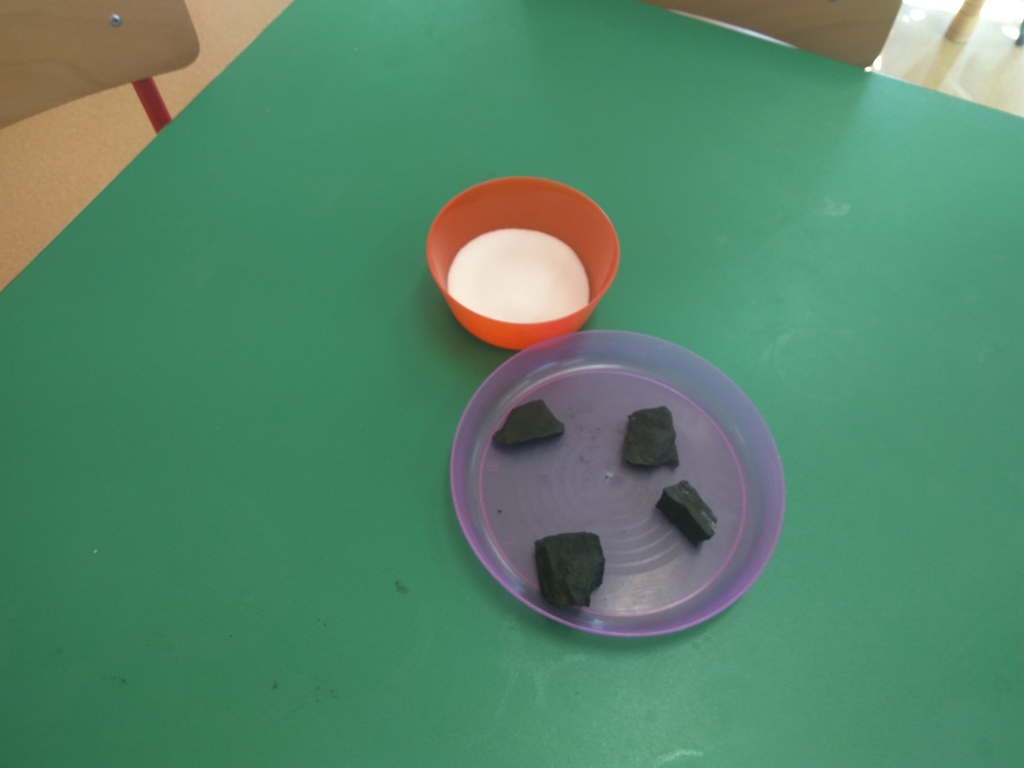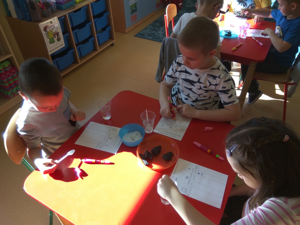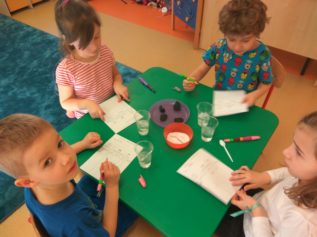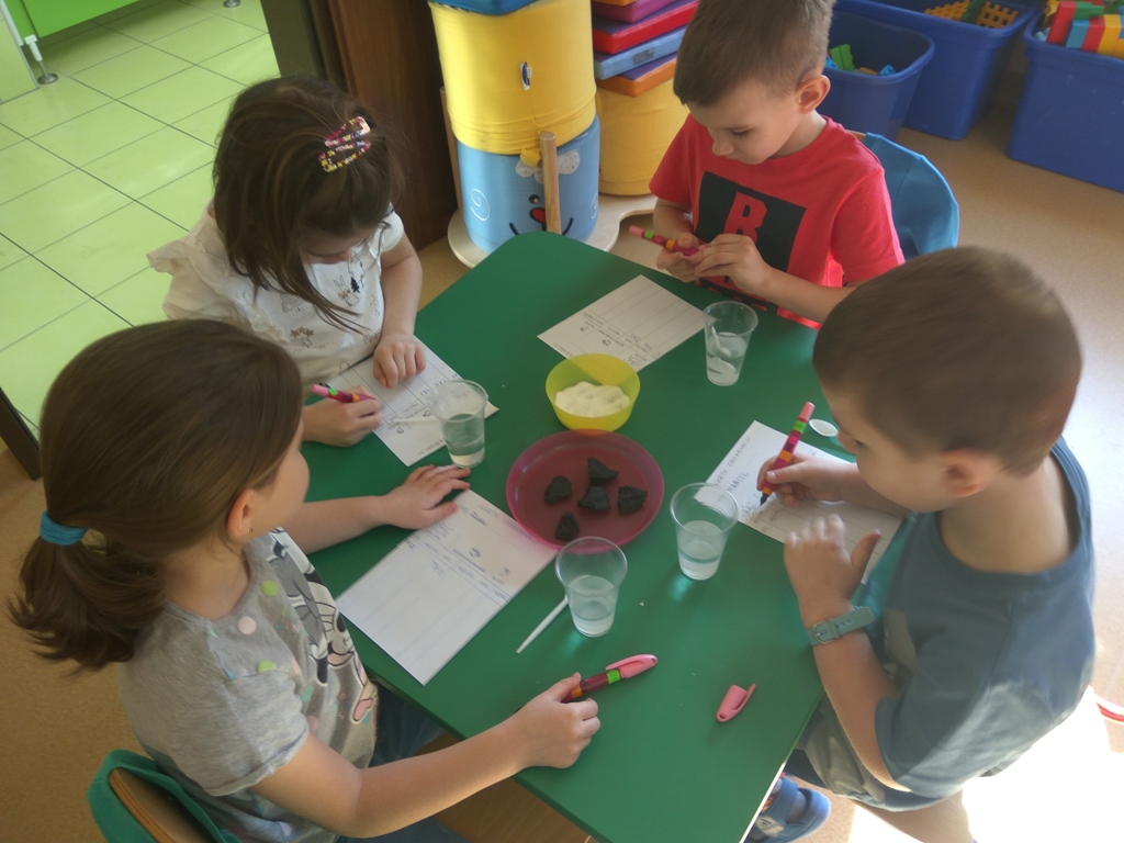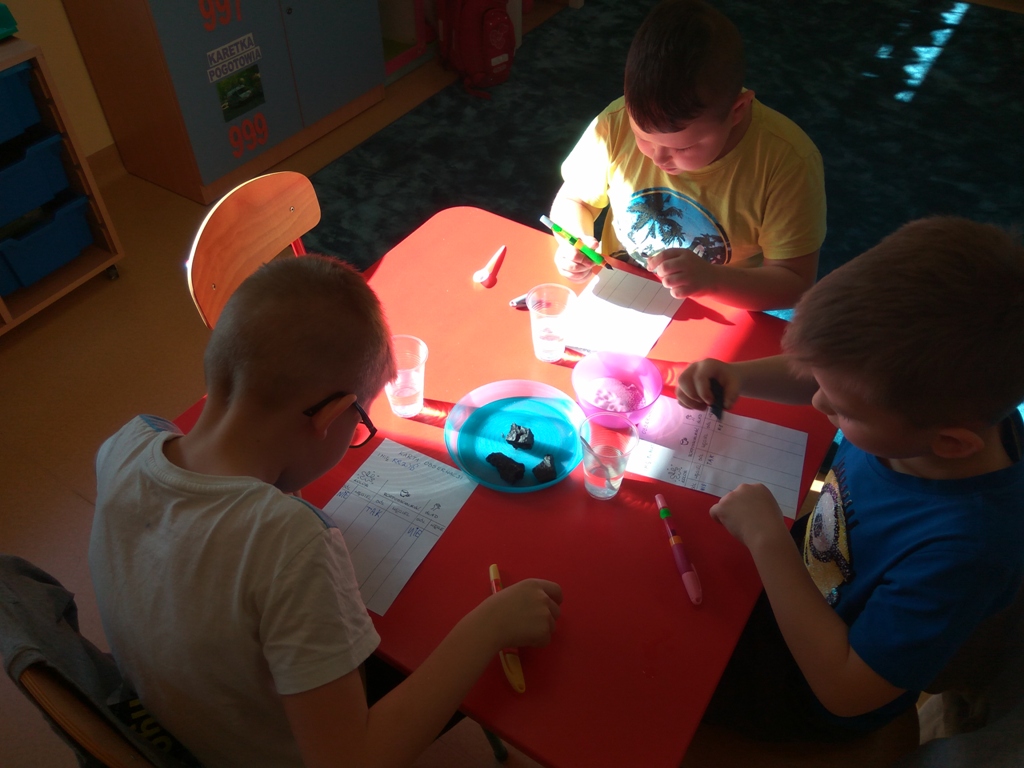Na zdjęciach można zobaczyć, jak dzieci badają właściwości soli i węgla: rozpuszczalność w wodzie tych substancji, ich kolor oraz to, czy zostawiają ślad na skórze.