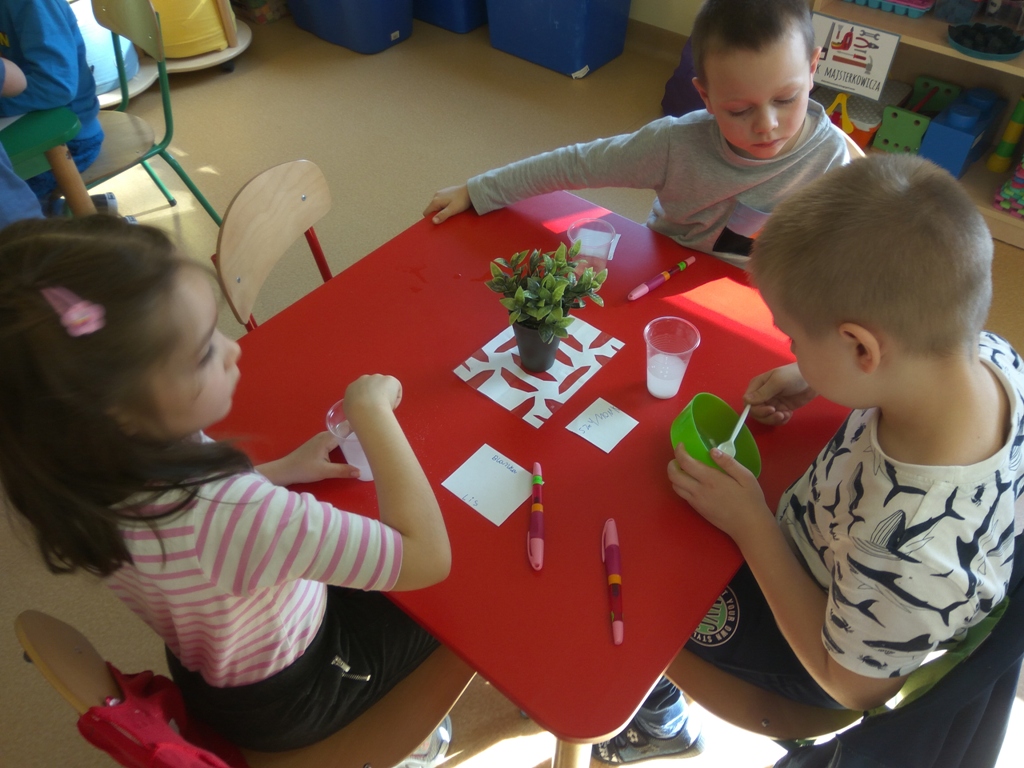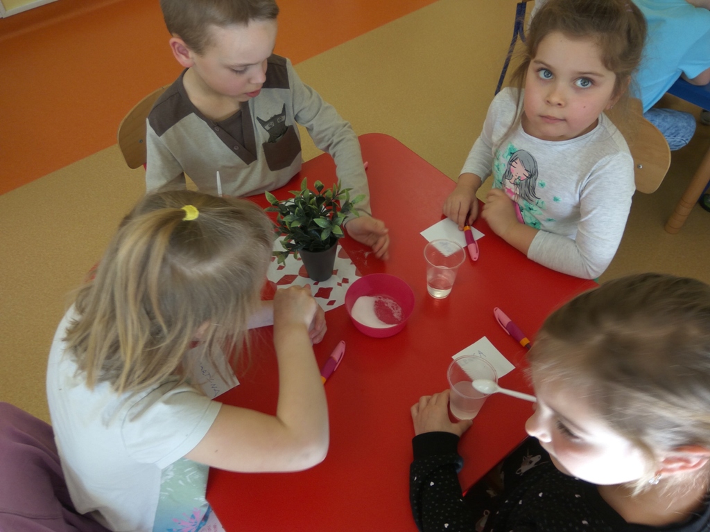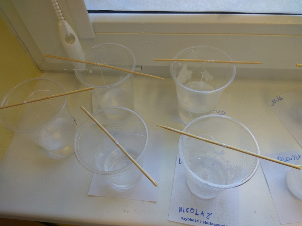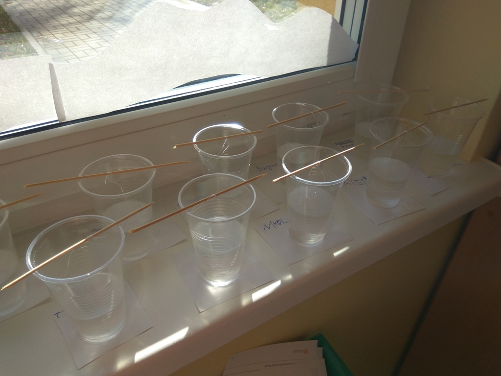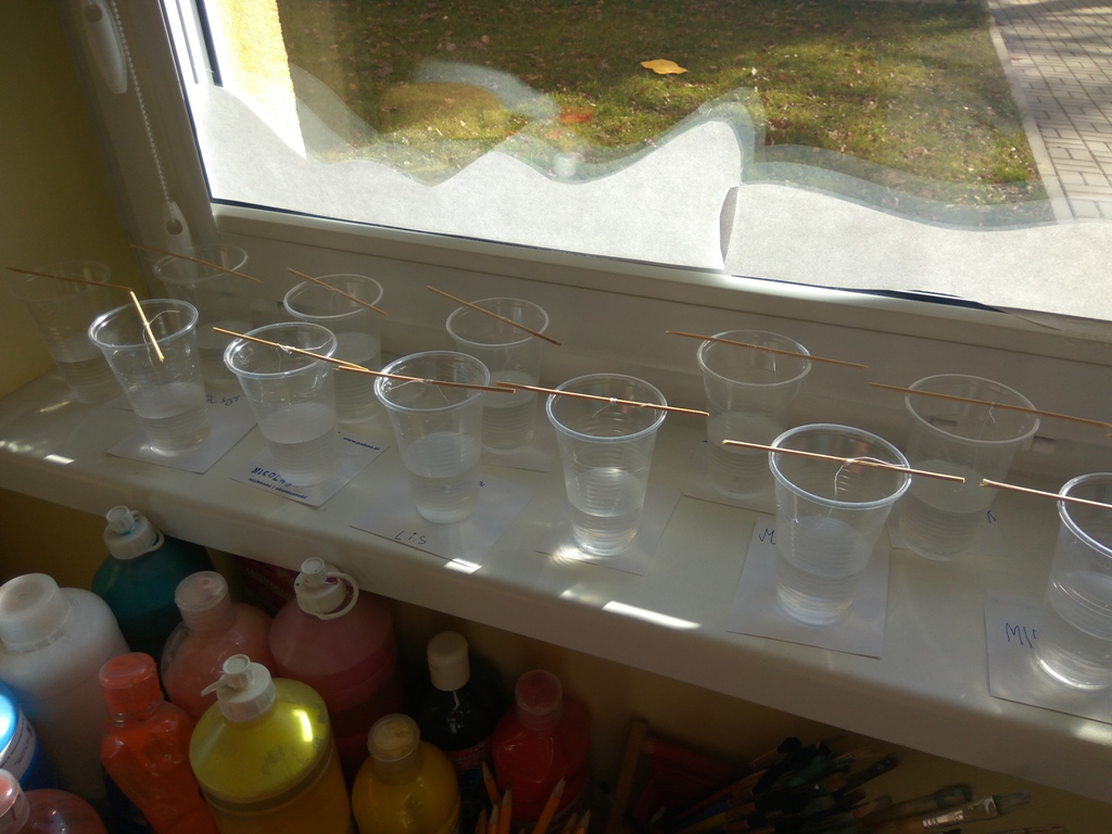 Dzieci, bawiąc się w naukowców, przygotowywały roztwór nasycony solą. Przez kilka dni obserwowały zmiany zachodzące na nitkach – pod wpływem parowania wody utworzyły się kryształki soli.