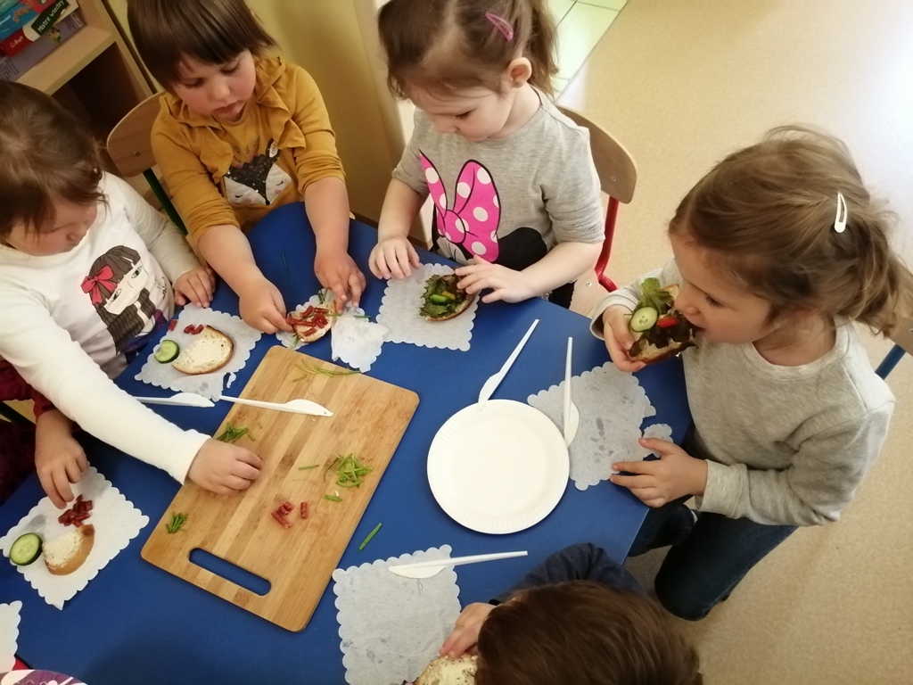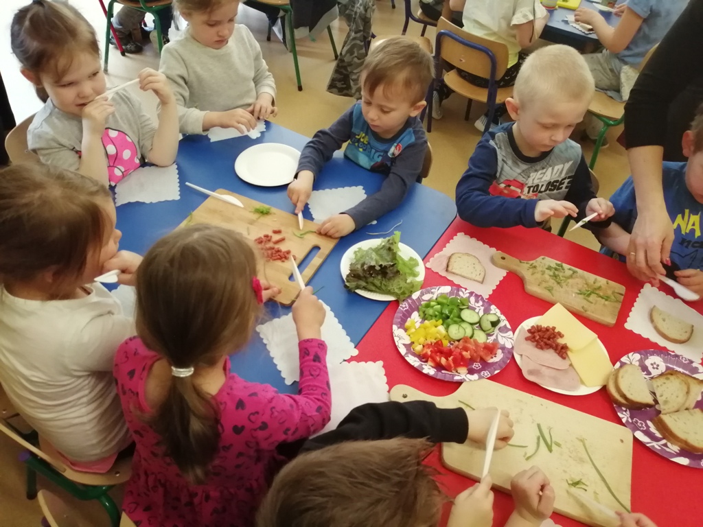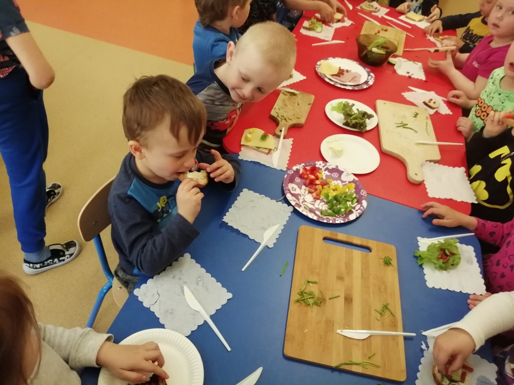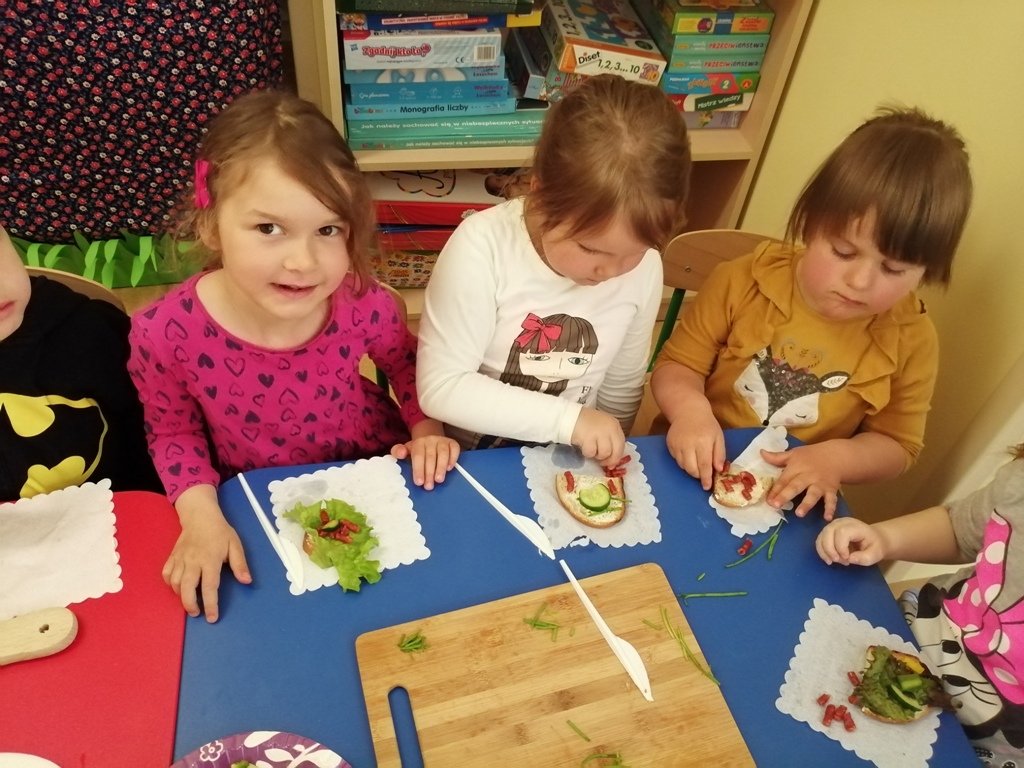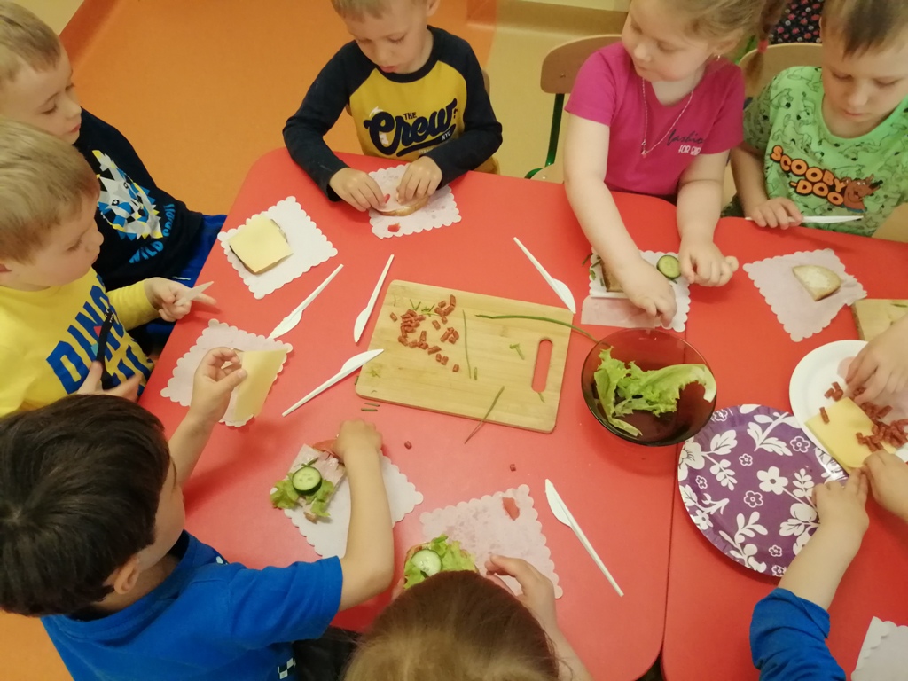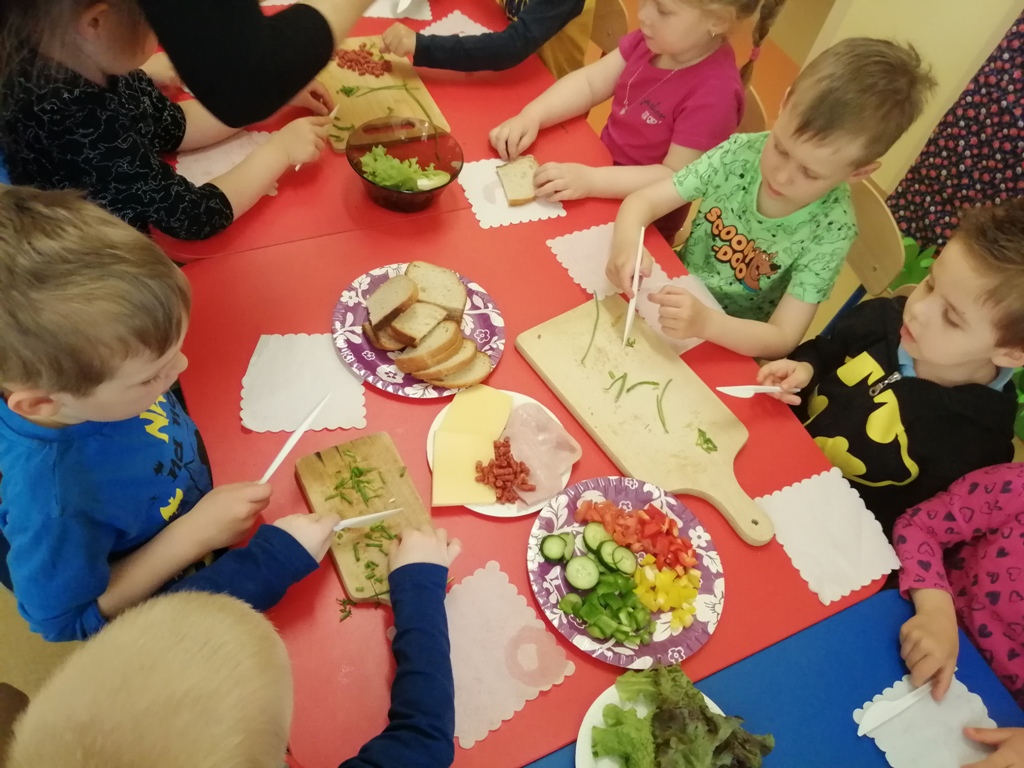 Własnoręcznie wykonywały kolorowe kanapki. Przed krojeniem umyły wszystkie produkty, a następnie kroiły warzywa: pomidora, paprykę, ogórka oraz wędliny. Następnie smarowały chlebek masełkiem, kładły sałatę, szynkę, ser i pokrojone warzywa. Niektóre dzieci robiły wesołe minki na kanapkach.