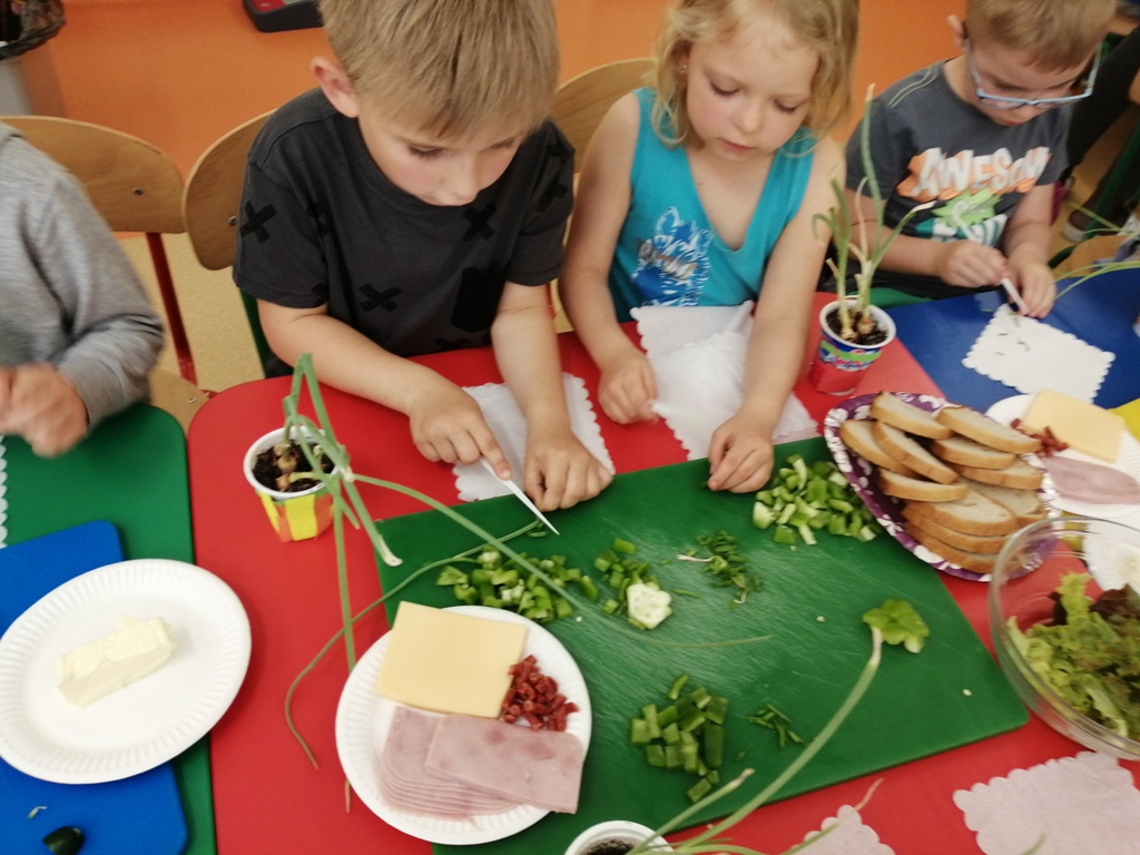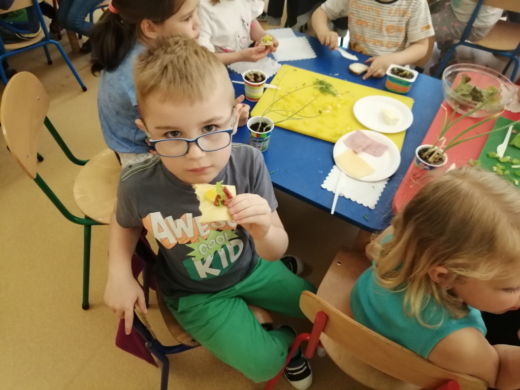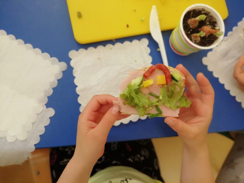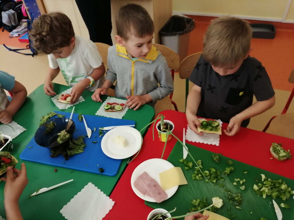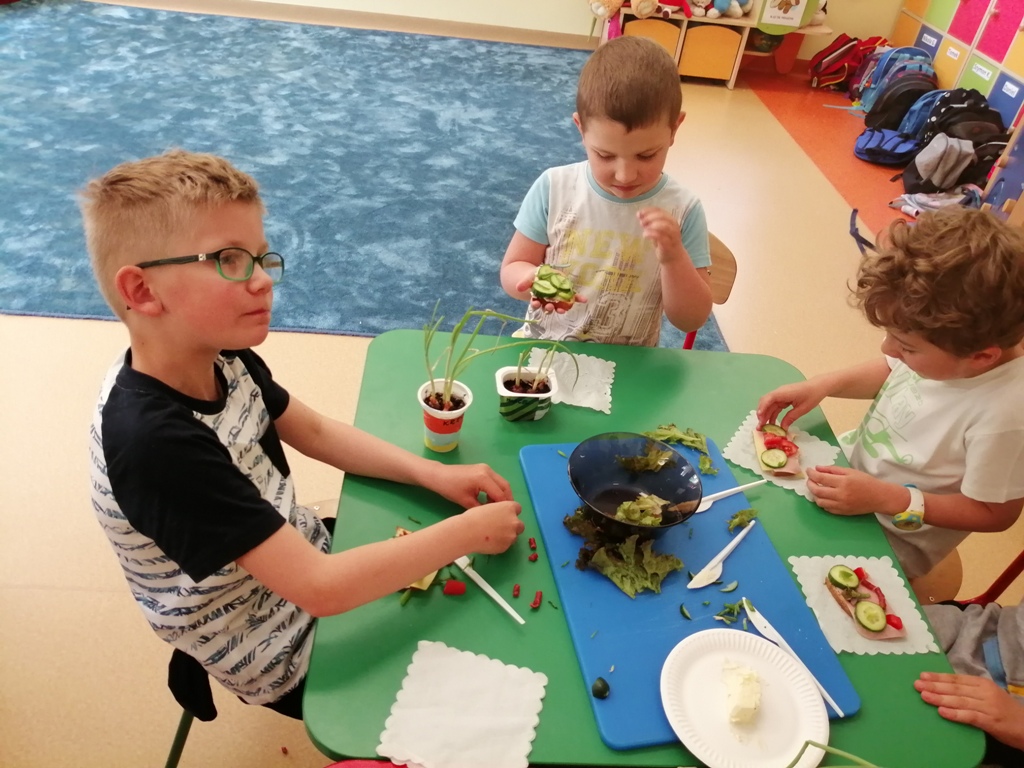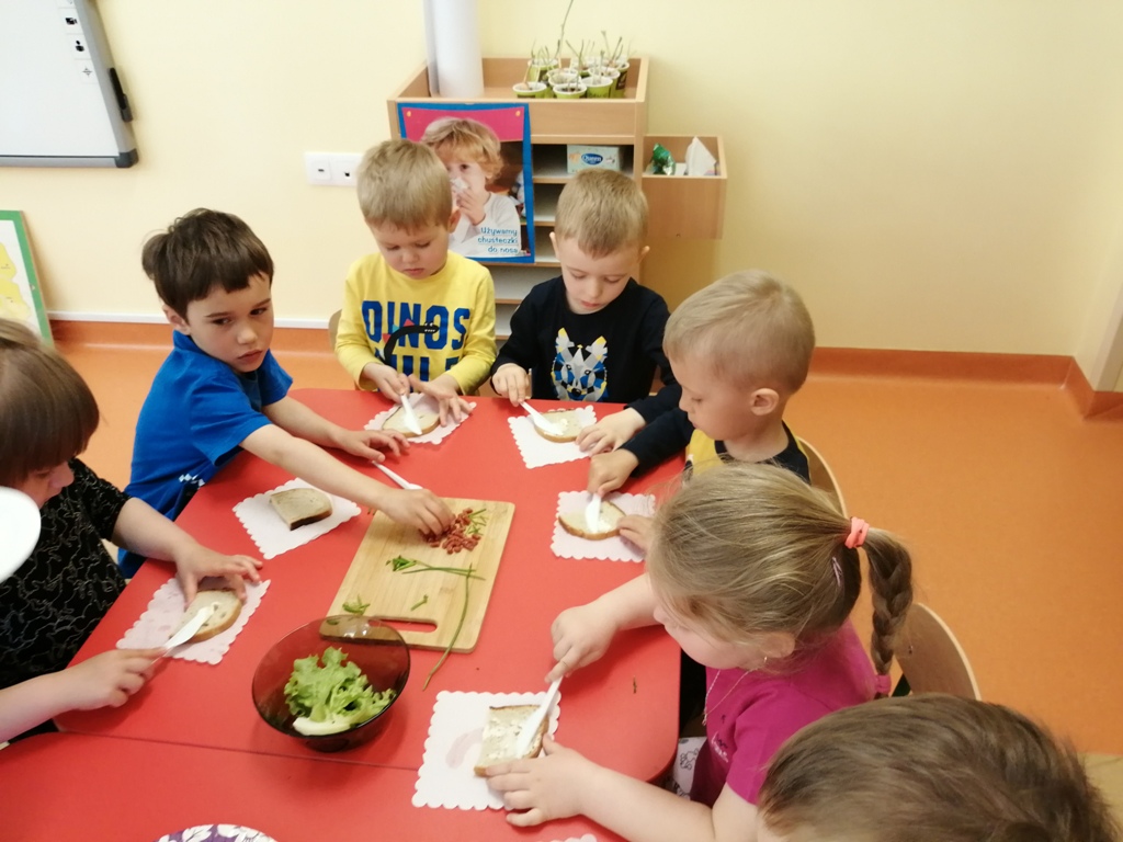 Własnoręcznie wykonywały kolorowe kanapki. Przed krojeniem umyły wszystkie produkty, a następnie kroiły warzywa: pomidora, paprykę, ogórka oraz wędliny. Następnie smarowały chlebek masełkiem, kładły sałatę, szynkę, ser i pokrojone warzywa. Niektóre dzieci robiły wesołe minki na kanapkach.