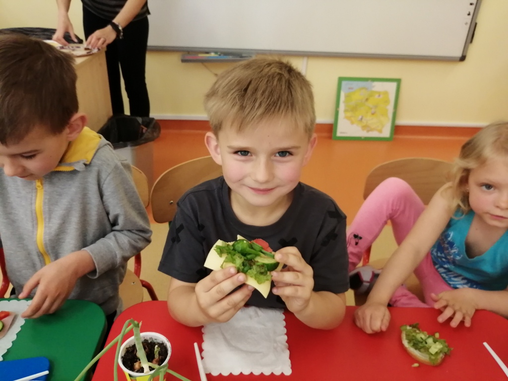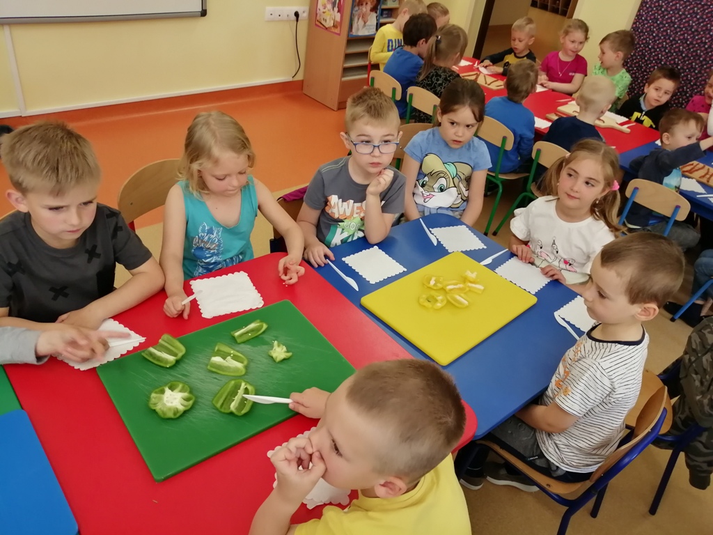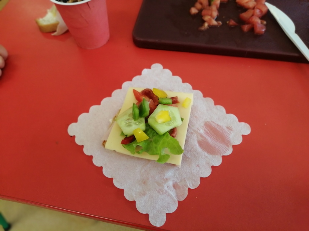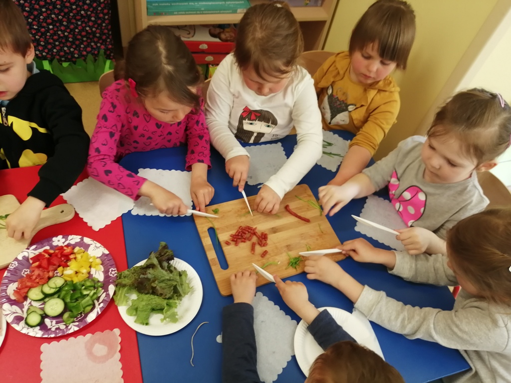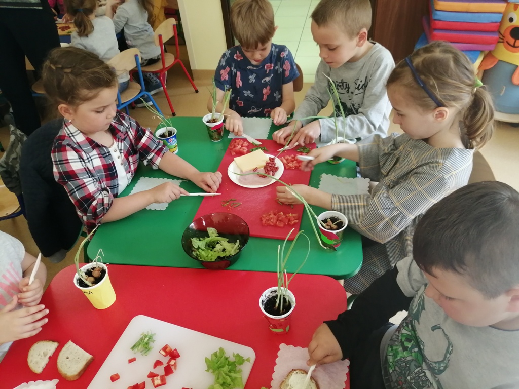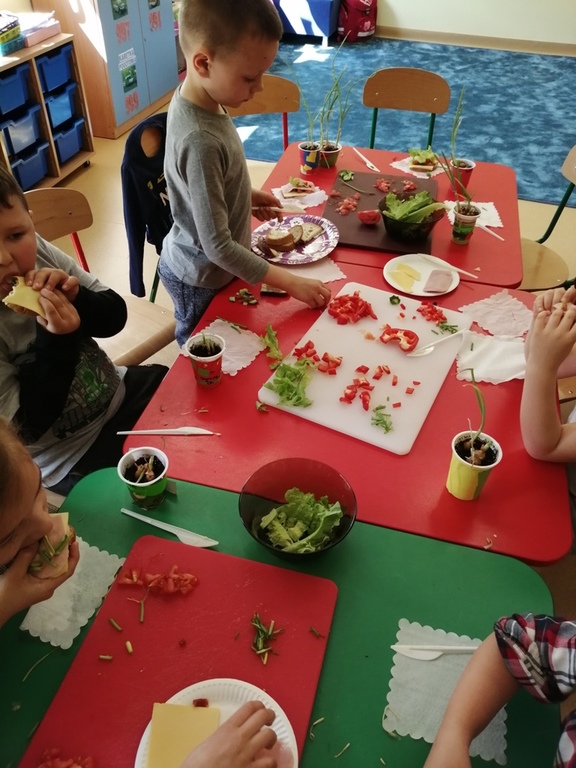 Własnoręcznie wykonywały kolorowe kanapki. Przed krojeniem umyły wszystkie produkty, a następnie kroiły warzywa: pomidora, paprykę, ogórka oraz wędliny. Następnie smarowały chlebek masełkiem, kładły sałatę, szynkę, ser i pokrojone warzywa. Niektóre dzieci robiły wesołe minki na kanapkach.