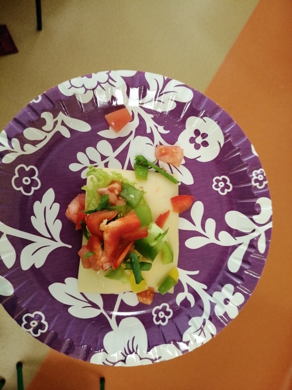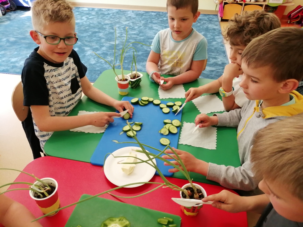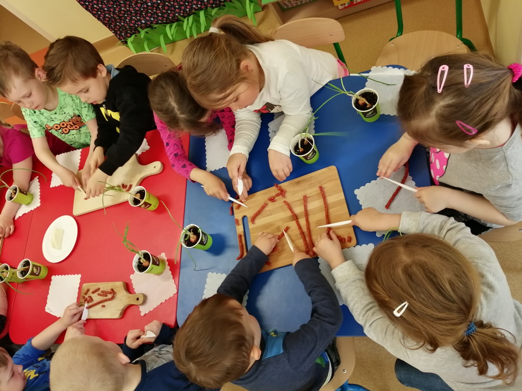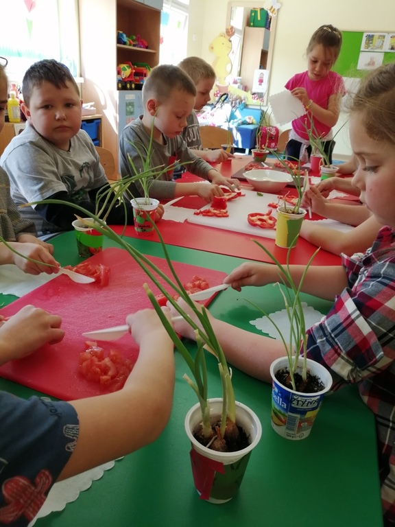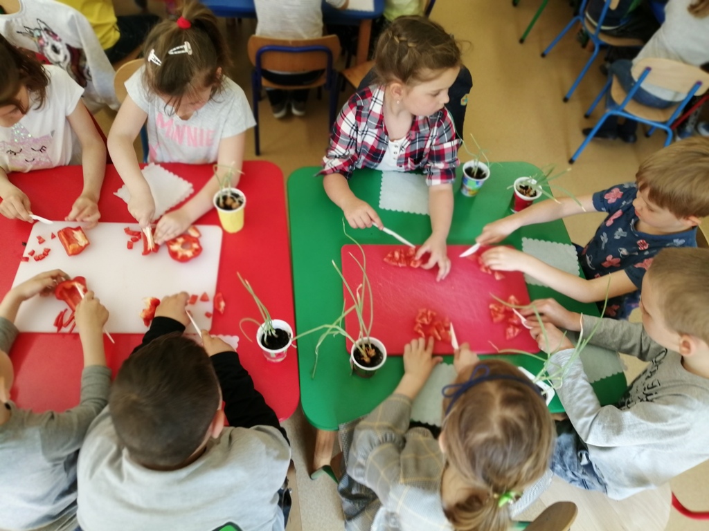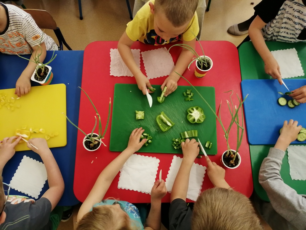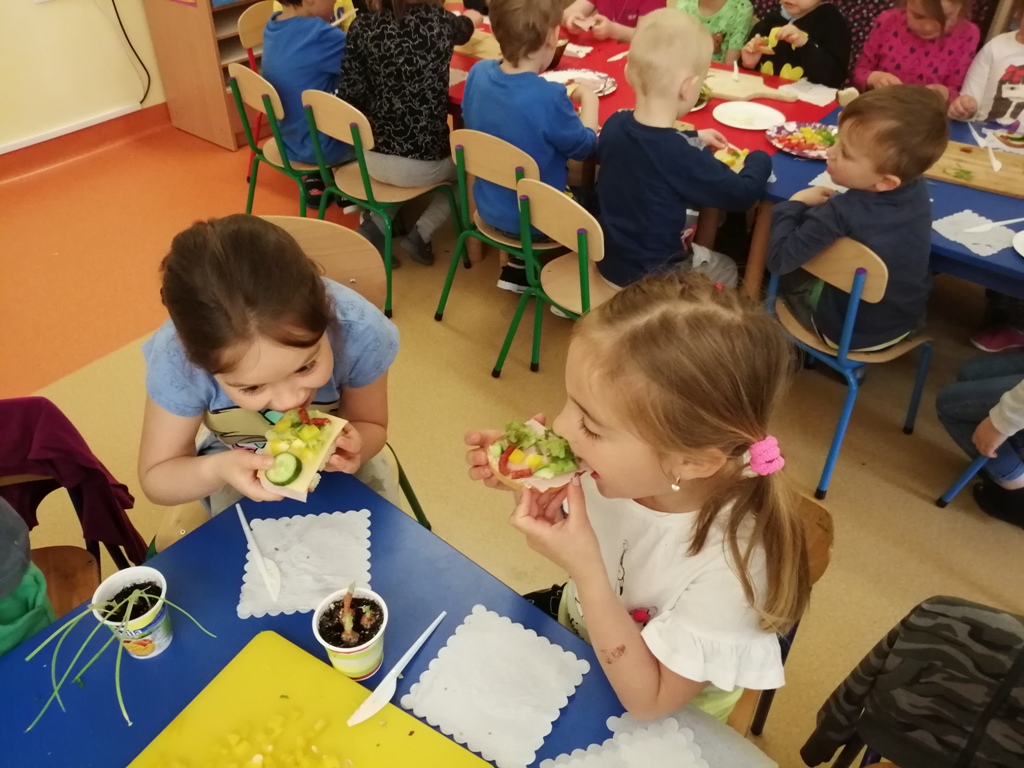 Własnoręcznie wykonywały kolorowe kanapki. Przed krojeniem umyły wszystkie produkty, a następnie kroiły warzywa: pomidora, paprykę, ogórka oraz wędliny. Następnie smarowały chlebek masełkiem, kładły sałatę, szynkę, ser i pokrojone warzywa. Niektóre dzieci robiły wesołe minki na kanapkach.