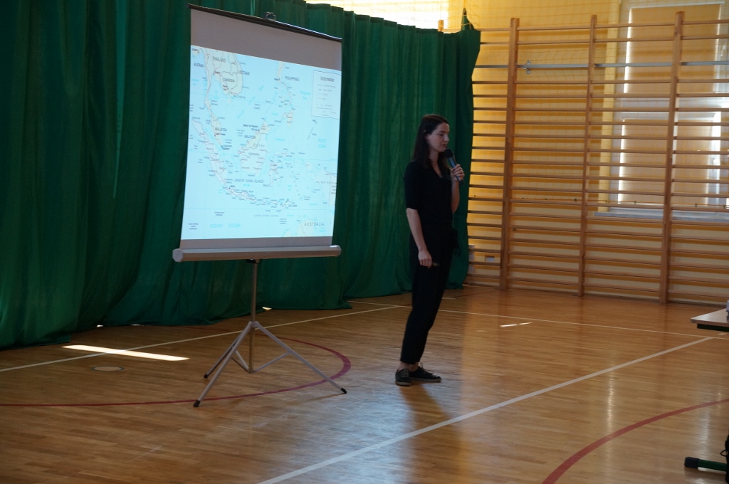 W czasie spotkania uczniowie mieli okazję poznać życie i zwyczaje mieszkańców Indonezji oraz Mongolii. W tok opowieści zostały wplecione wspomnienia z niezwykłych przygód, jakie przeżyła podróżniczka samotnie wędrując po świecie. Barwna historia była uzupełniona pięknymi zdjęciami z miejsc, które odwiedziła pani Jaklewicz.