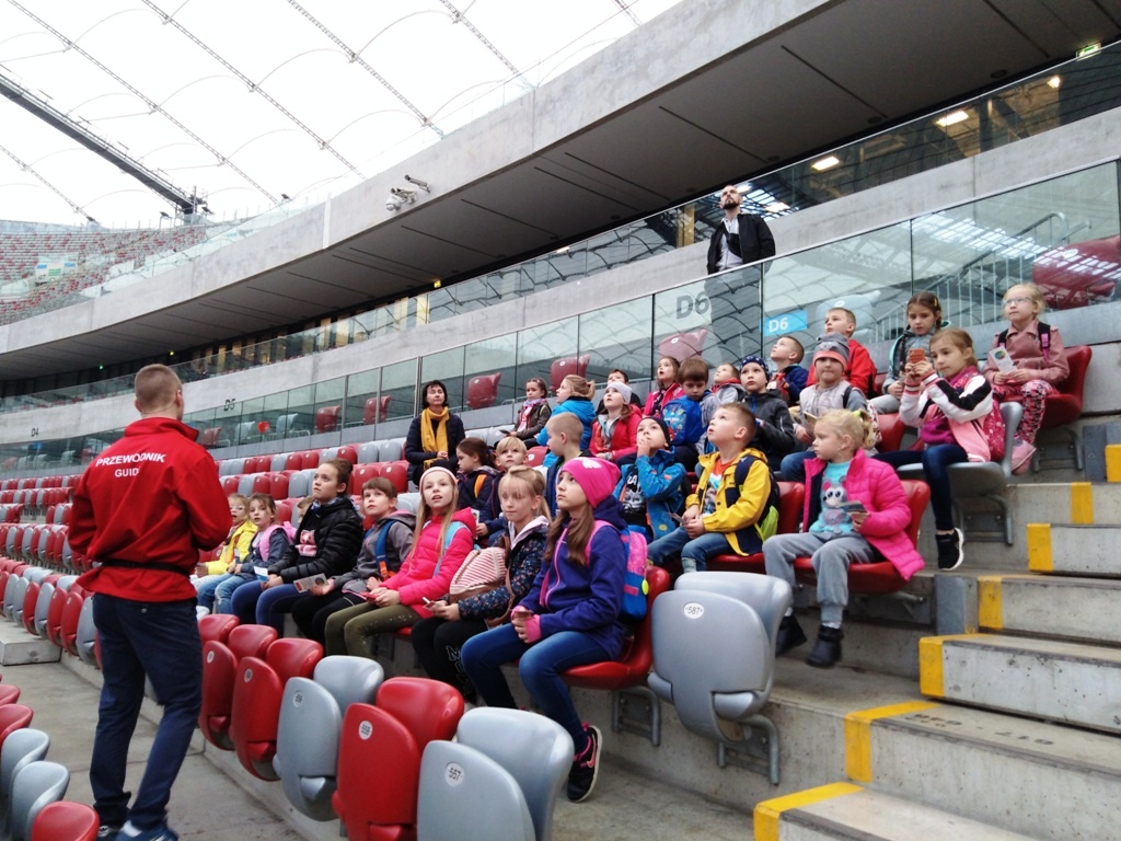 23 października uczniowie z klas I - III wraz z wychowawczyniami udali się na wycieczkę do Warszawy. Pierwszą z atrakcji był Stadion Narodowy. Z uwagi na pasje piłkarskie dzieci wizyta na tym stadionie była spełnieniem marzeń. To miejsce naprawdę robi wrażenie! Pod opieką miłego pana przewodnika uczniowie oglądali m.in. boisko, szatnie sportowców, miejsce dla dziennikarzy. Siedząc na ogromnych trybunach, mogli poczuć się jak prawdziwi kibice.