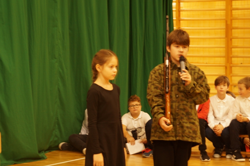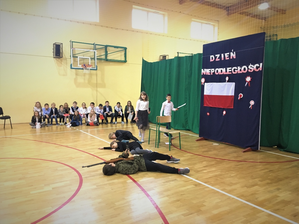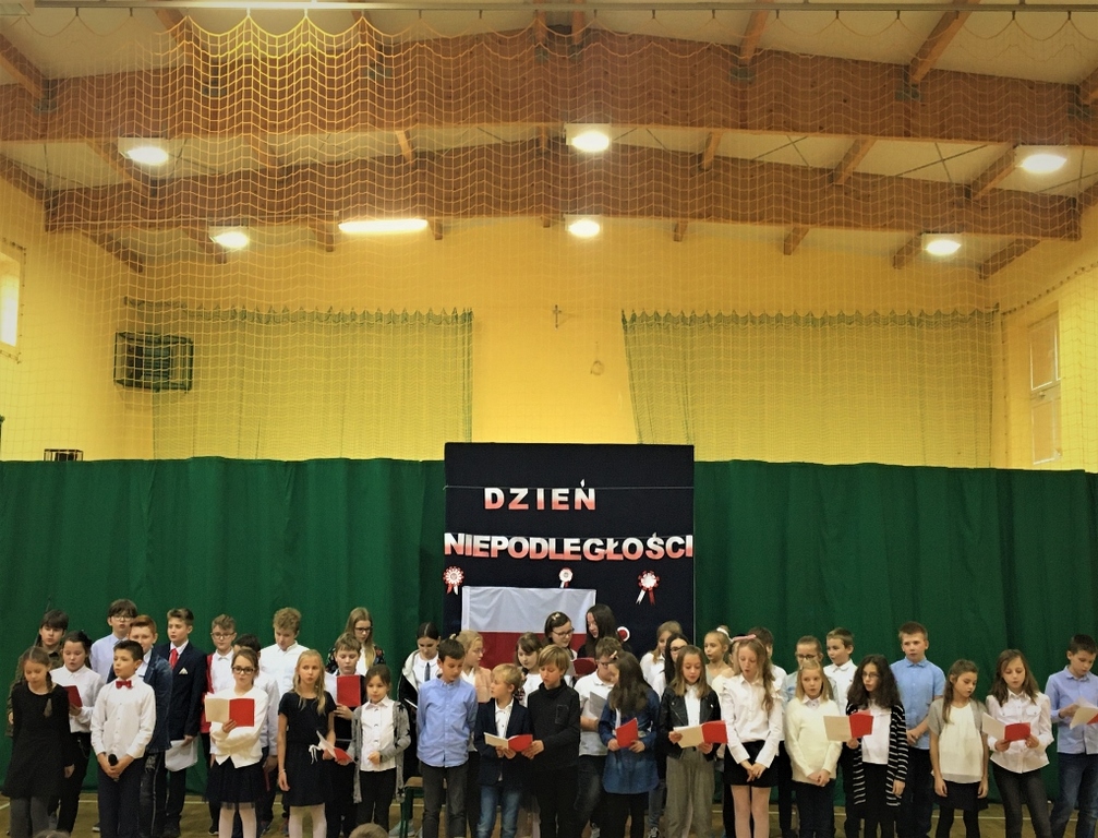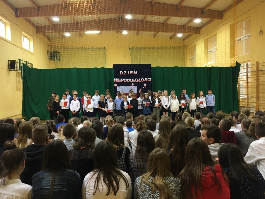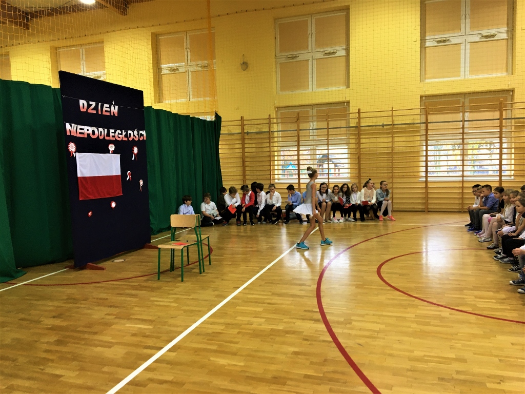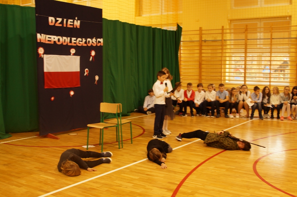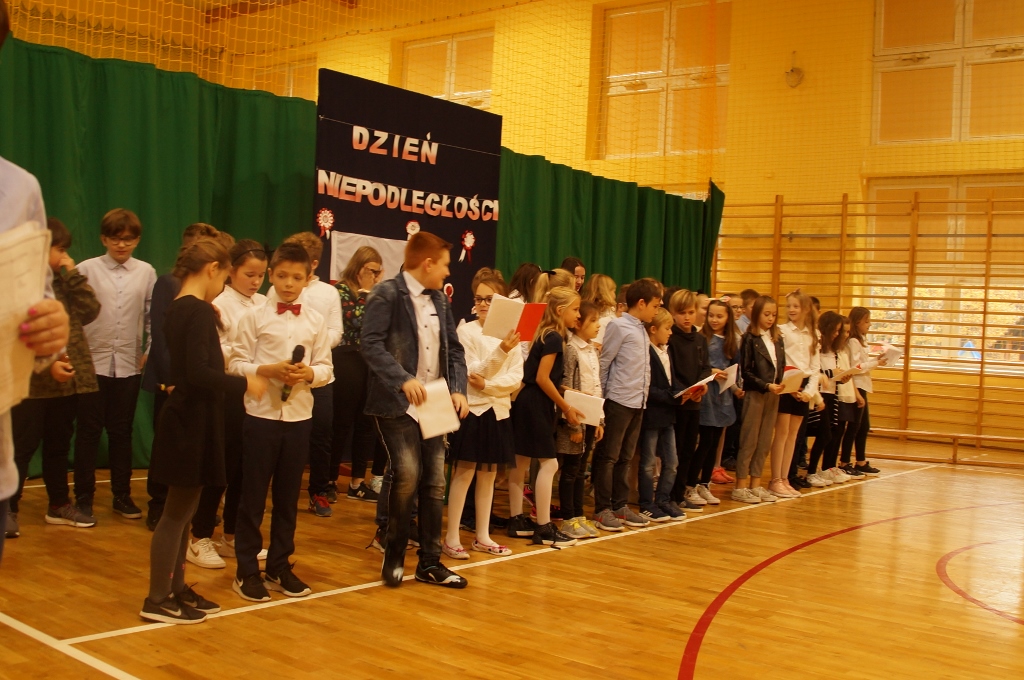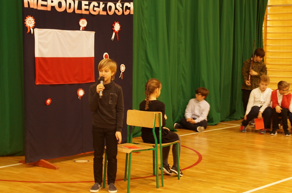 Uroczystość rozpoczęła się od odśpiewania hymnu narodowego. Następnie piątoklasiści wykonali piosenkę pt. „Wolność - kocham i rozumiem”, nawiązującą do Narodowego Święta Niepodległości. Podczas uroczystości zebrani obejrzeli także krótki montaż słowno-muzyczny o tematyce historycznej oraz wysłuchali pieśni patriotycznych w przepięknym wykonaniu uczniów z klas Va i kl. Vb.