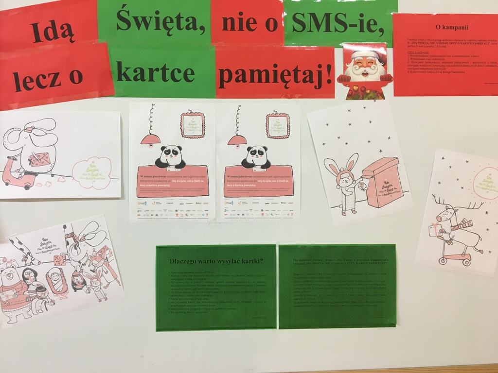 W 2019 roku nasza szkoła dołączyła do ogólnopolskiego projektu realizowanego przez Fundację Dbam o Mój Z@sięg. Do głównych celów kampanii „Idą Święta, nie o SMS-ie, lecz o kartce pamiętaj!” należą dążenie do wzmocnienia bezpośrednich relacji rodzinnych i ograniczenie użytkowania mediów cyfrowych w okresie świąt Bożego Narodzenia. Akcja wpisuje się w profilaktykę e-uzależnień i jest zgodna z podstawowymi kierunkami realizacji polityki oświatowej państwa w roku szkolnym 2019/2020 określonymi przez MEN.
