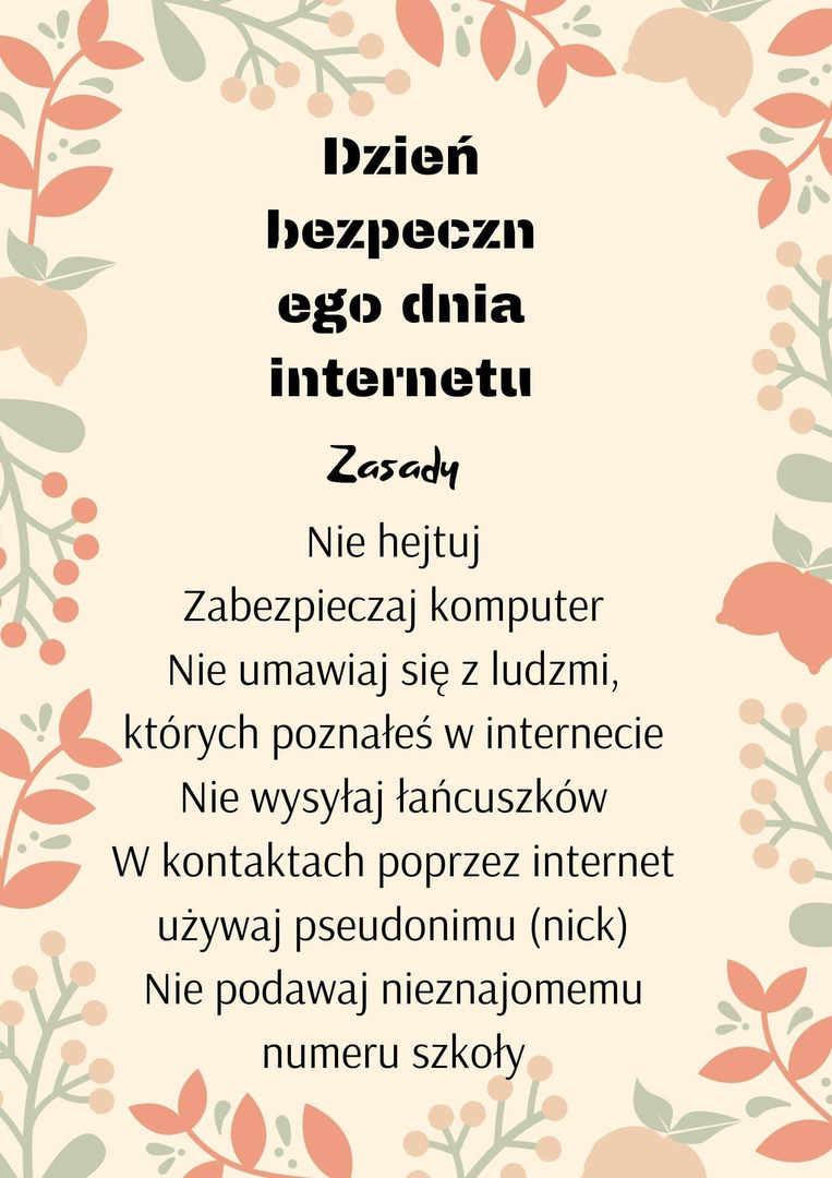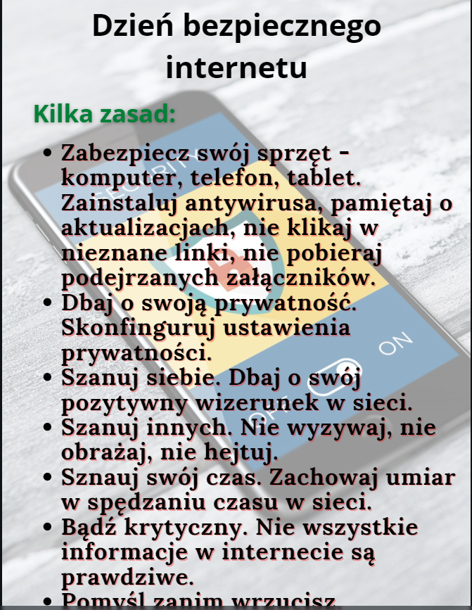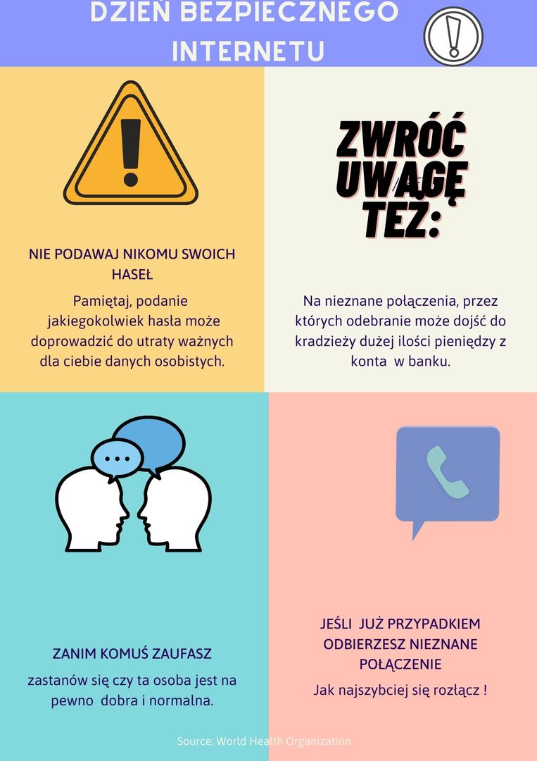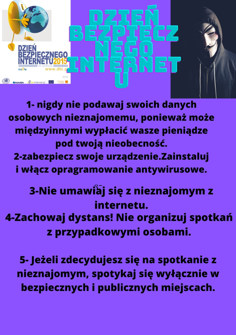 Ten dzień jest okazją do refleksji nad własnym bezpieczeństwem w sieci. Ważne jest przestrzeganie zasad bezpieczeństwa w przestrzeni wirtualnej, ale nie można zapominać o właściwym zorganizowaniu sobie czasu poza nią. Zwłaszcza w okresie nauki w trybie zdalnym, po zakończeniu lekcji, należy wybrać taki rodzaj aktywności, który nie będzie wiązał się z obsługą komputera i używaniem Internetu.